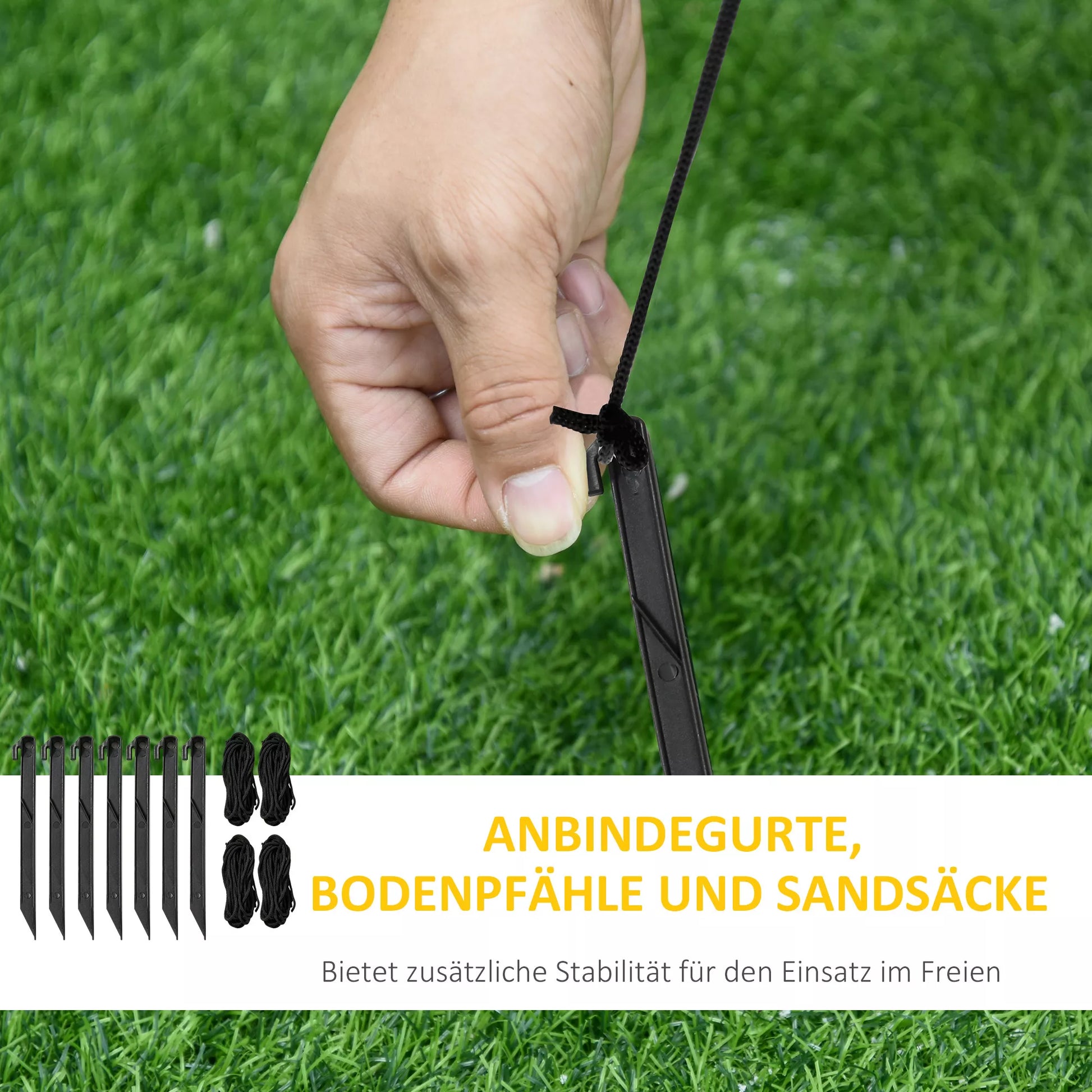 - ✔ 5 kuoliukai į žemę, 2 virvės ir 3 smėlio maišai užtikrina stabilumą ir tvirtą stovėjimą