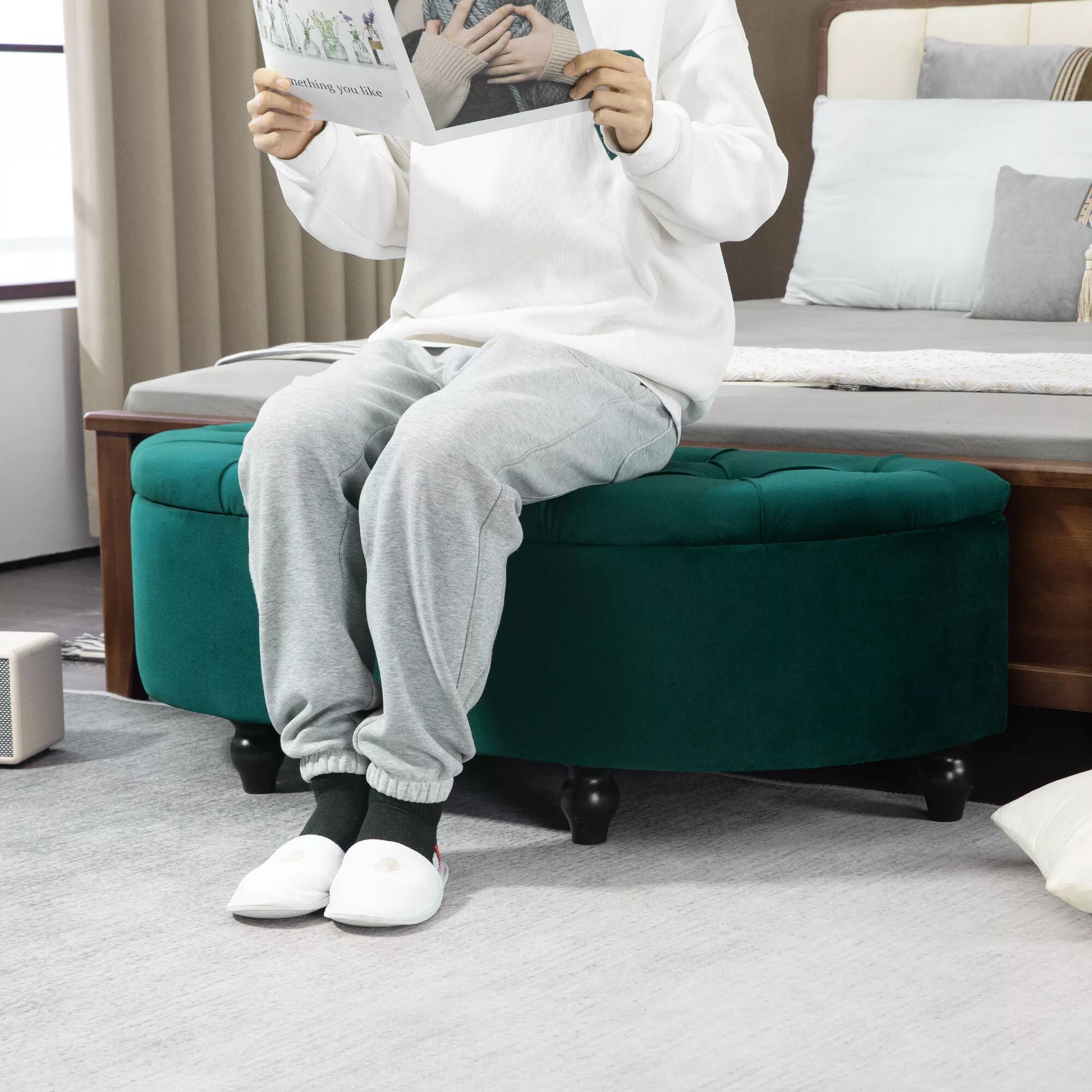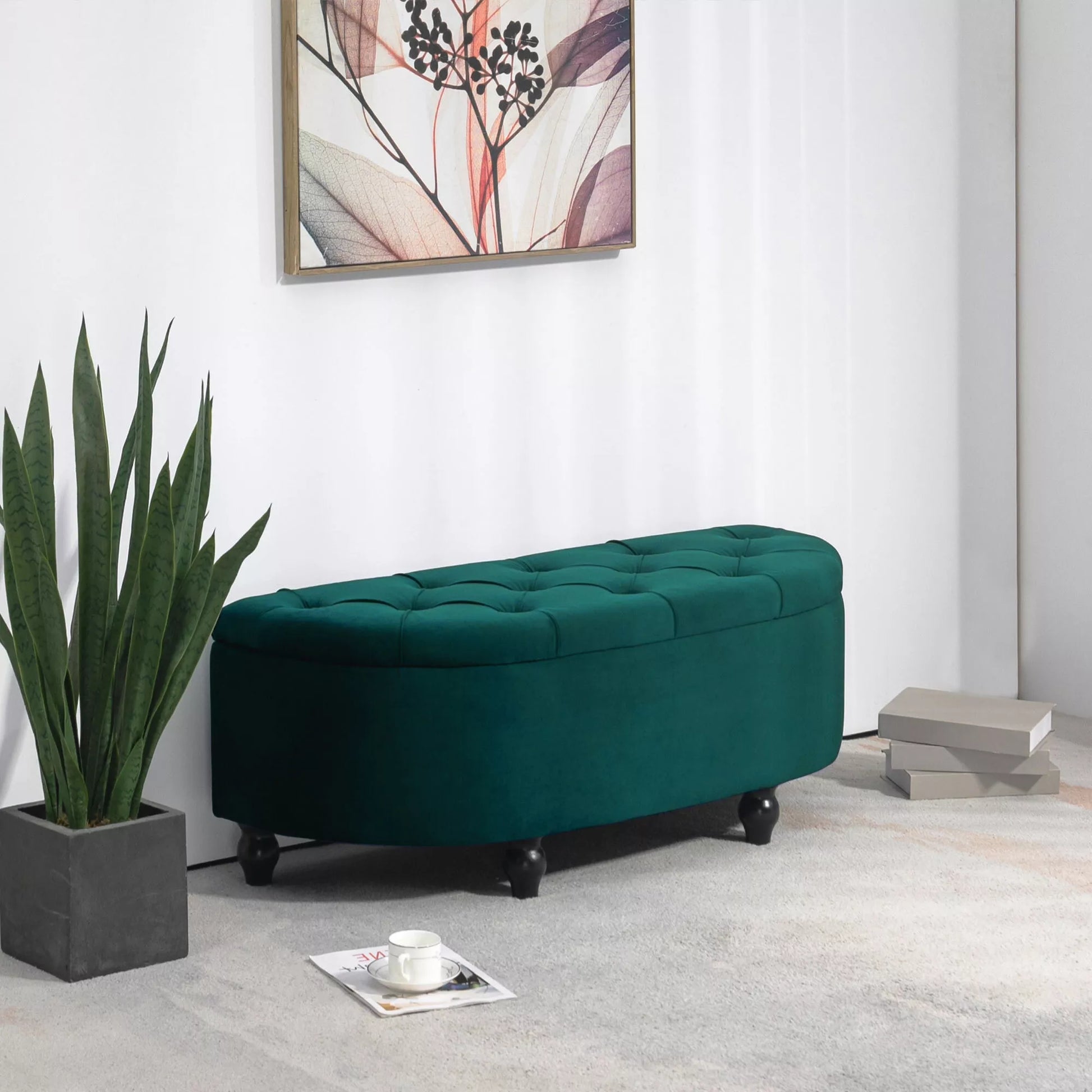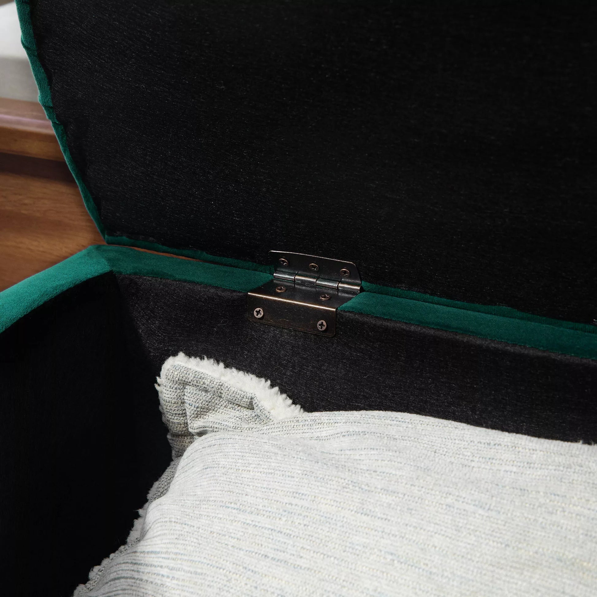 Patirkite nesenstančią eleganciją su mūsų išskirtine pufa su daiktadėže. Meniškai apdorotos juodo kaučiukmedžio kojelės ir prašmatnus tamsiai žalios spalvos aksominis apmušalas suteiks jūsų svetainei, miegamajam, persirengimo kambariui ar biurui klasikinio prašmatnumo dvelksmo. Naudokite didelę daiktadėžę patogiai laikyti pledus, pagalves, nuotolinio valdymo pultelius ar žurnalus. Ši suoliukas su daiktadėže yra ne tik stilingas baldas, bet ir praktiškas pagalbininkas tvarkai jūsų namuose palaikyti.