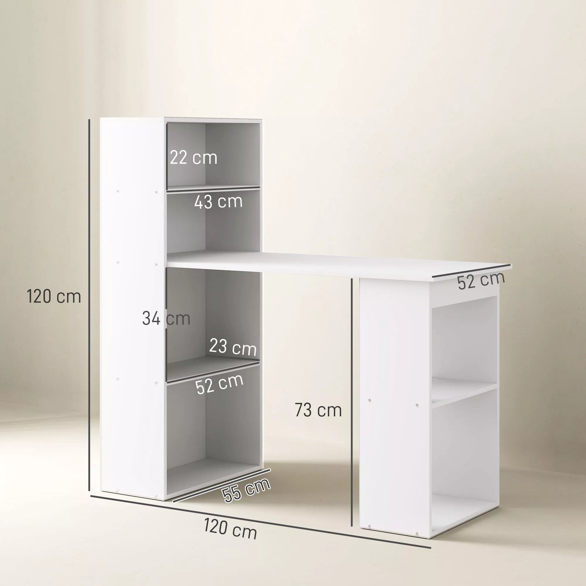 HOMCOM rašomasis stalas dėl savo kompaktiškų matmenų yra tikras erdvės taupymo stebuklas. Integruota lentyna su keturiomis nišomis vienoje pusėje ir dviem atviromis nišomis kitoje pusėje suteikia daug vietos daiktams laikyti ir palaikyti tvarką. Darbo paviršius yra didelis ir suteikia pakankamai vietos nešiojamajam kompiuteriui, papildomam monitoriui ar kitiems biuro reikmenims. Paprastas dizainas lengvai dera prie interjero.