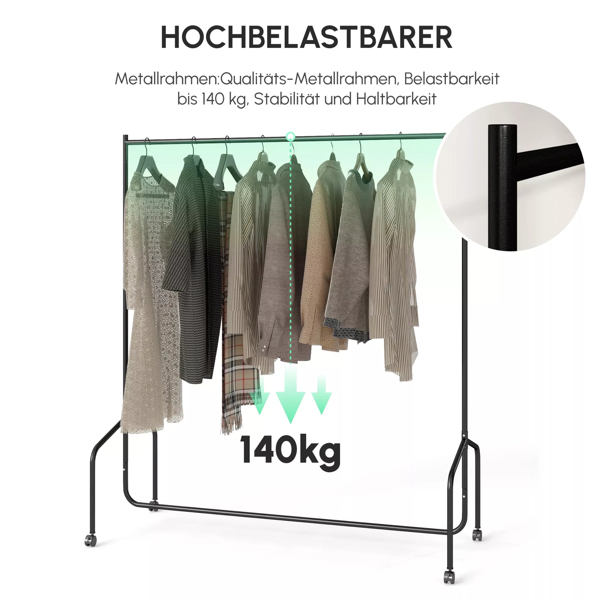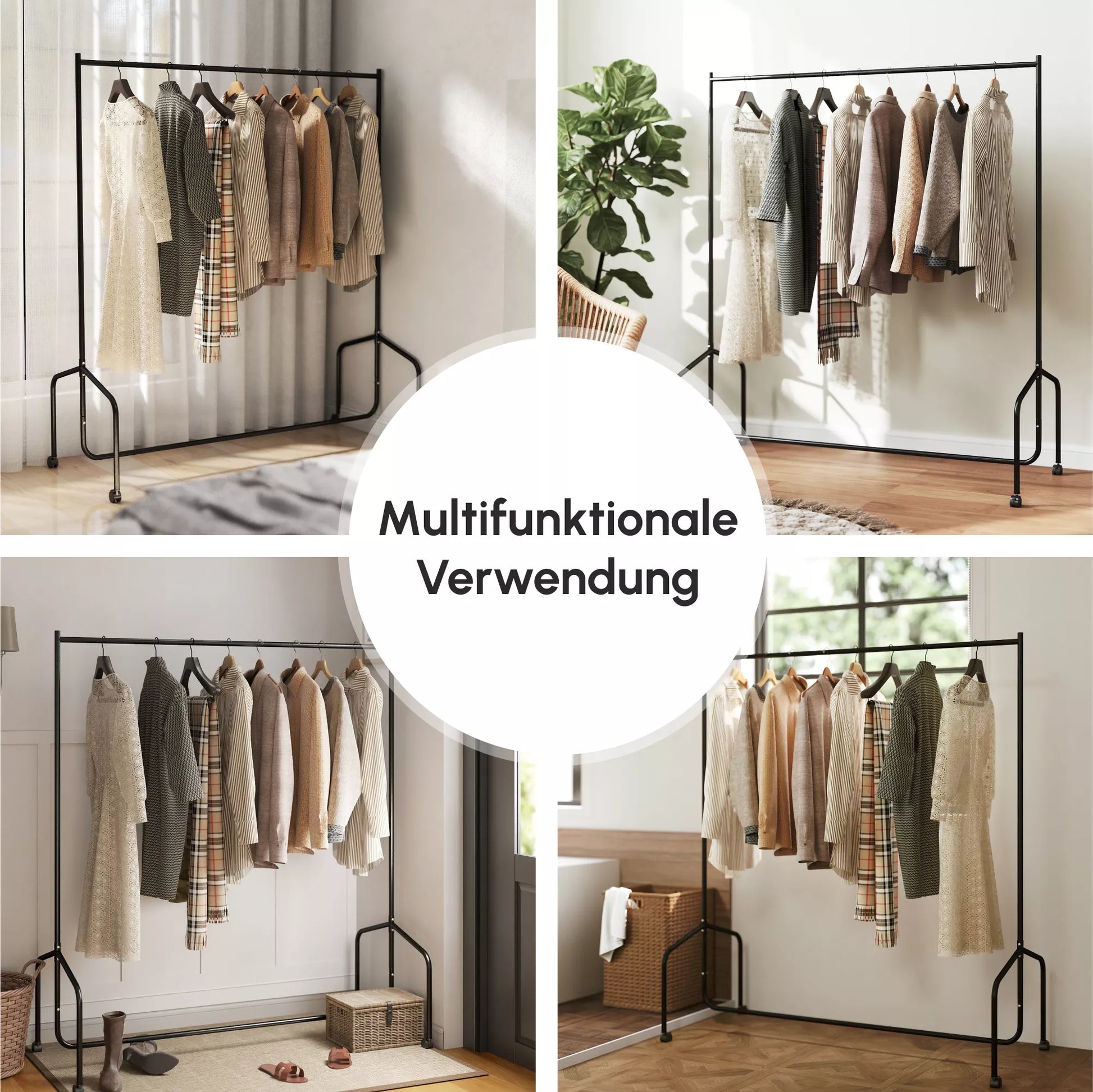 Parodykite, ką turite. Šiuolaikiškas drabužių stovas, kurio dizainas yra tiesus ir paprastas, puikiai eksponuoja jūsų drabužius. Dėka 360° pasukamų ratukų, stovą galima lengvai ir greitai pastatyti bet kurioje kambario vietoje. Tvirtas metalinis rėmas išlaiko iki 140 kg svorį, todėl tinka ir sunkesniems drabužiams, pavyzdžiui, striukėms ar paltams. Pagal pridedamas instrukcijas drabužių stovą galima surinkti per trumpą laiką.