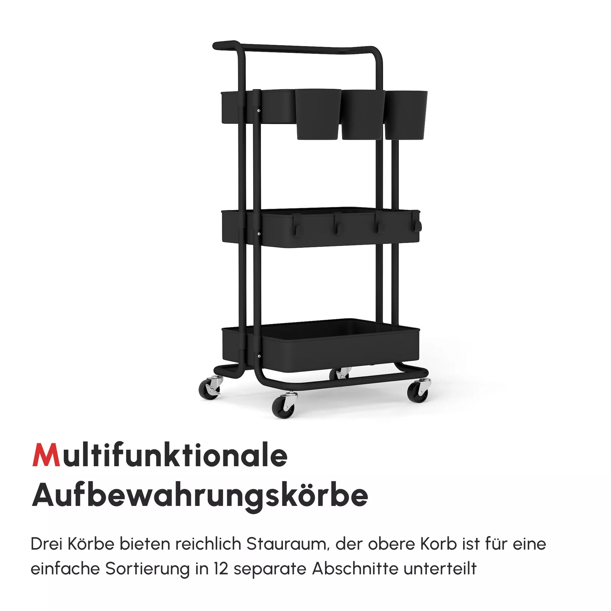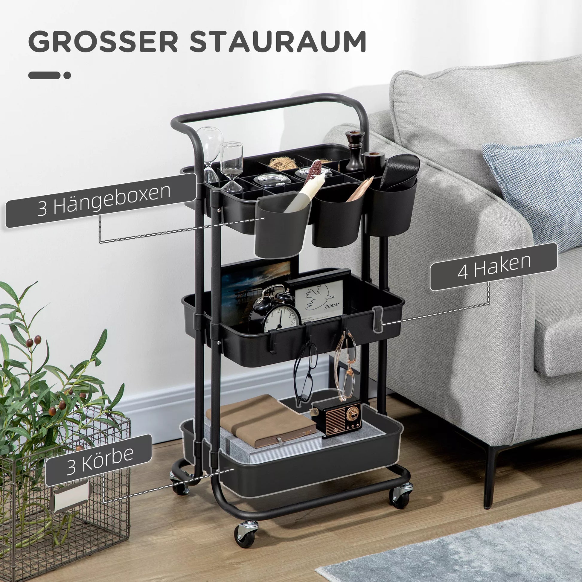 Šis vežimėlis yra kompaktiškas ir idealiai tinka mažoms erdvėms, kurioms reikia papildomos vietos daiktams laikyti. Trys lentynų krepšiai, trys nuimamos pakabinamos dėžutės ir keturi nuimami kabliukai suteikia pakankamai vietos įvairiems daiktams. Lengvai riedančios ratukai leidžia perkelti serviravimo vežimėlį ten, kur jo labiausiai reikia. Jis puikiai tinka kaip vežimėlis meno reikmenims, virtuvės vežimėlis su laikymo vieta, svetainės staliukas ir riedantis stovas dirbtuvei.