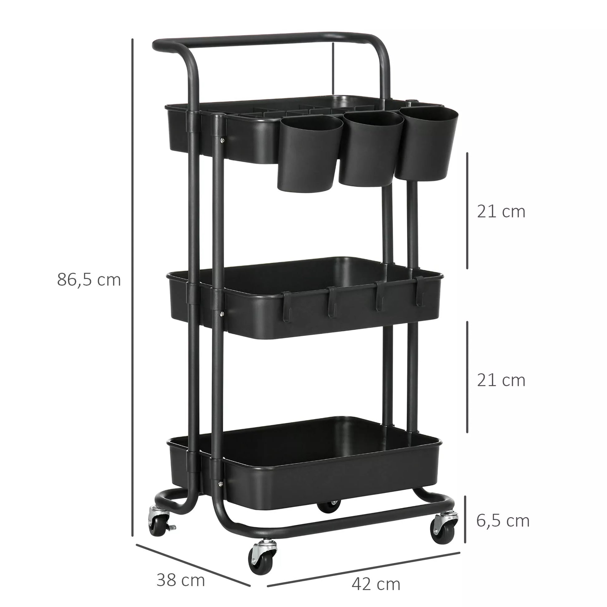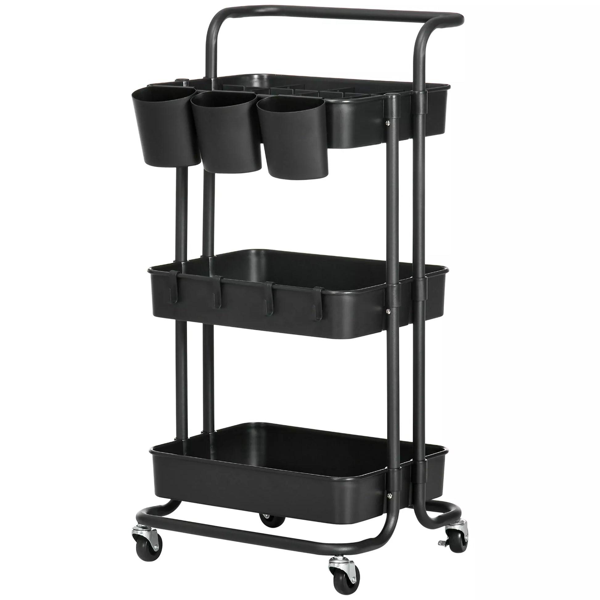 Ratinis vežimėlis su 3 lentynomis, laikymo krepšiais, kabliukais, pagalbinis vežimėlis virtuvei ar svetainei, plienas, plastikas, juodas