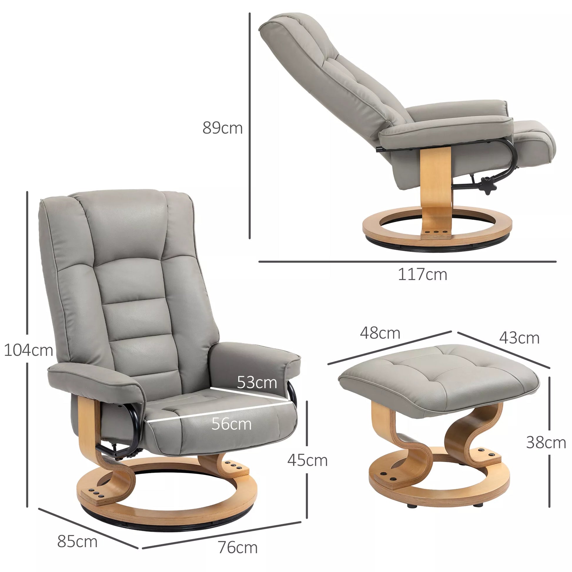 Atpalaiduojantis fotelis su taburete, pasukamas ir pakreipiamas, dirbtinės odos apmušalas, iki 150 kg, medinis rėmas, pilkos spalvos