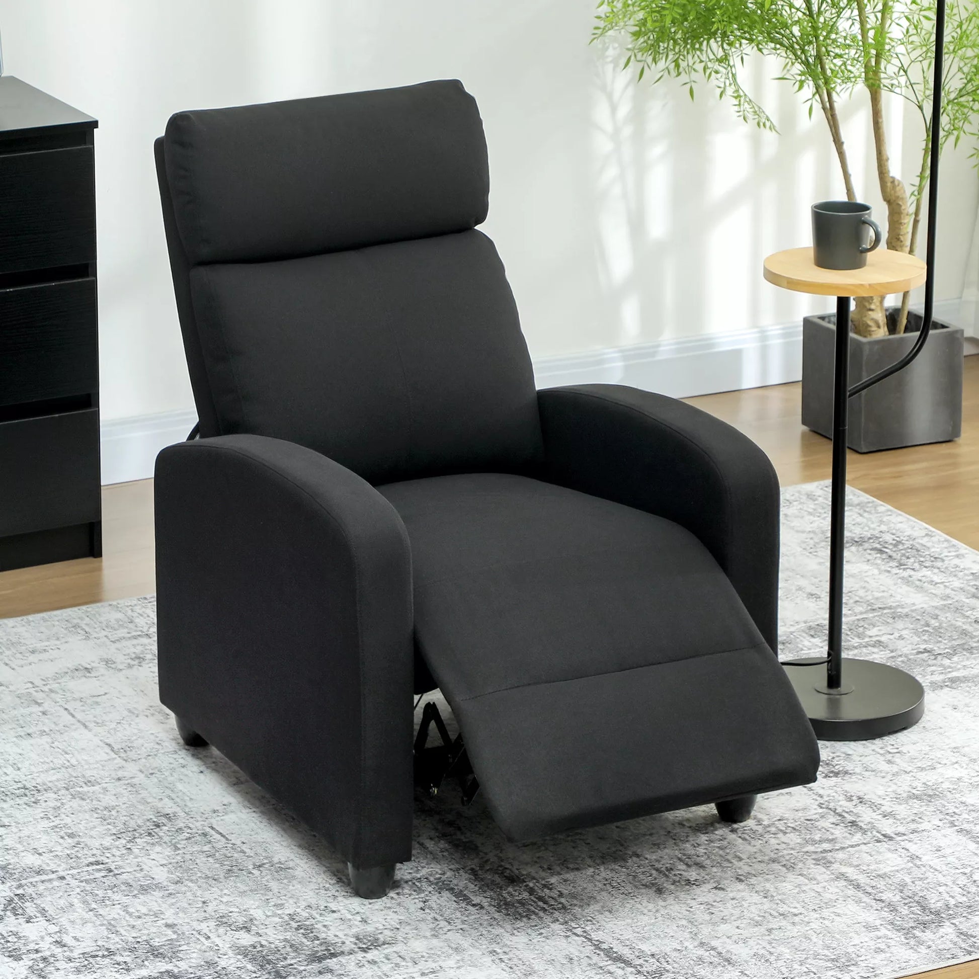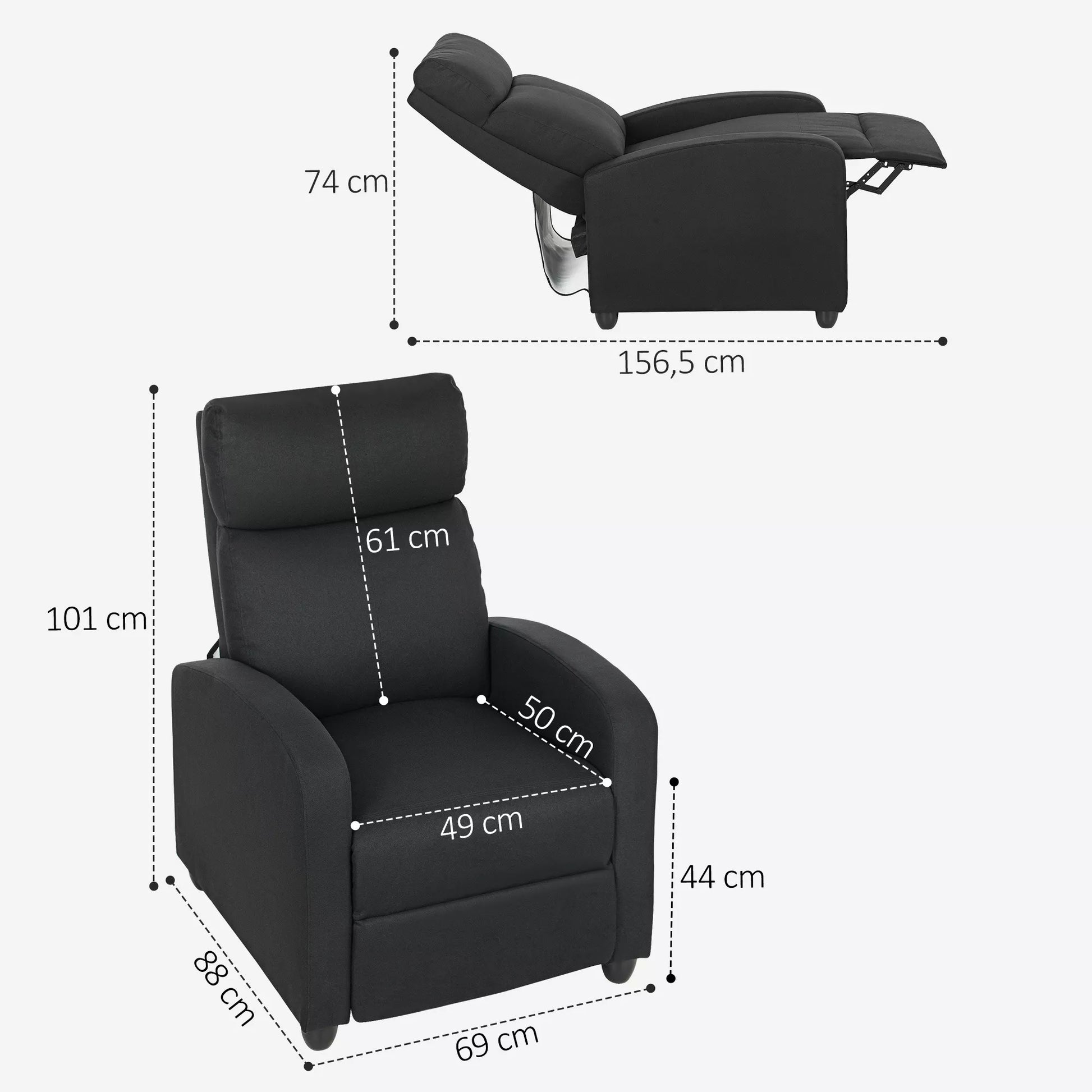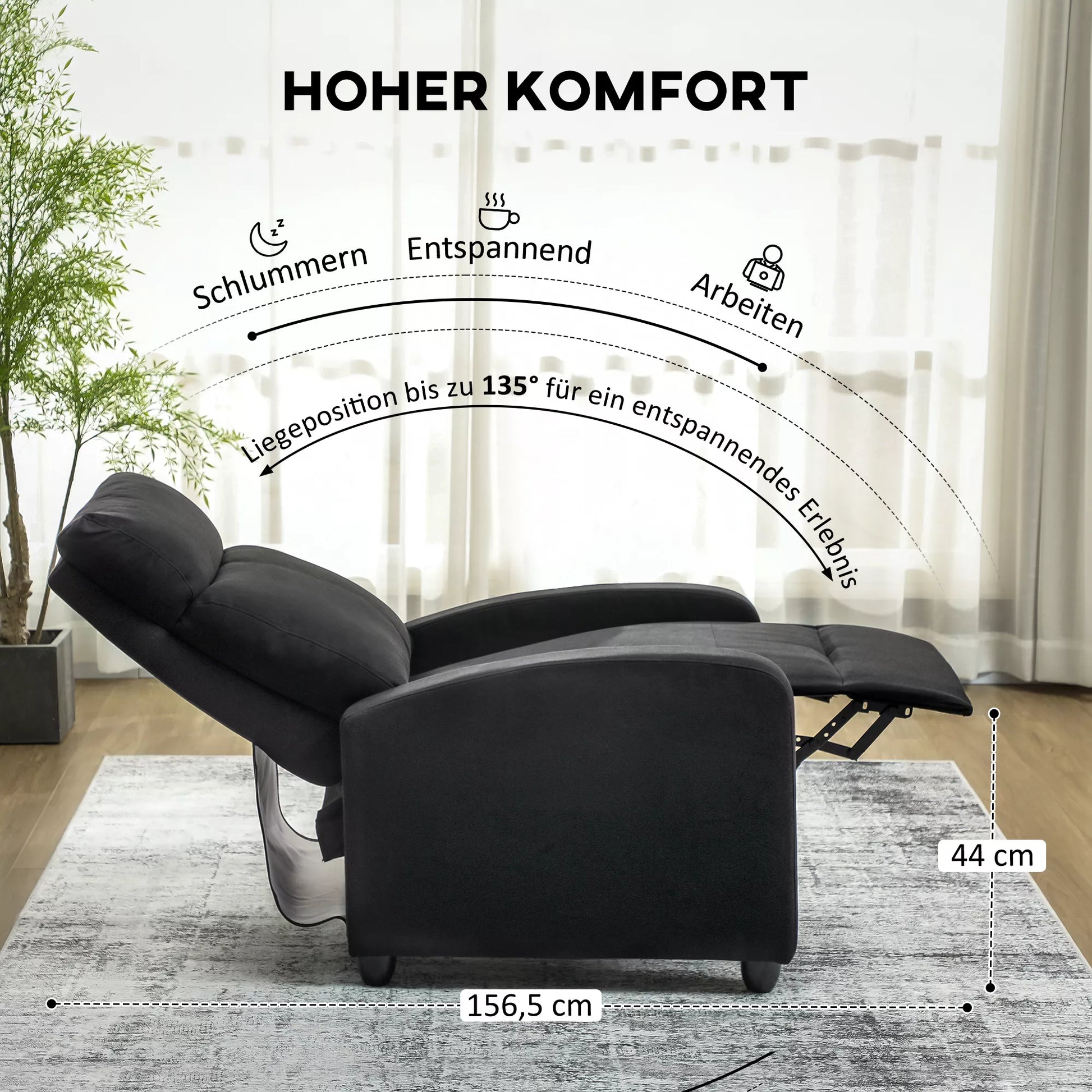 Relaksacijos krėslas, reguliuojamas 135°, ištraukiama kojų atrama, paminkštintos atlenkiamos atramos, linas-poliesteris, juodas