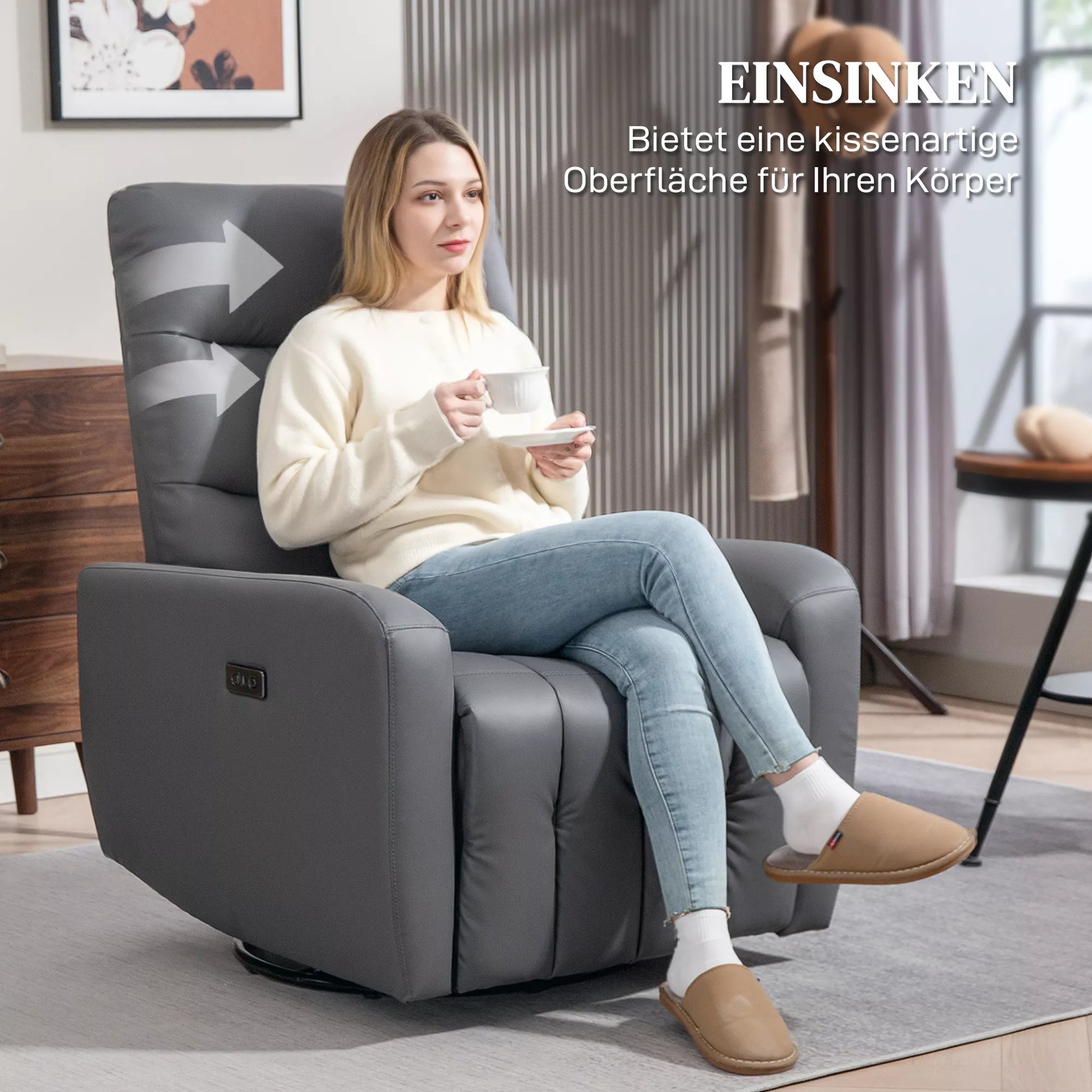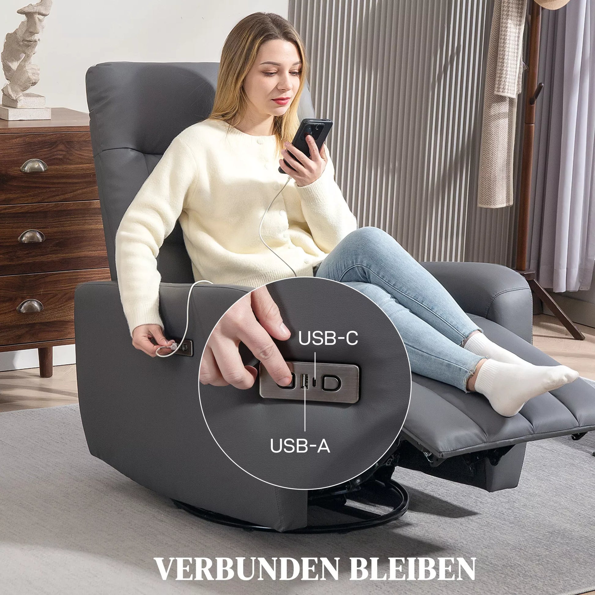 Pasinerkite į prabangą su mūsų relaksaciniu krėslu su gulėjimo funkcija, kuriame elegancija derinama su patogumu. Dėl dviejų USB-A ir USB-C jungčių jūsų įrenginiai visada bus paruošti naudoti. Mėgaukitės aukščiausio lygio komfortu su bepakopiu, 135° atlošiamu atlošu ir ypač minkštu dizainu – tai puikus jūsų svetainės akcentas.