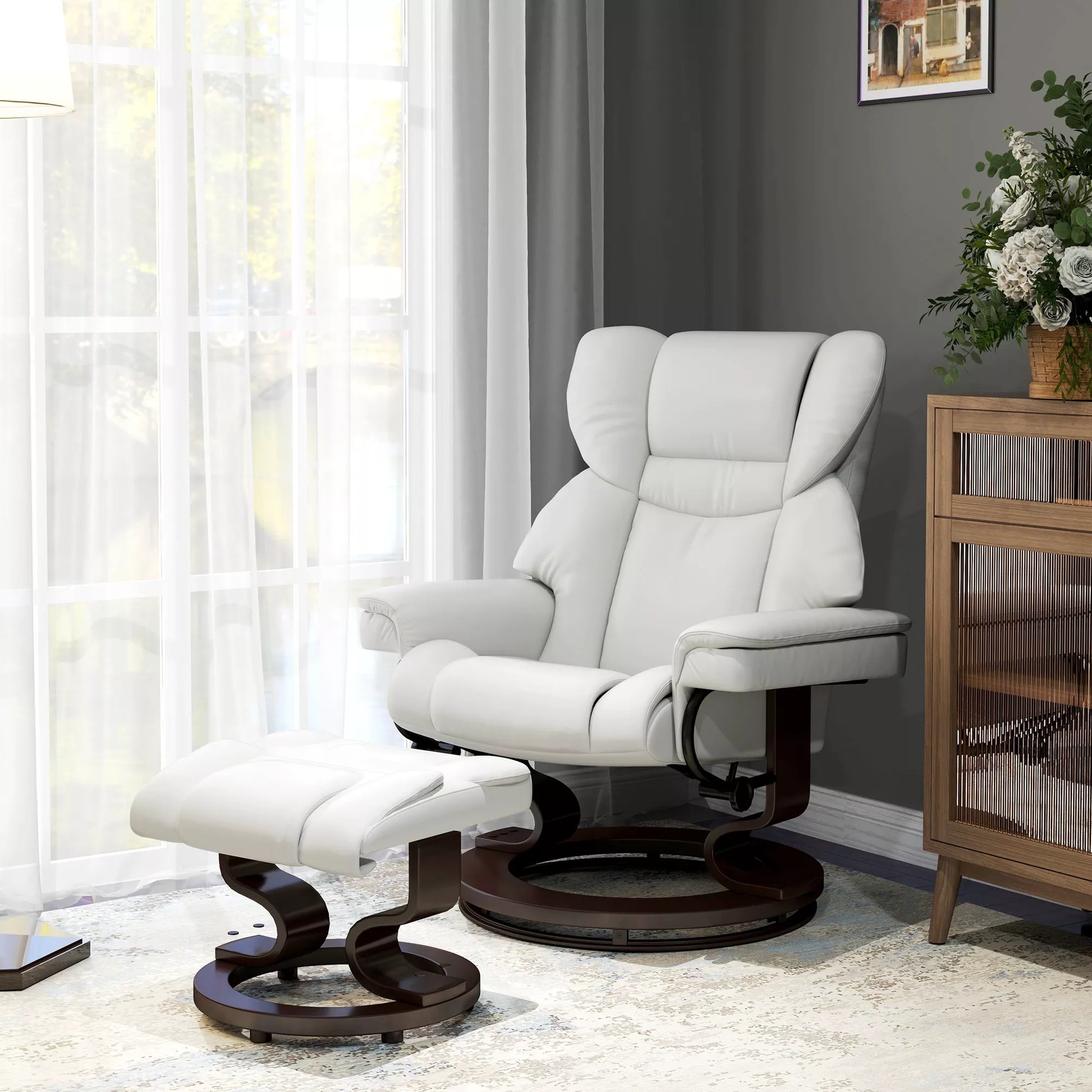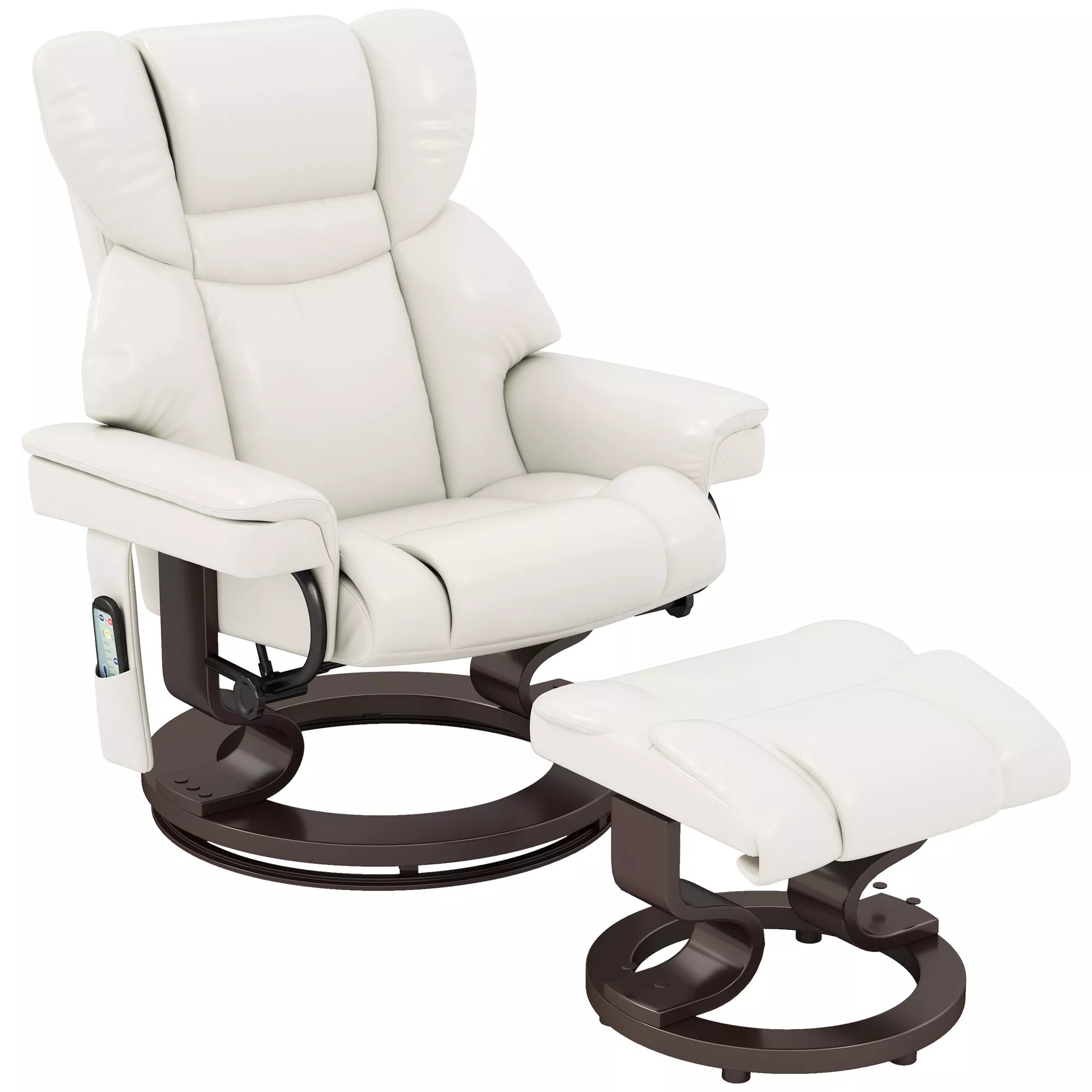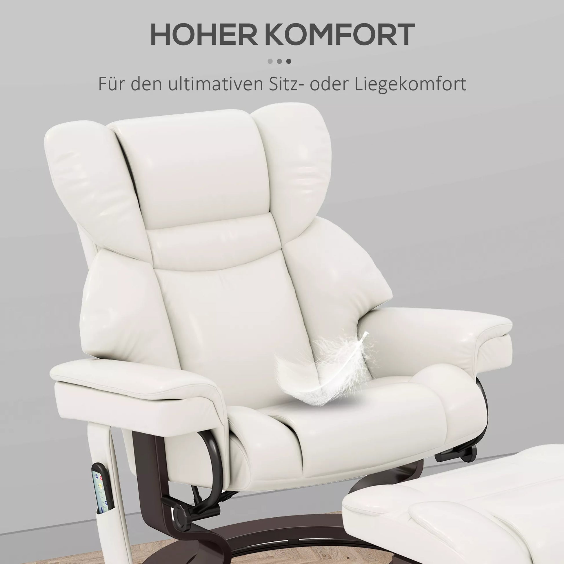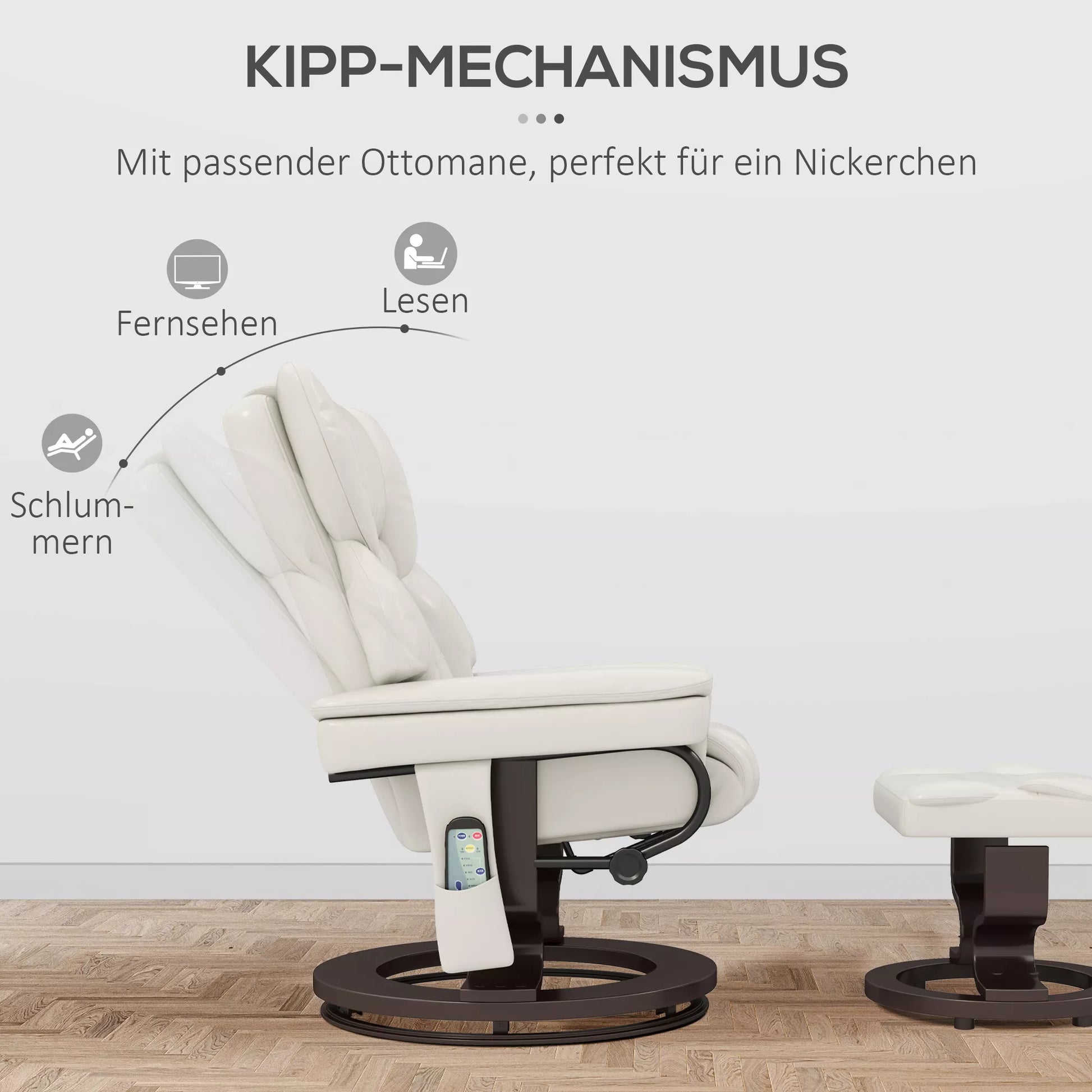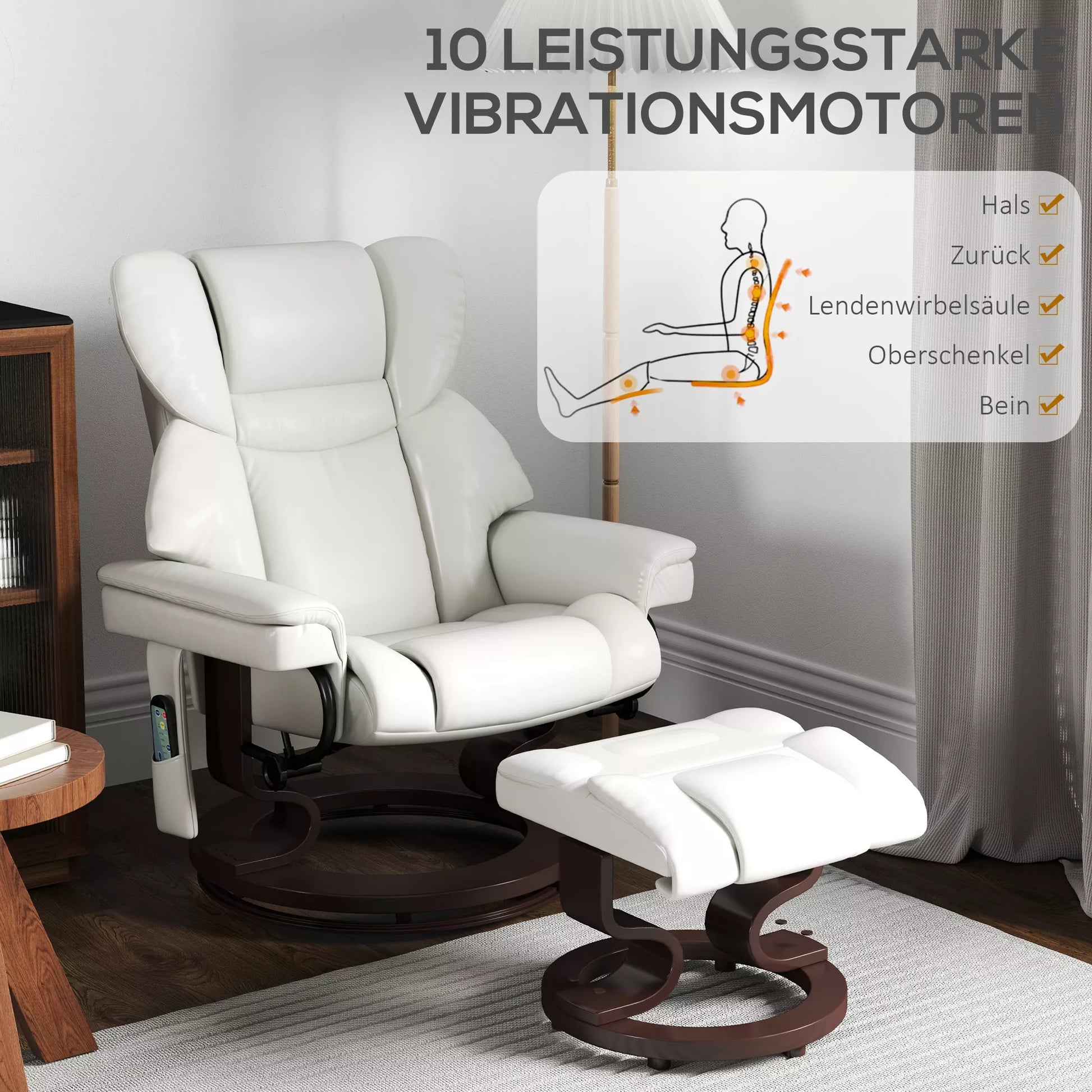 Poilsio krėslas su masažo funkcija ir pėdų atrama, atlošiamas krėslas, dirbtinė oda, 79 x 82 x 101 cm, kreminės baltos spalvos