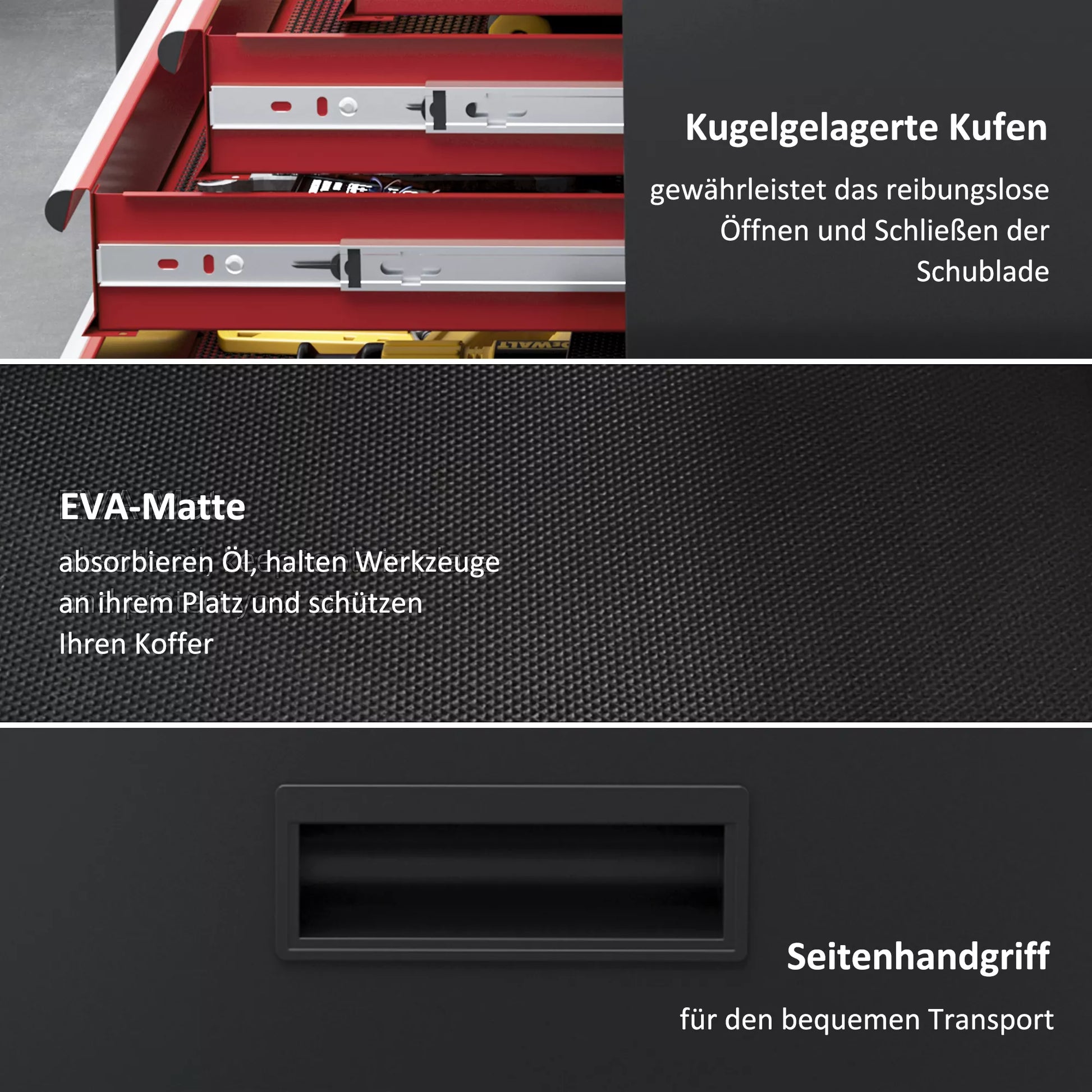 - ✔ Vidinis dirbtuvių vežimėlio EVA kilimėlis sugeria alyvą ir laiko įrankius savo vietoje