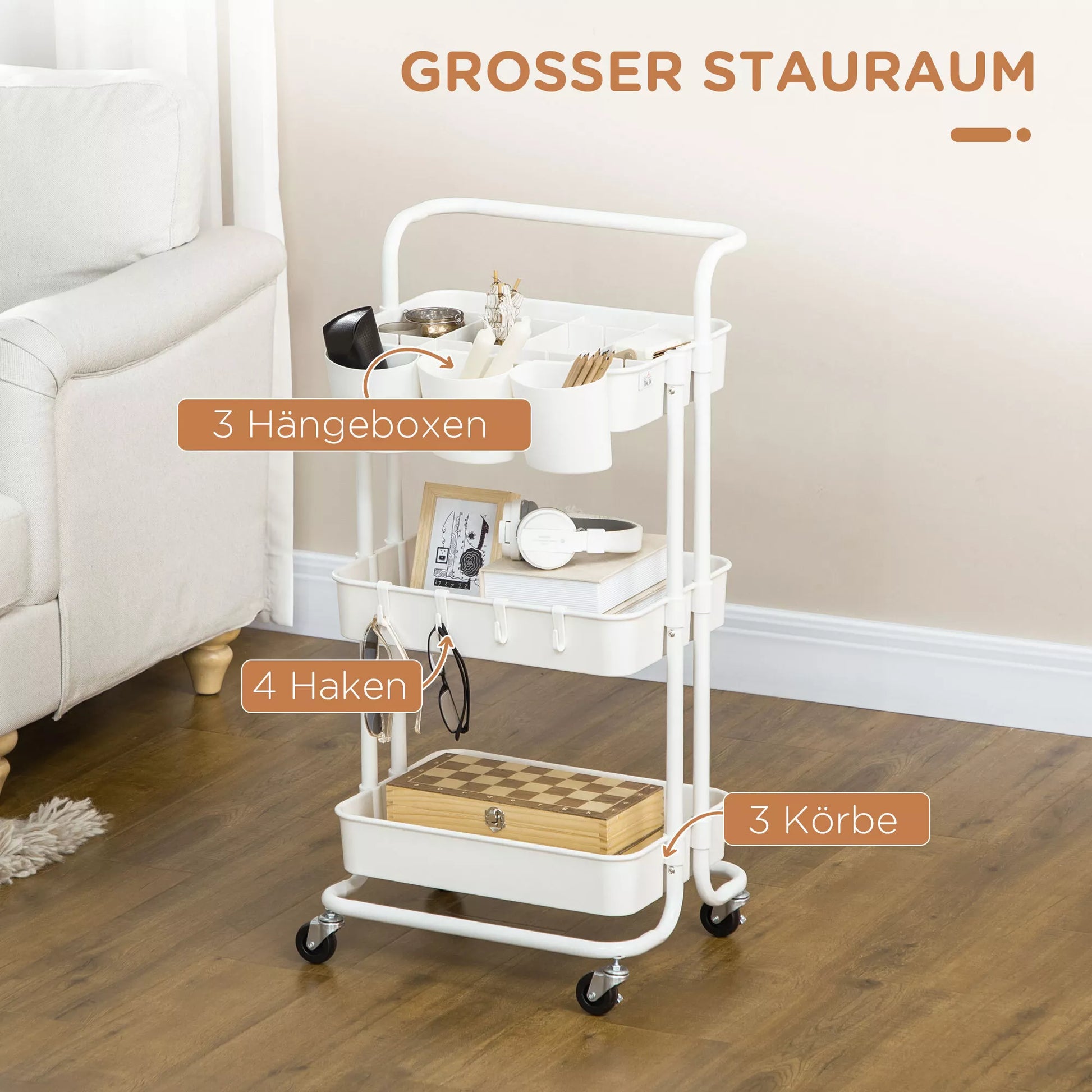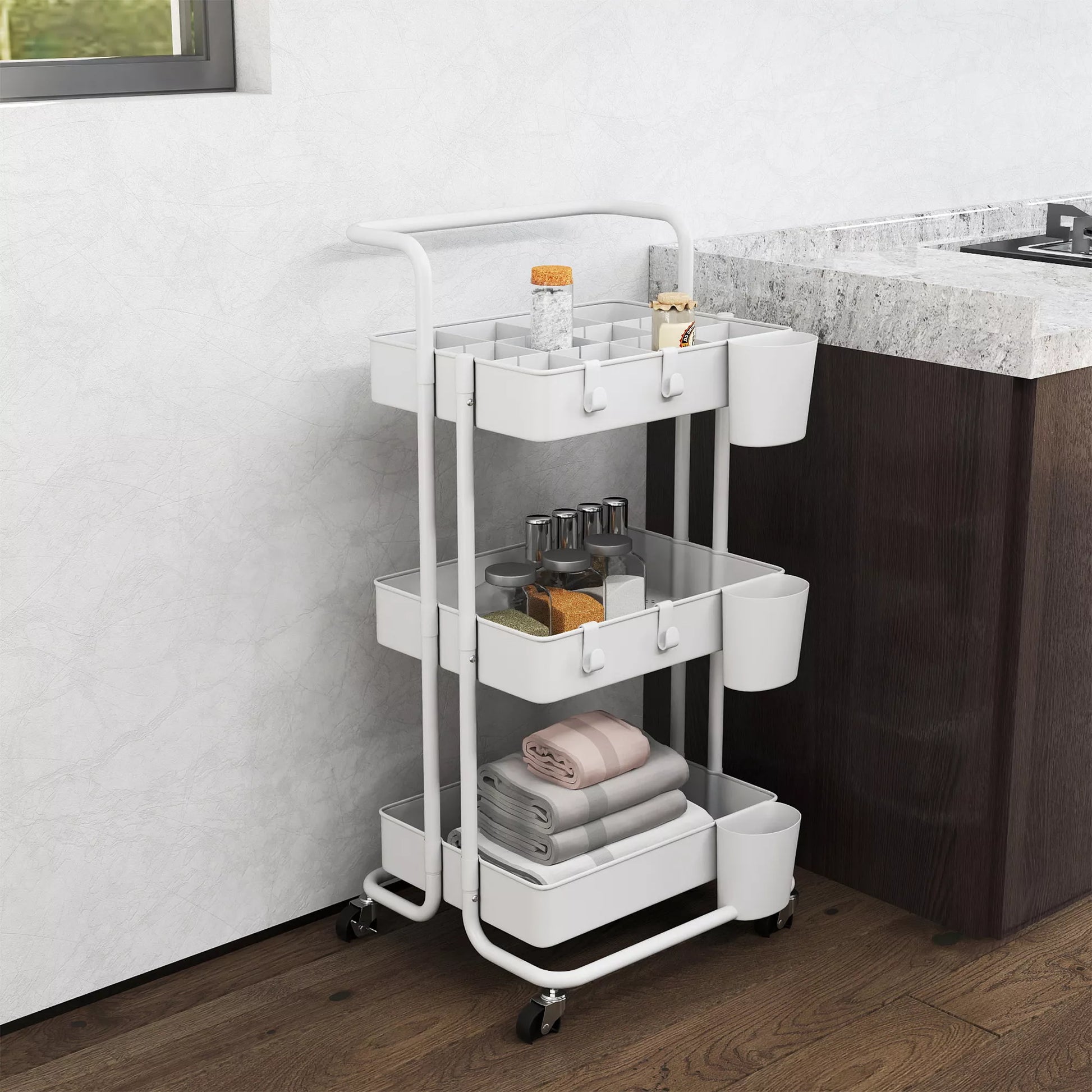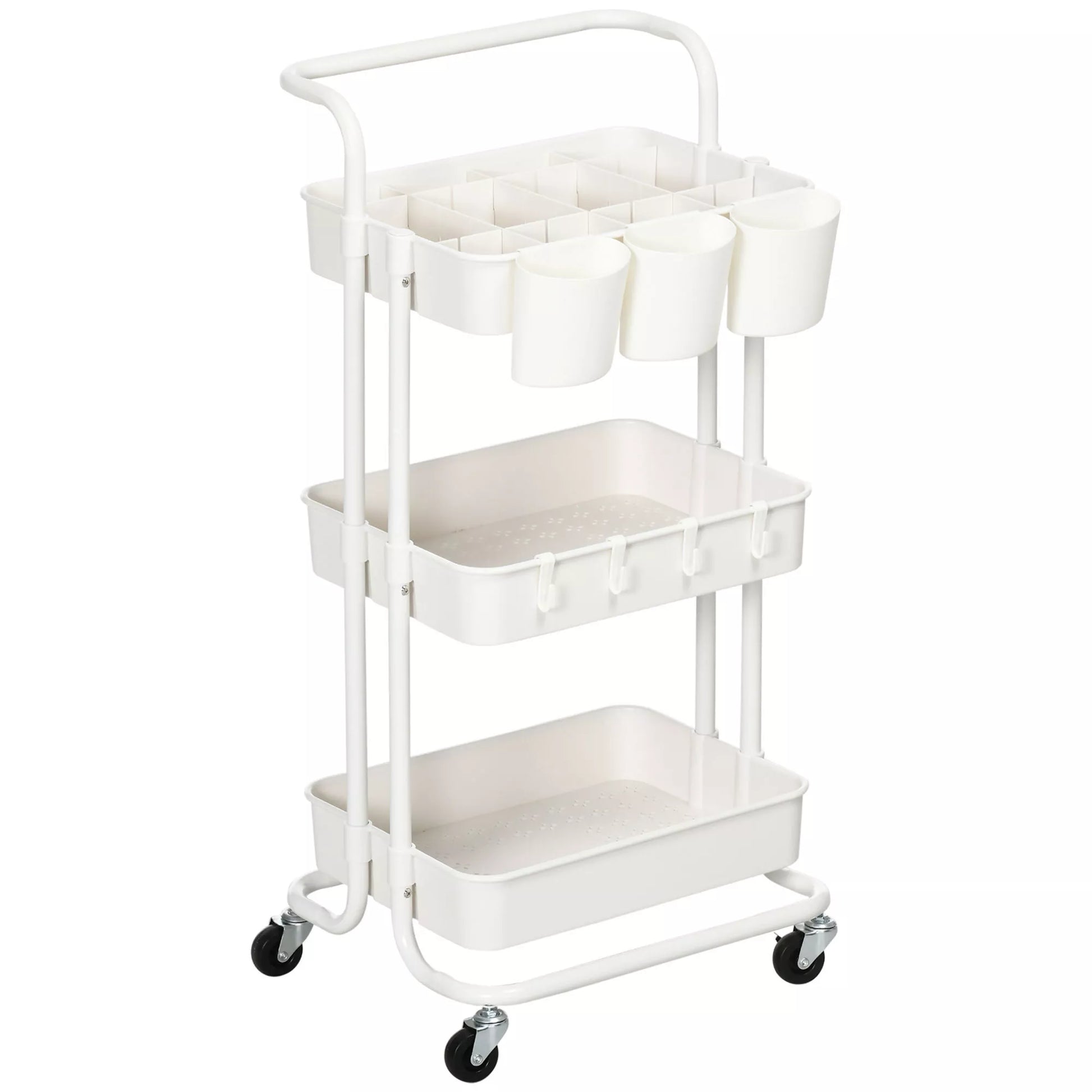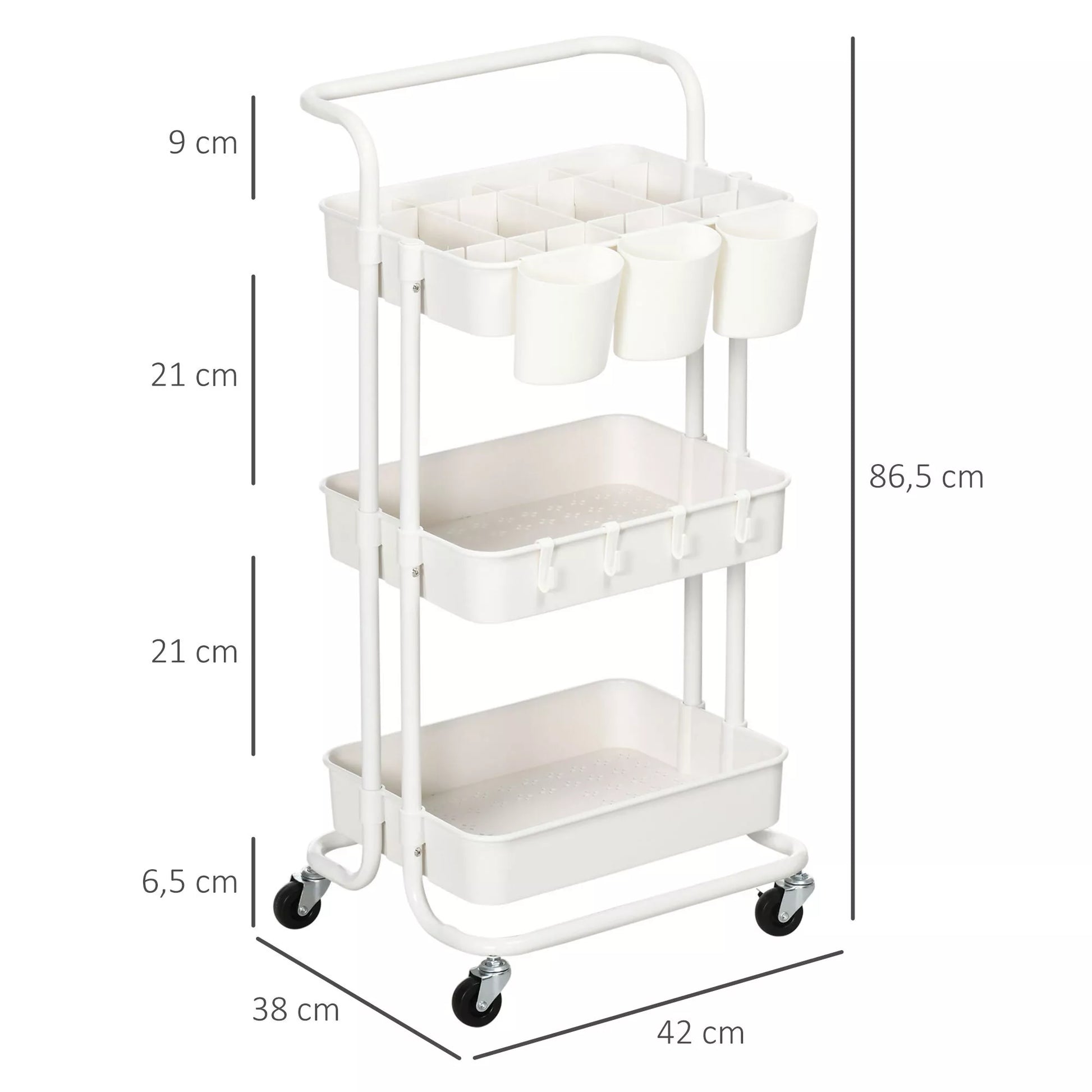 Ratinis vežimėlis, serviso vežimėlis, 3 laikymo krepšeliai, 3 pakabinamos dėžutės, 4 kabliukai, metalinis rėmas, 42 x 38 x 86,5 cm, balta
