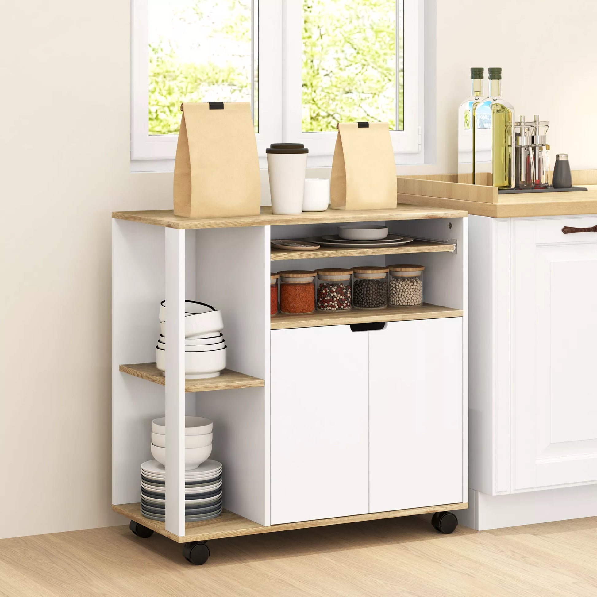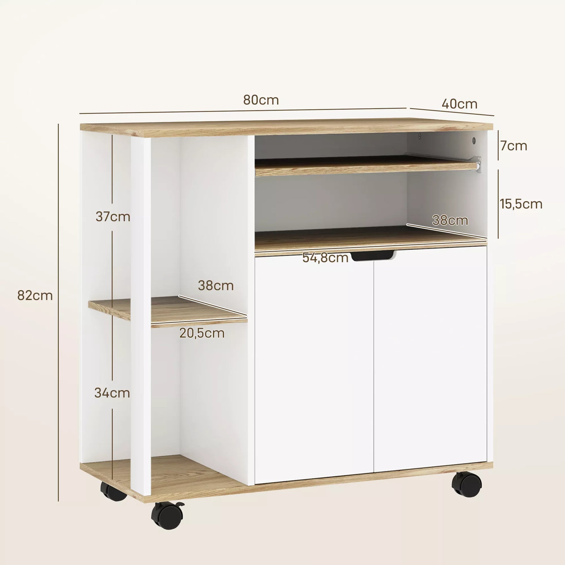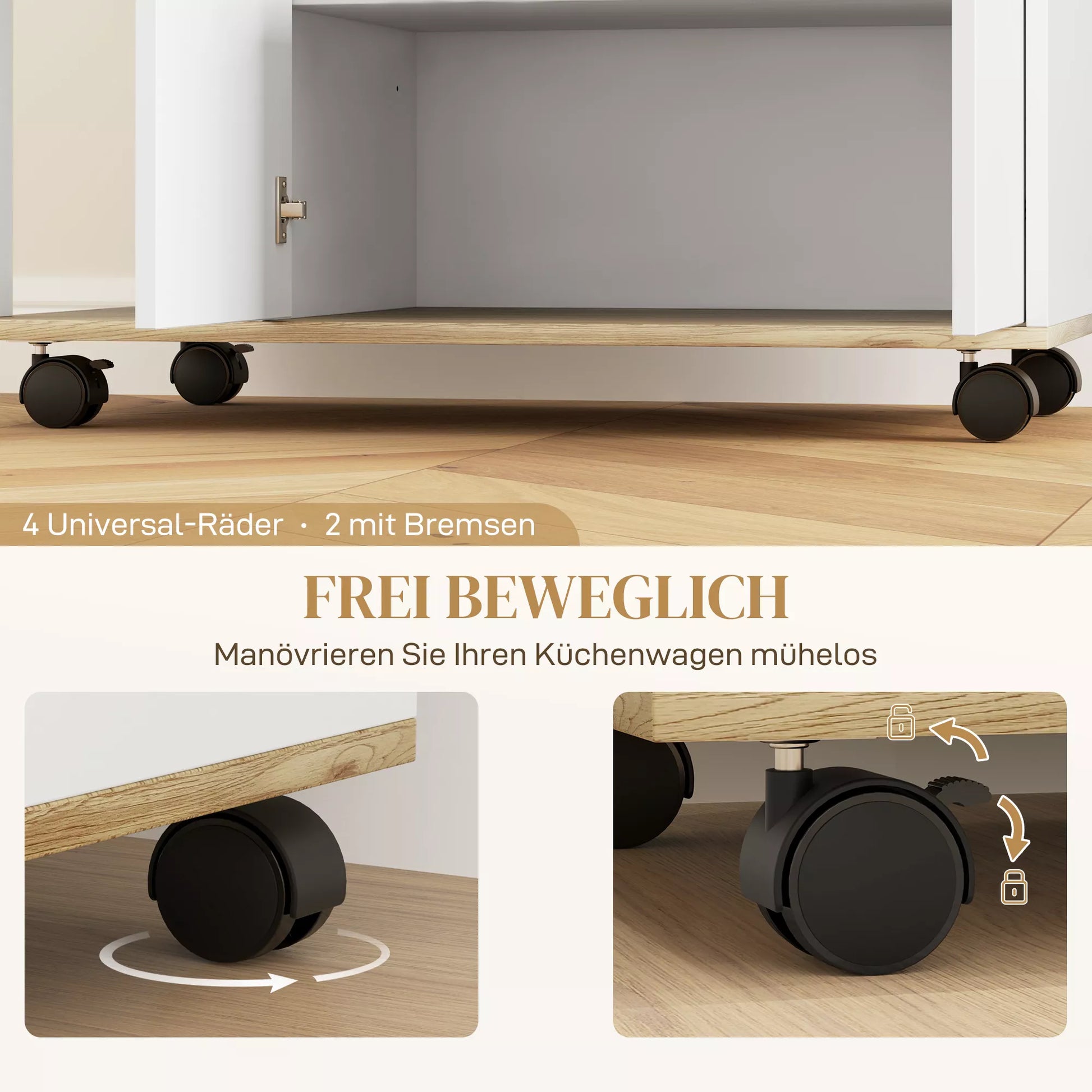 Pagerinkite savo namus su virtuviniu vežimėliu! Įvairios laikymo galimybės palengvina maisto ruošimą ir patiekimą. Jame yra didelė darbo vieta maisto ruošimui ir ištraukiamas skyrius pjaustymo lentoms, kepimo popieriui ir folijai. Mažuose šoniniuose skyreliuose galima tvarkingai laikyti prieskonius. Virtuvinio vežimėlio spintelė su dvigubomis durimis ir reguliuojama vidine lentyna taip pat suteikia lankstią saugojimo vietą puodams ir keptuvėms.