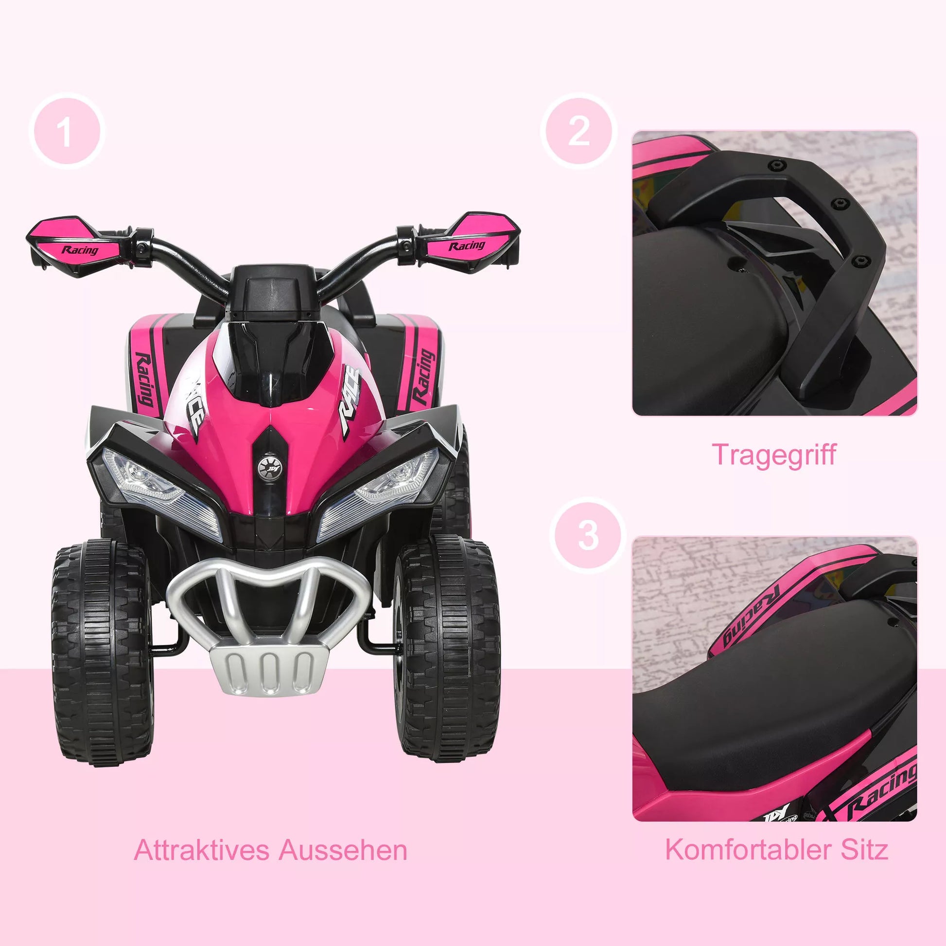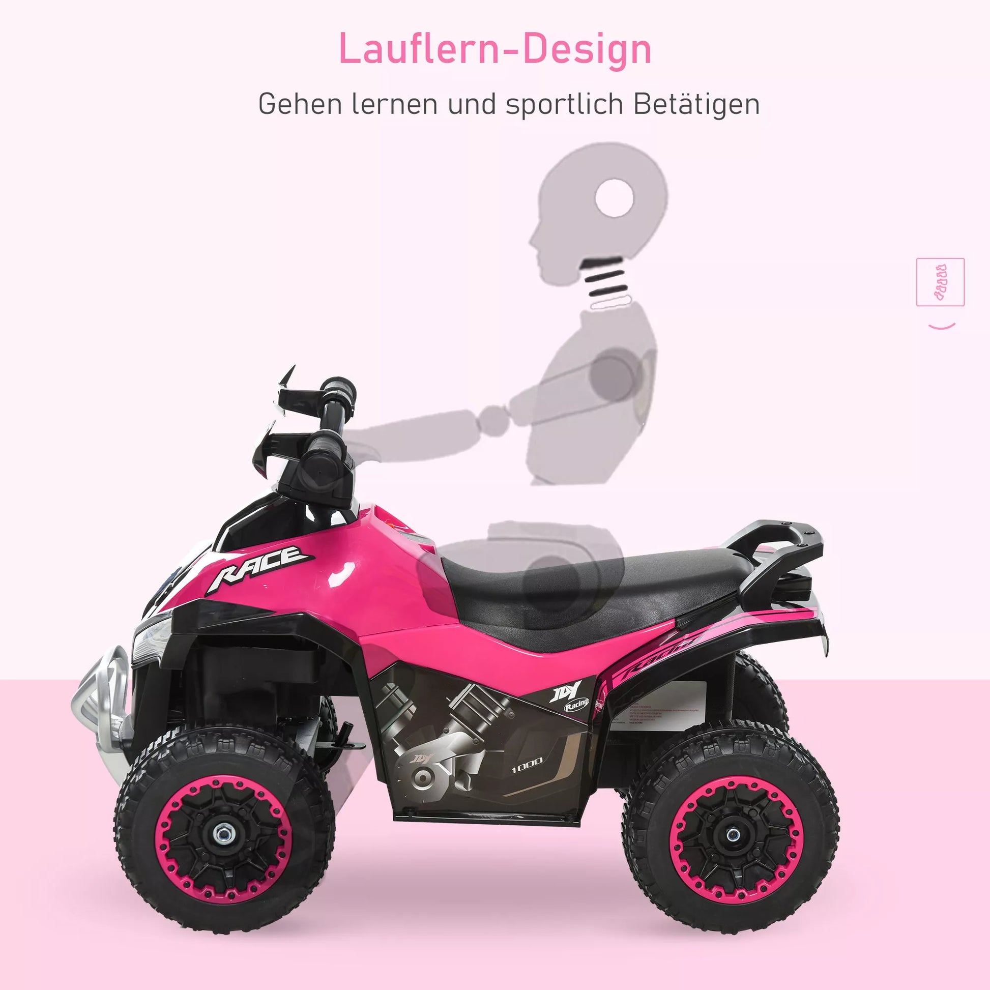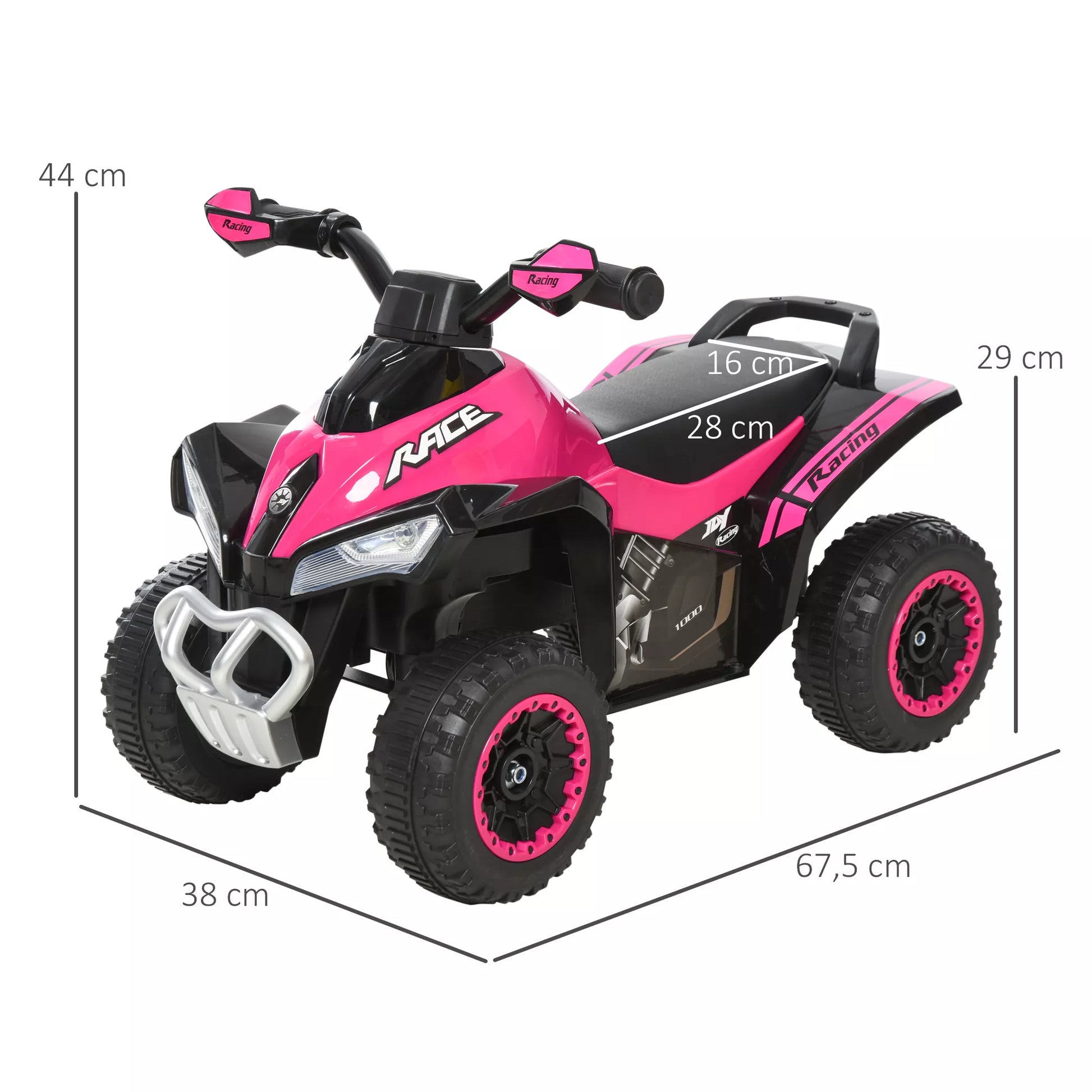 Jūsų vaikas nenorės nulipti nuo šio patogaus paspiriamo automobilio. Plati sėdynė ir linksma muzika užtikrina puikią vairavimo patirtį. Sutemus žibintai apšviečia kelią, užtikrindami saugumą ir gerą matomumą. Dėl tvirtų, dilimui atsparių padangų jūsų vaikas galės lengvai važiuoti minkšta danga, o suimama vairas užtikrins saugų sukibimą ir patogias rankas.