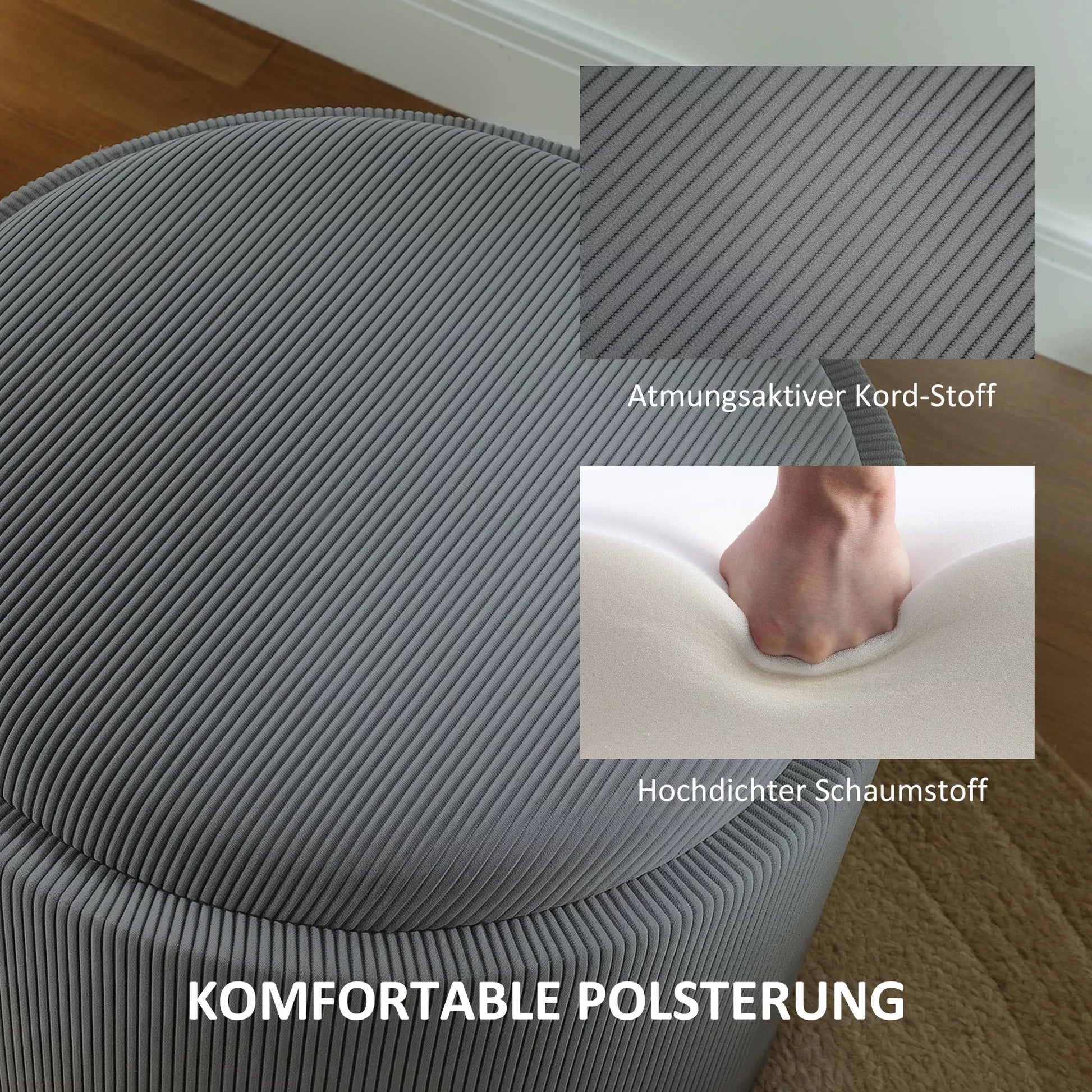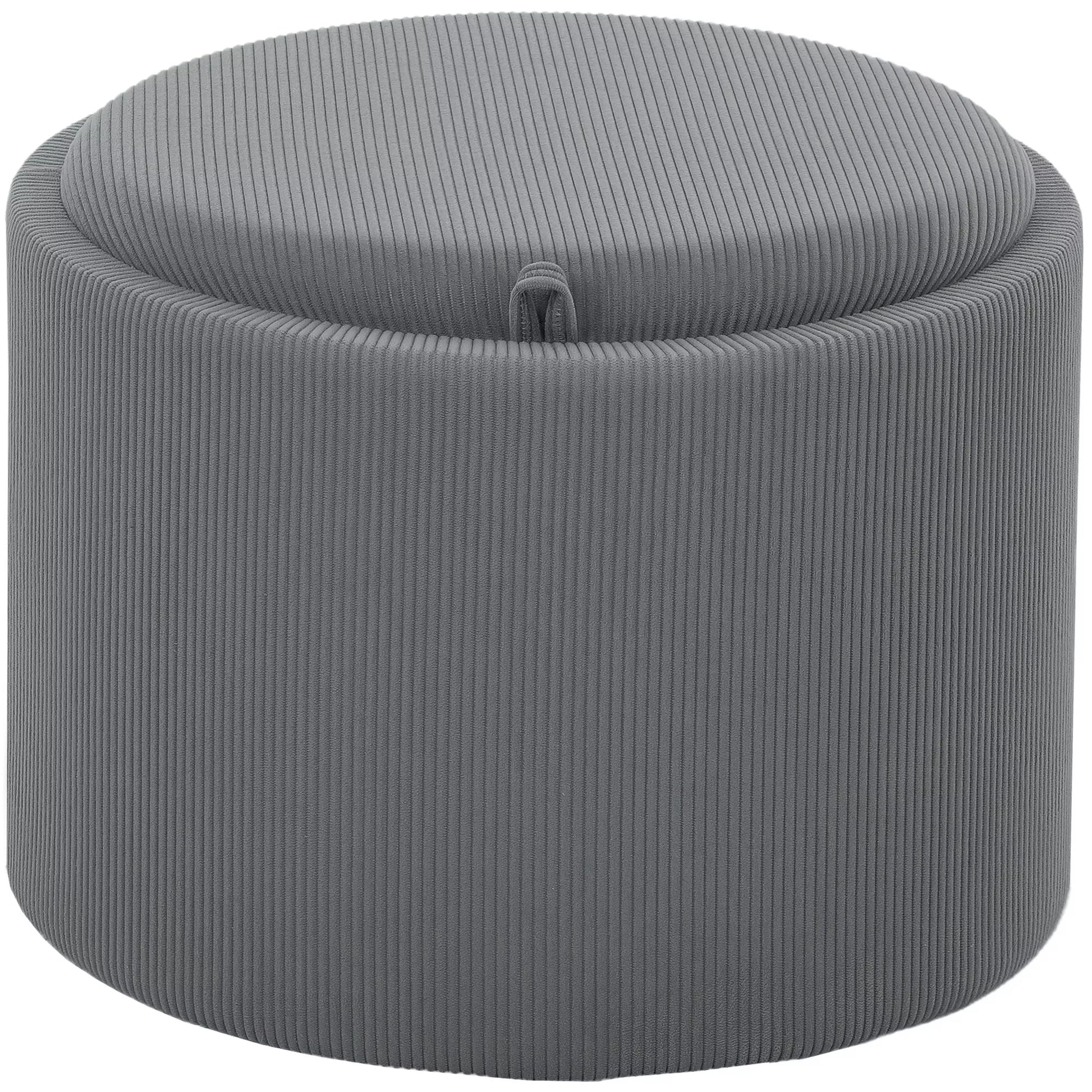 Apvalus laikymo pufas su daiktadėže, atrama kojoms, iš kordilano audinio, MDF, pilkos spalvos