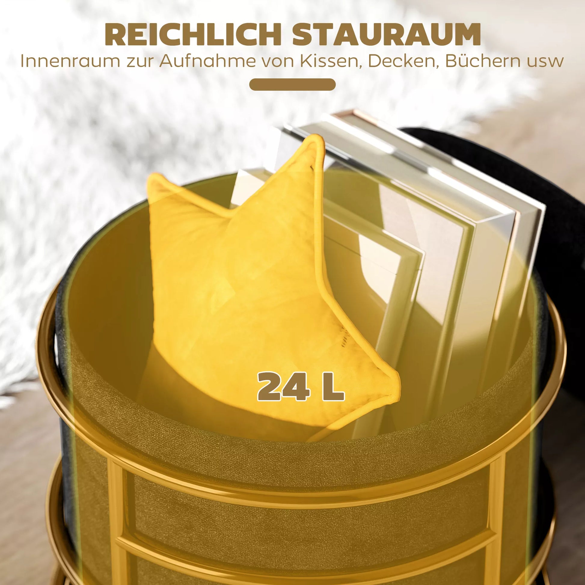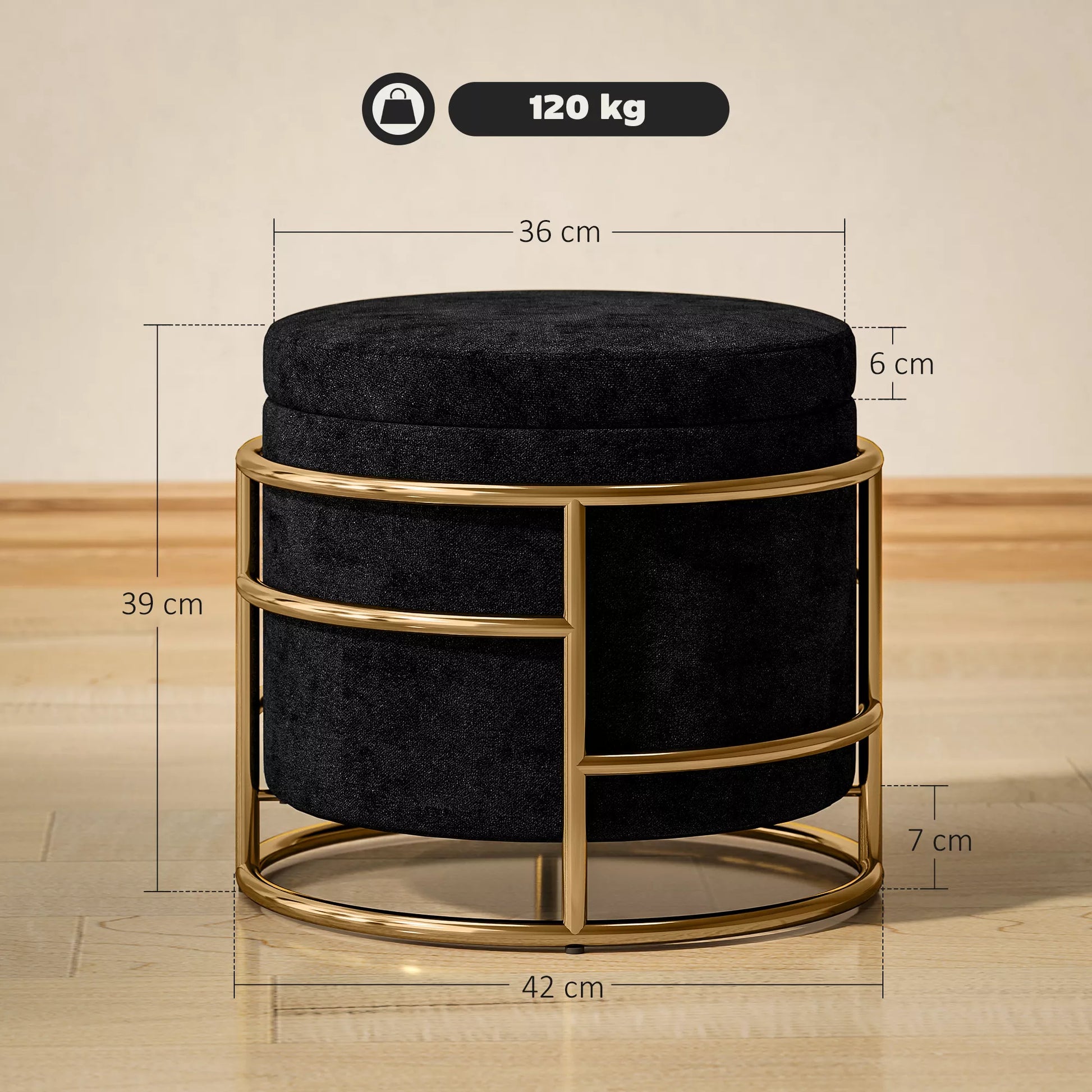 - ✔ Auksinės pūfo detalės suteikia modernios elegancijos