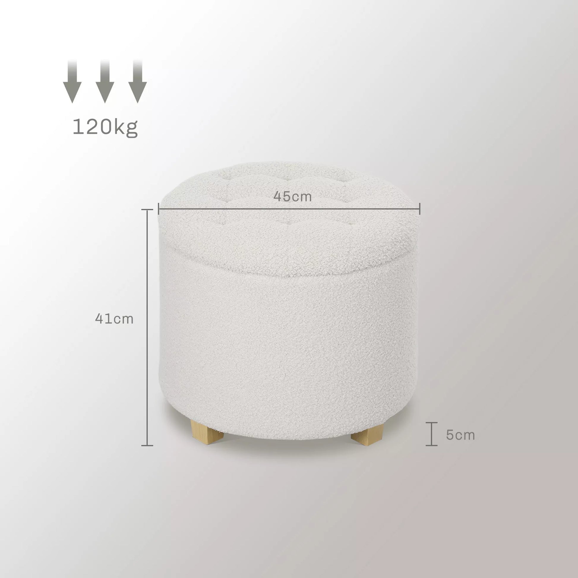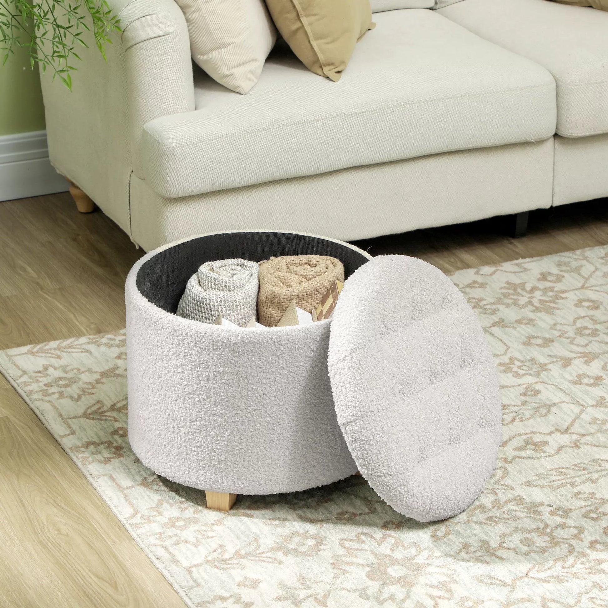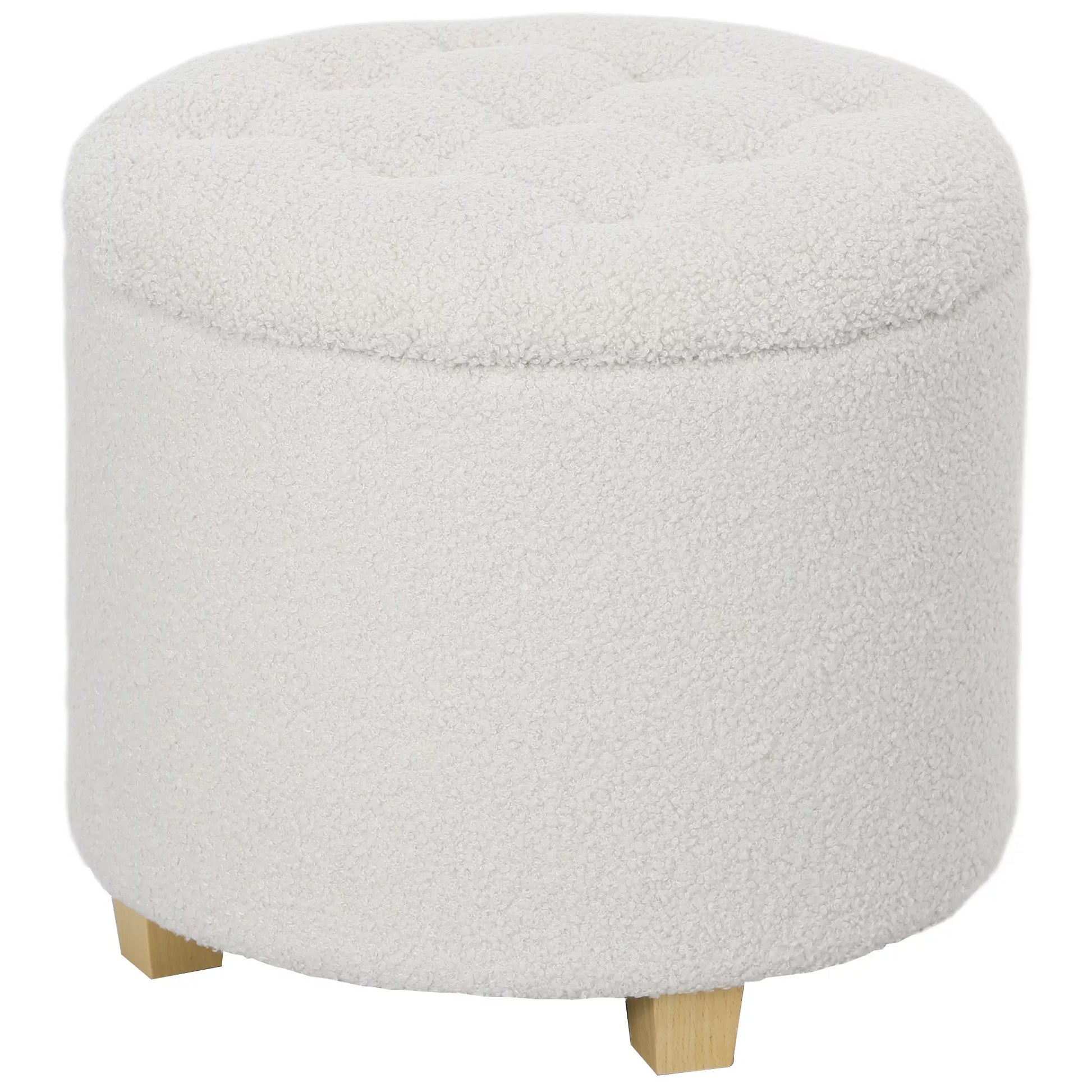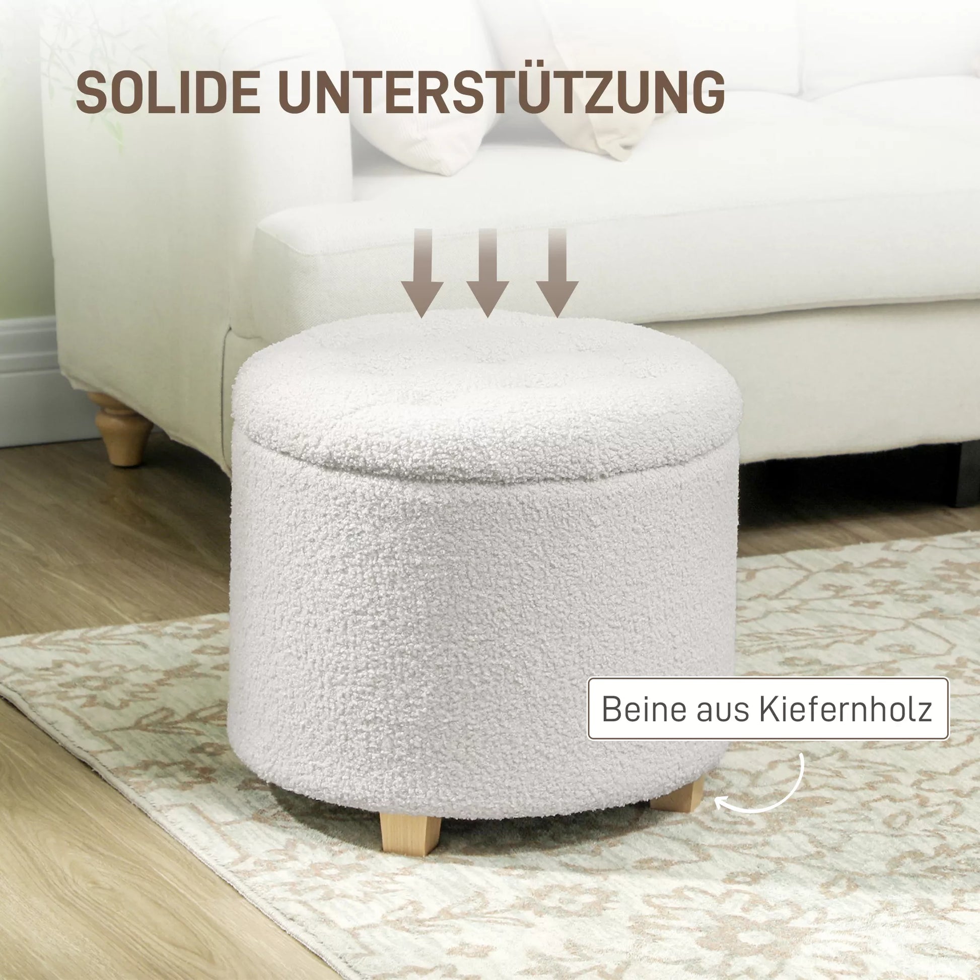 Sėdimasis pufas su daiktadėže, apvalus taburetė su dangčiu, laikymo dėžė, su medinėmis kojelėmis, balta