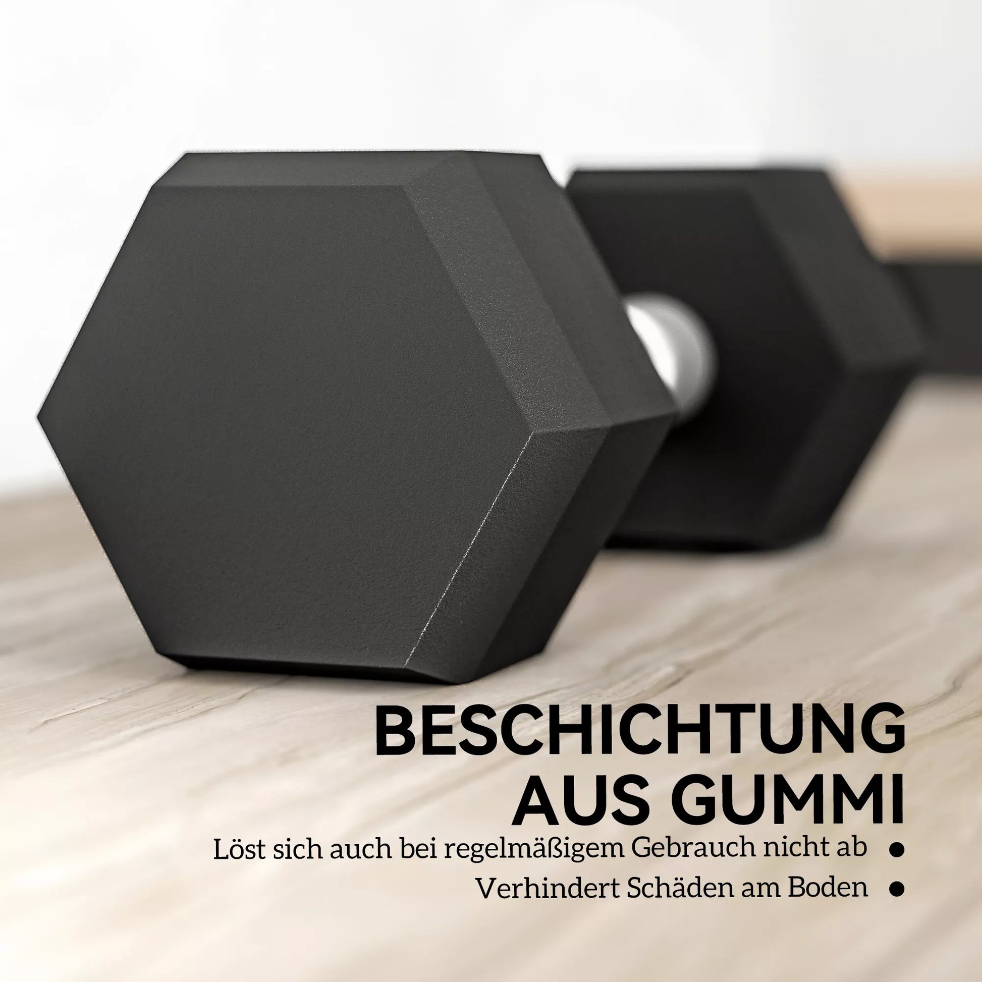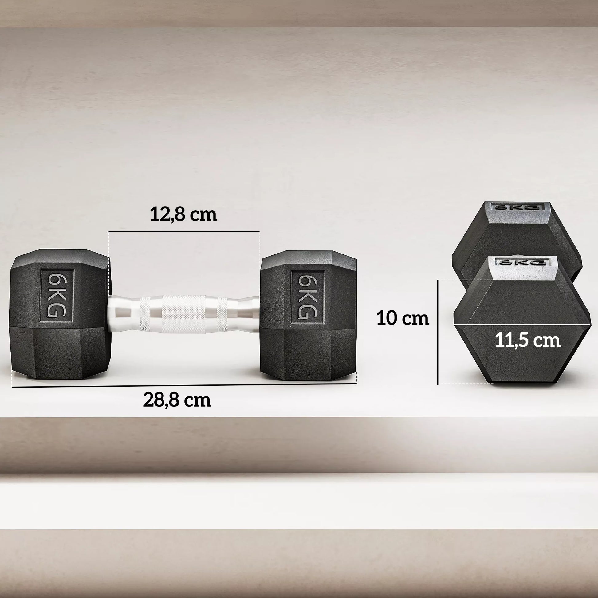 Ši šešiakampė hantelė su gumine danga puikiai tinka jūsų treniruočių režimui, tinkama naudoti namuose, sporto salėje ir biure. Kiekviena hantelė pagaminta iš metalo ir gumos, todėl yra patvari ir nebraižo grindų. Rifliuotas paviršius garantuoja jūsų saugumą atliekant hantelių kilnojimus, sprando pratimus, tricepso pratimus atlošus ir kt. Šis hantelių komplektas yra idealus būdas atlikti pratimus su hantelėmis.