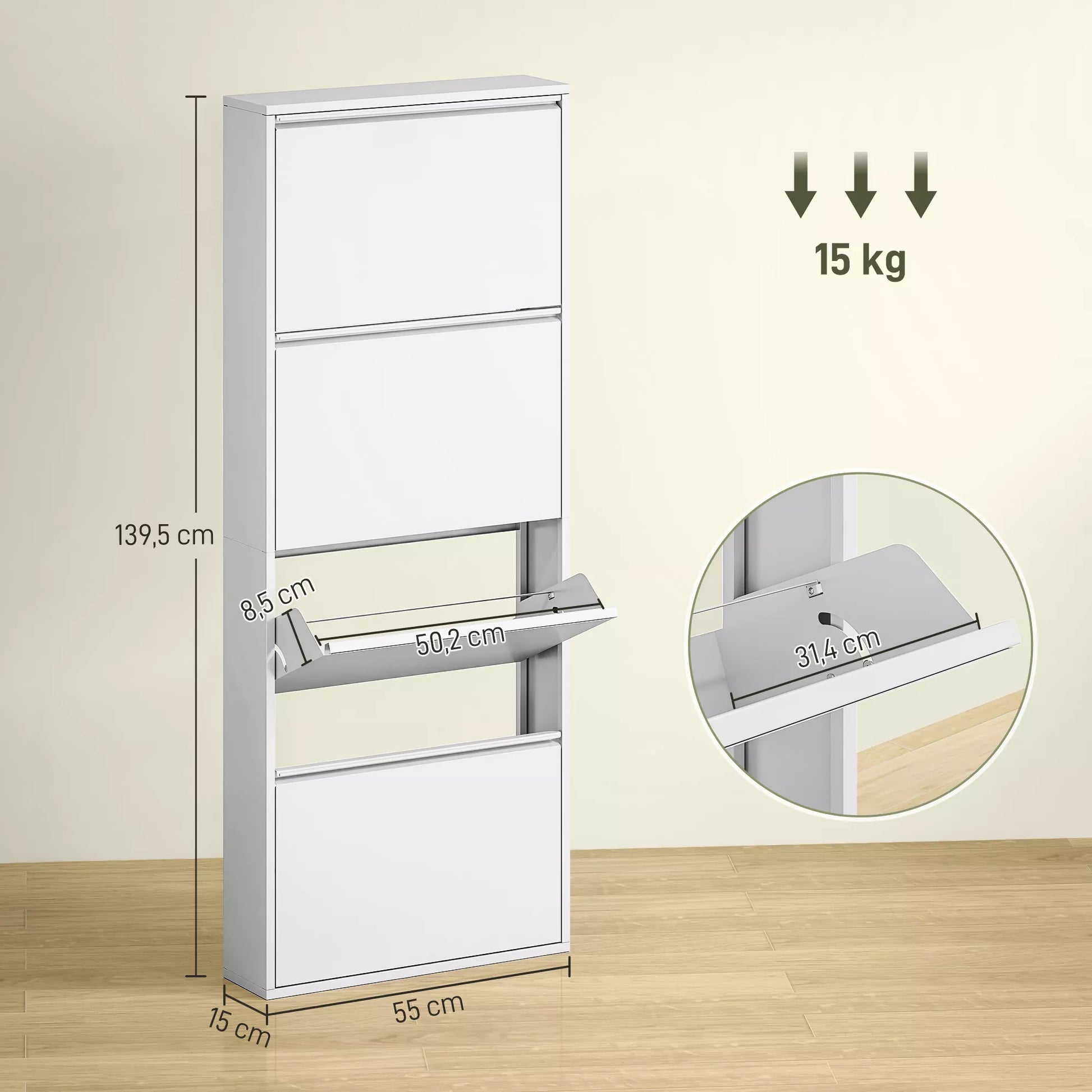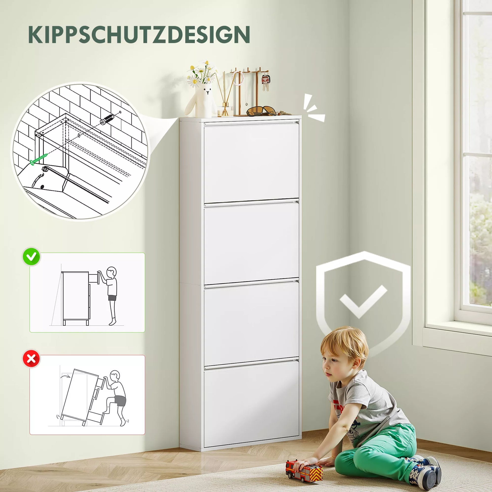 Siaura balta metalinė batų spintelė iki 8 porų batų, 4 atlenkiamos durelės, skirta prieškambariui, koridoriui