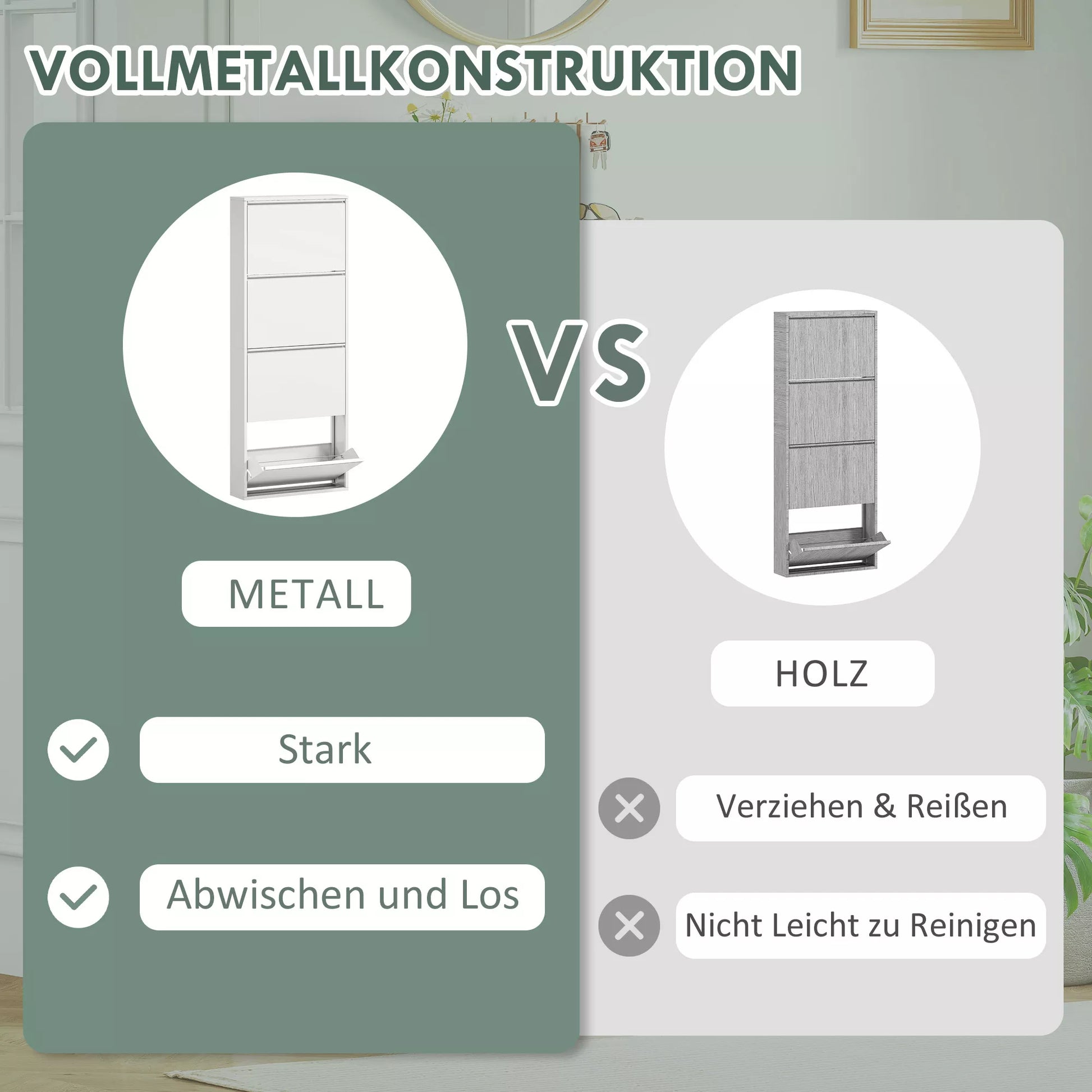 Suteikite savo prieškambariui tvarkos ir elegancijos su batų spinta! Ši elegantiška batų lentyna turi keturias atverčiamas stalčius, kuriuose galima kompaktiškai sutalpinti iki 8 porų batų, taip pat praktišką viršutinę lentynėlę jūsų kasdieniams daiktams. Vos 15 cm gylio, ji idealiai tinka mažoms erdvėms, o dėl saugaus tvirtinimo prie sienos ypač tinkama namams, kuriuose yra augintinių.