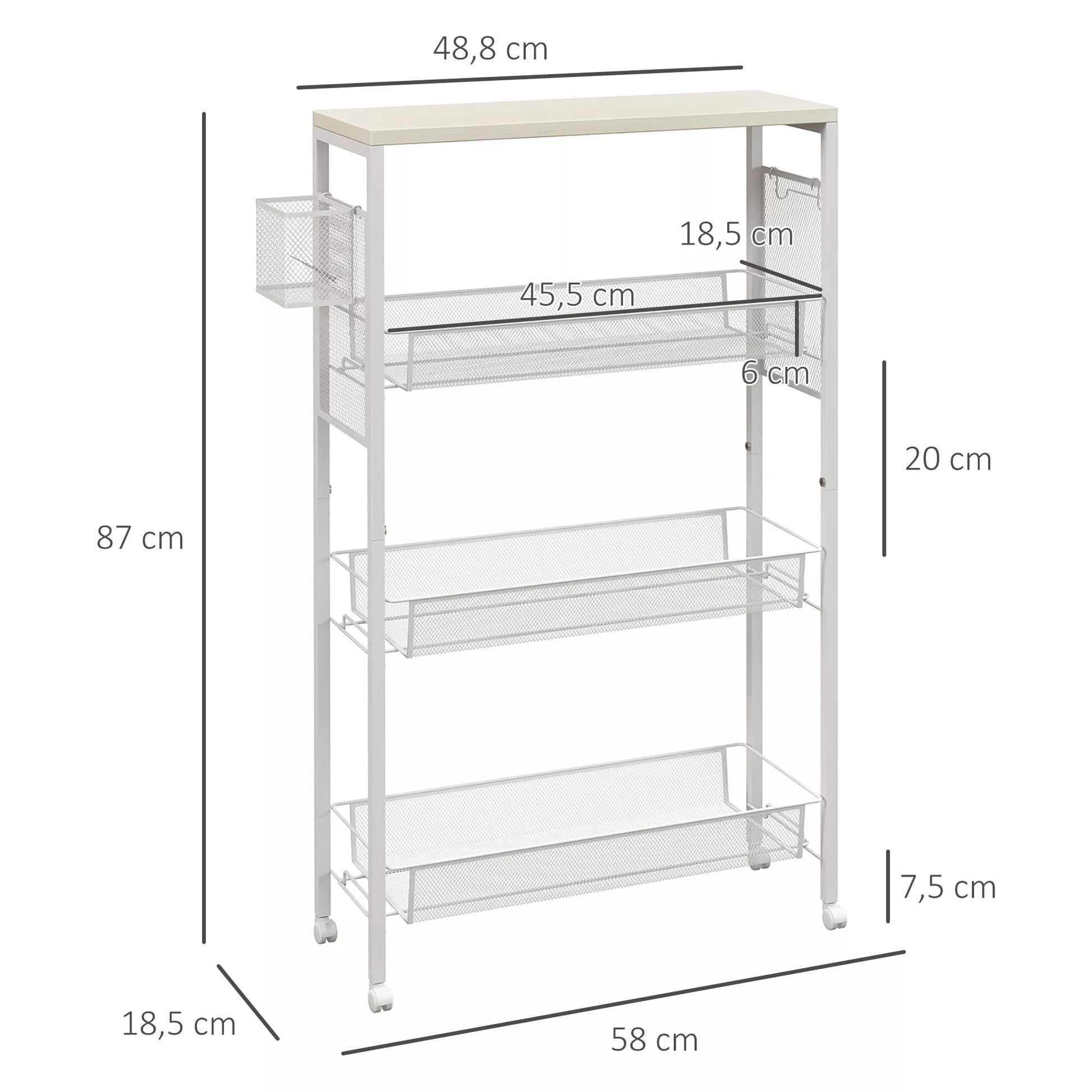 Siauras vežimėlis, universalus virtuvinis vežimėlis, 3 lentynos, kabliukai, 58 cm x 18,5 cm x 87 cm, baltas