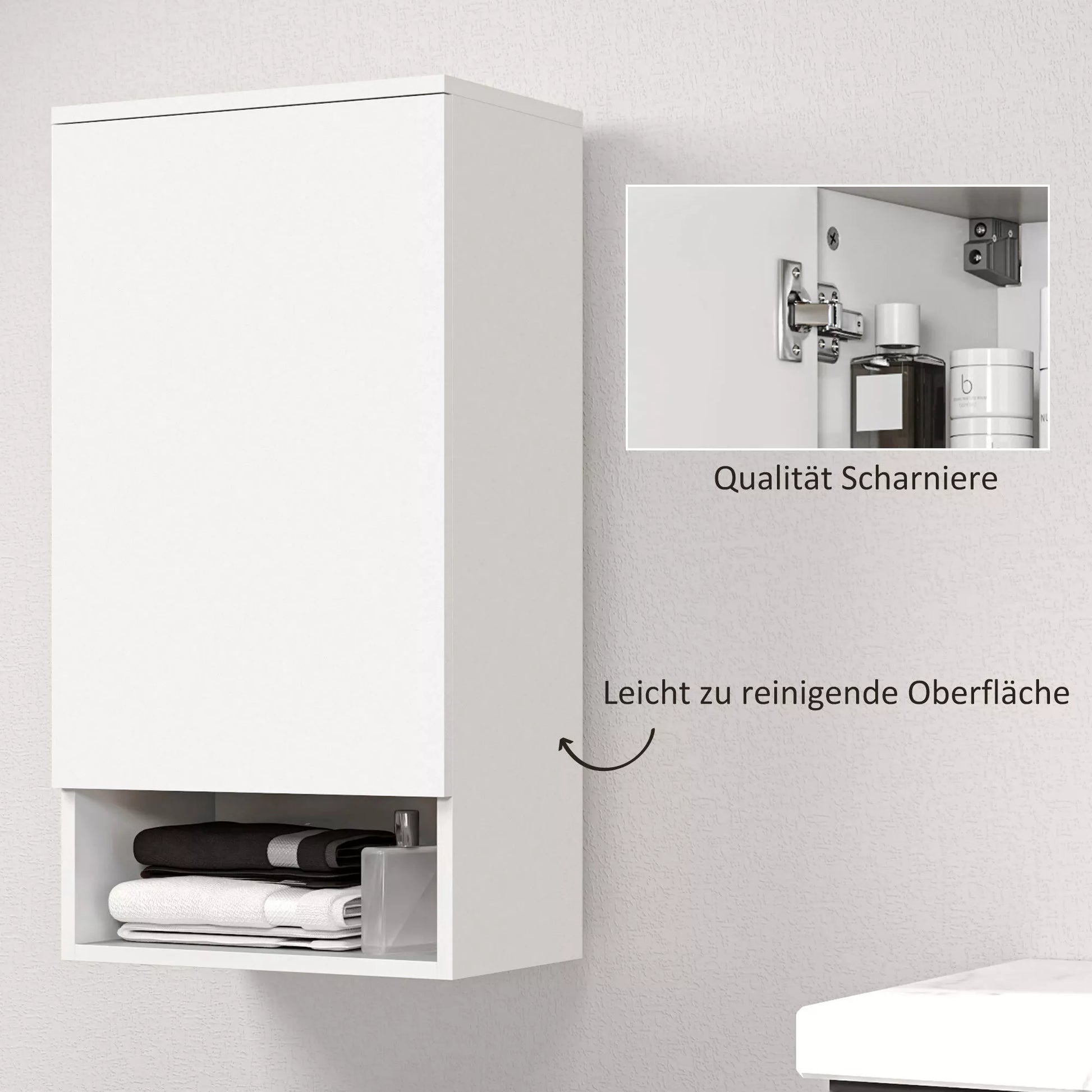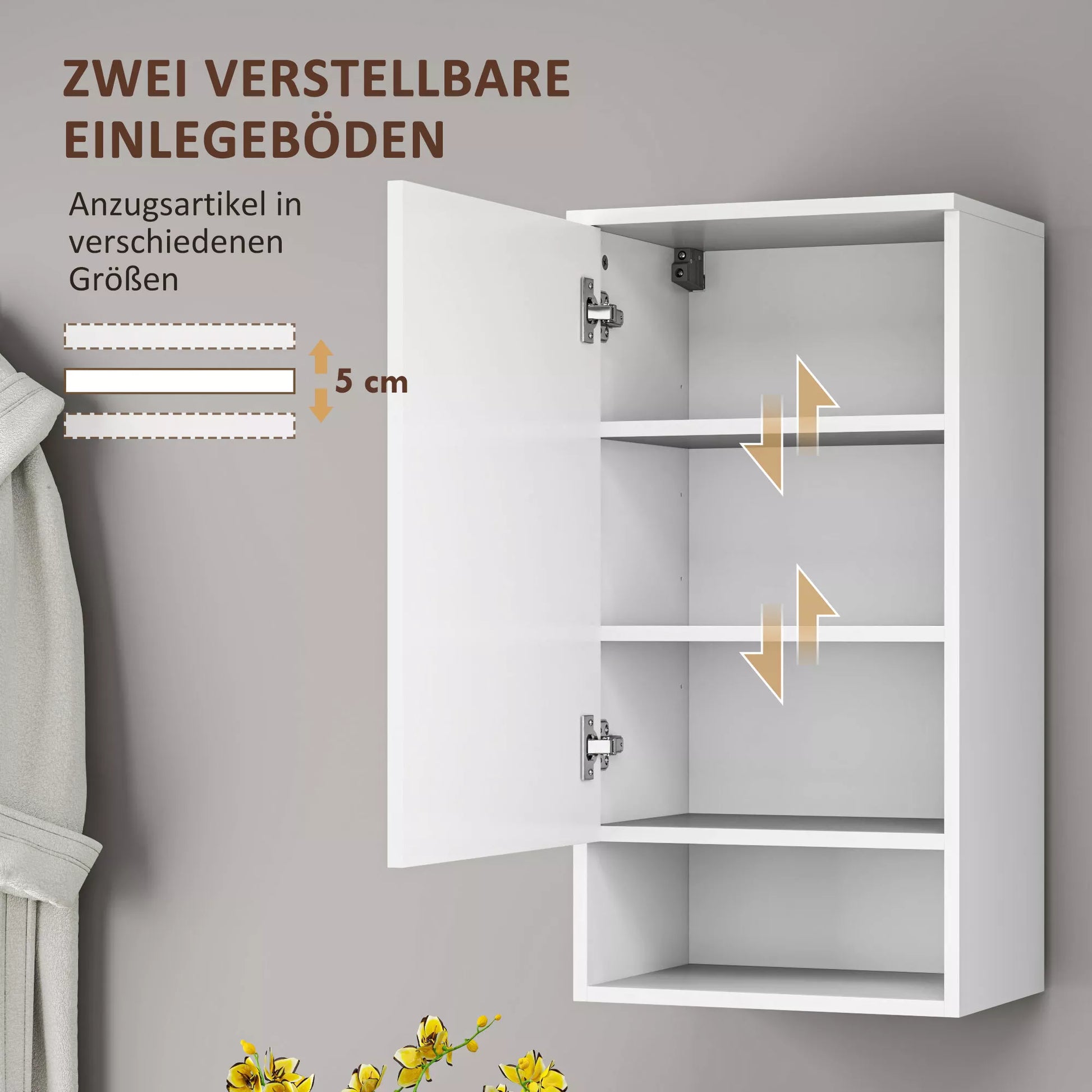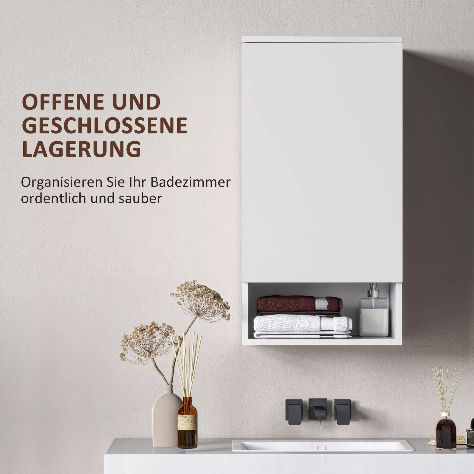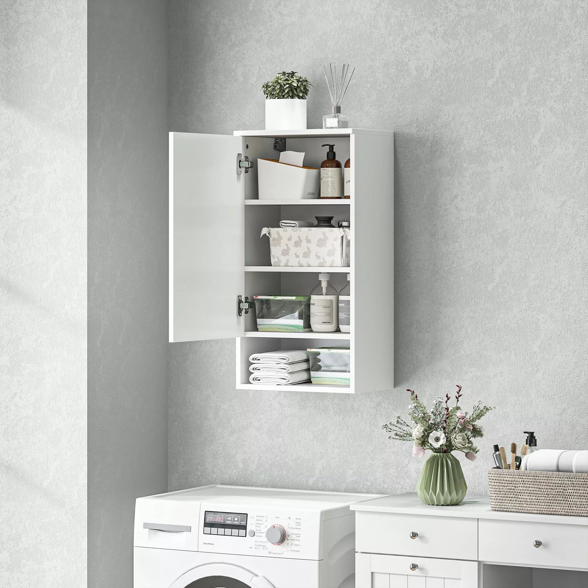 Sieninė vonios spintelė, vonios kambario sieninė spintelė su reguliuojamomis lentynomis, atviru skyriumi, medinė, balta