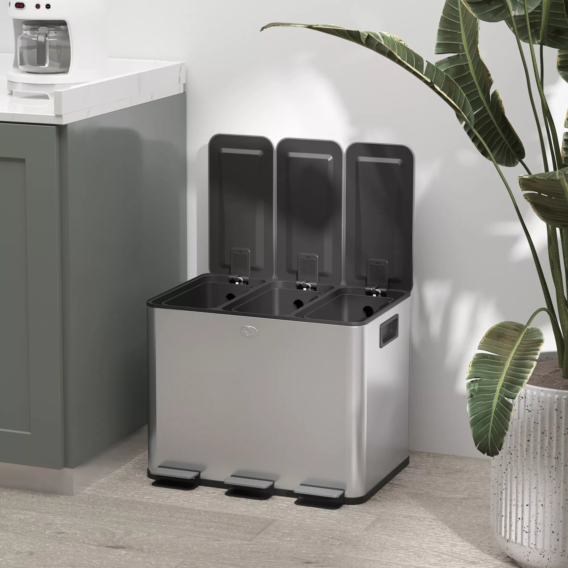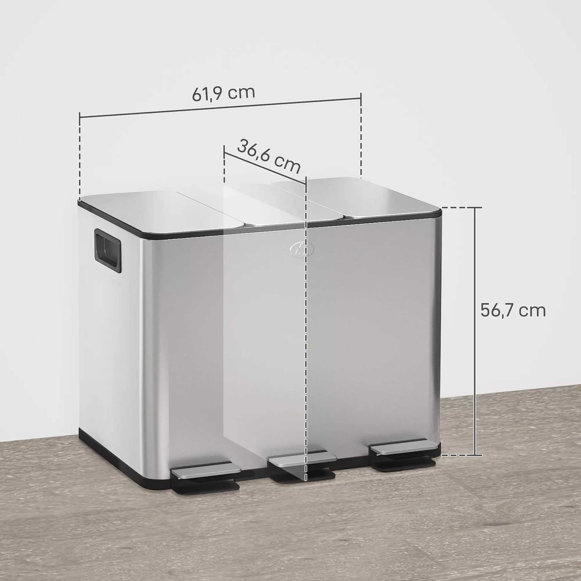 Saugokite savo virtuvę stilingai ir bekvapiai su šiuo šiukšliadėžės. Ši triguba šiukšliadėžė turi tris 20L skyrius ir įmontuotus dezodorantų dėklus (dezodorantai nepridedami), kovojančius su kvapais. Elegantiškas, pirštų antspaudams atsparus nerūdijančio plieno dizainas užtikrina nepriekaištingą išvaizdą. Tyliai, švelniai užsidarantys dangčiai su patogiais pedalais ir išimami vidiniai kibirai leidžia lengvai išmesti šiukšles. Puikiai tinka bet kuriai judriai virtuvei!