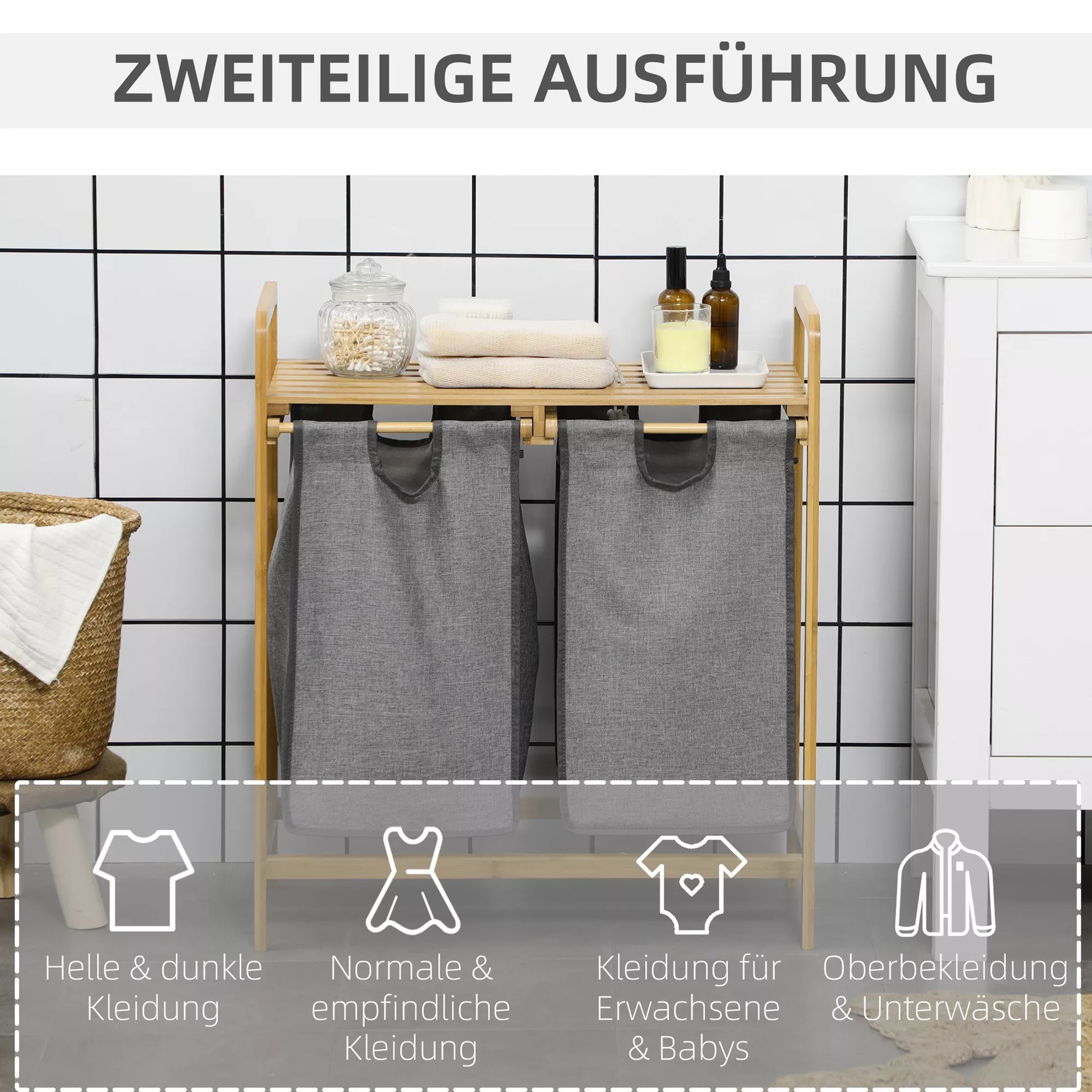 Skalbinių surinkėjas skalbinių krepšys, 2 skalbinių maišai, 2 rankenos, bambukas, 63,5 x 33 x 73 cm, pilka + natūrali spalva