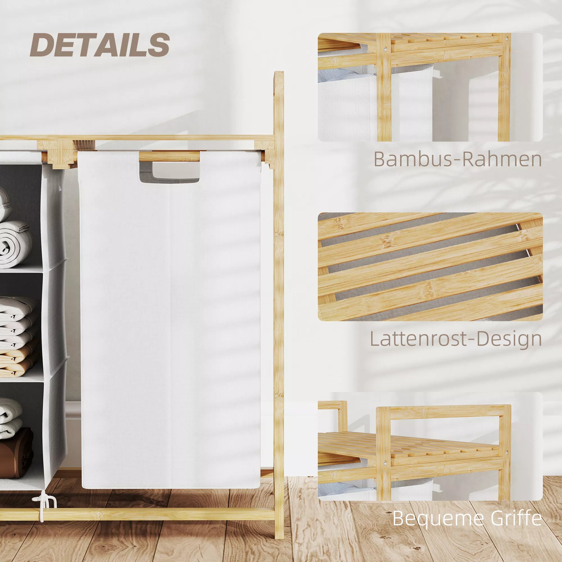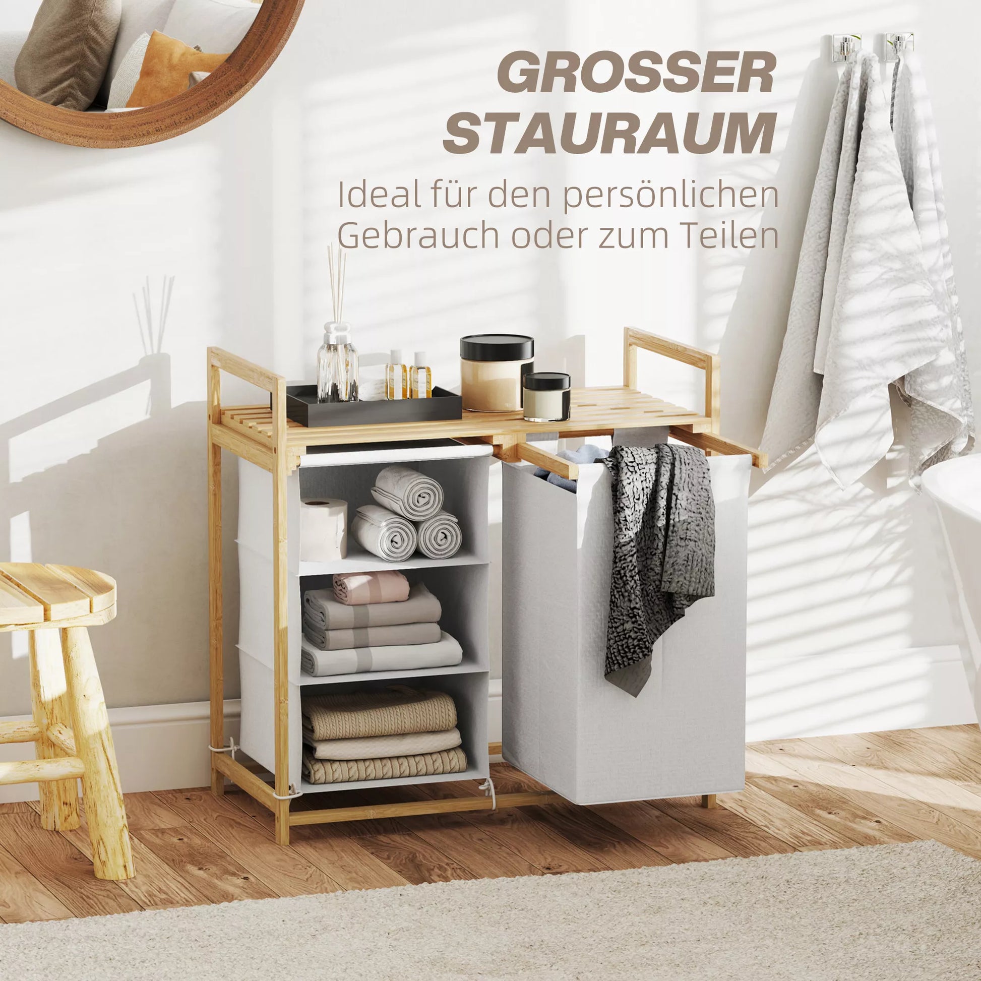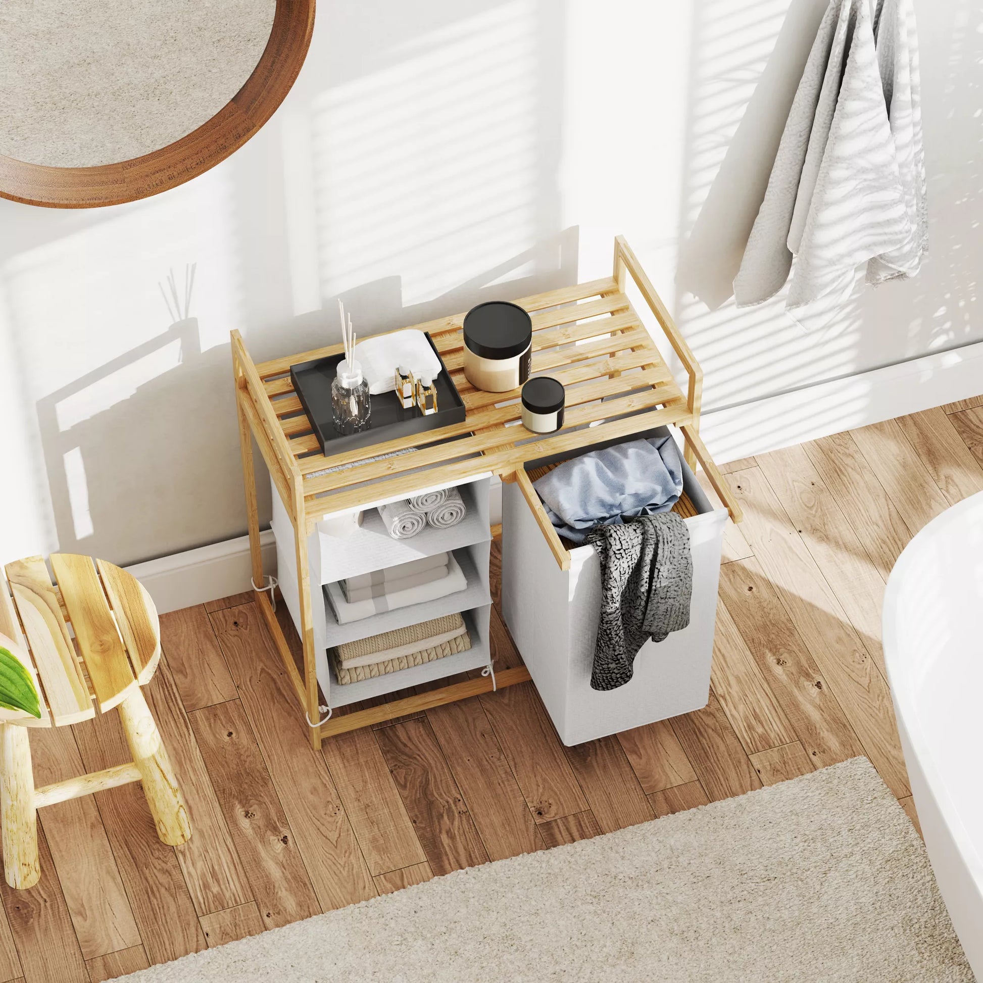 Patobulinkite savo skalbimo rutiną su skalbinių krepšiu su lentyna! Šis stilingas nešvarių skalbinių stovas turi ištraukiamą skalbinių maišą ir audinio stalčių, leidžiantį be pastangų rūšiuoti skalbinius. Rūšiuojančiojo stalčius netgi turi tris skyrelius jūsų skalbimo priemonėms ir minkštikliams. Viršutinė lentynos zona suteikia papildomos vietos viskam, ko jums reikia. Elegantiškas bambuko rėmas suteikia bet kokiam kambariui natūralaus stiliaus dvelksmą.