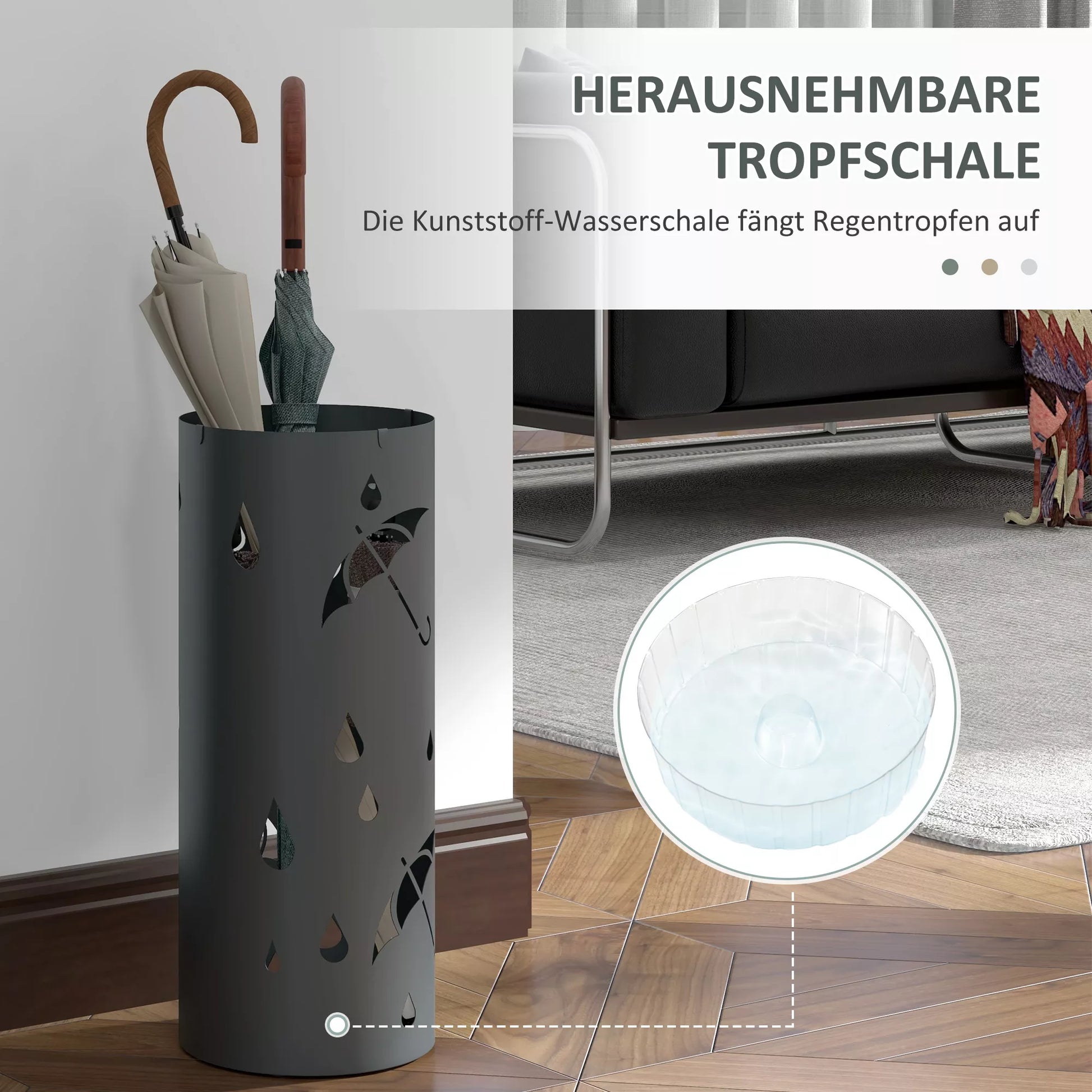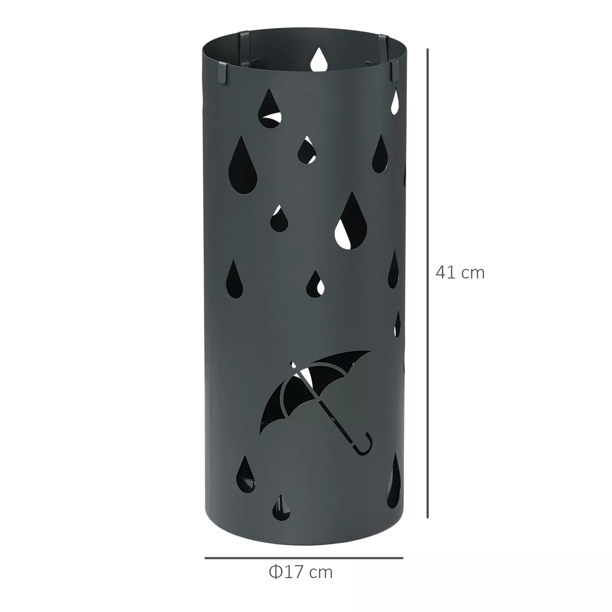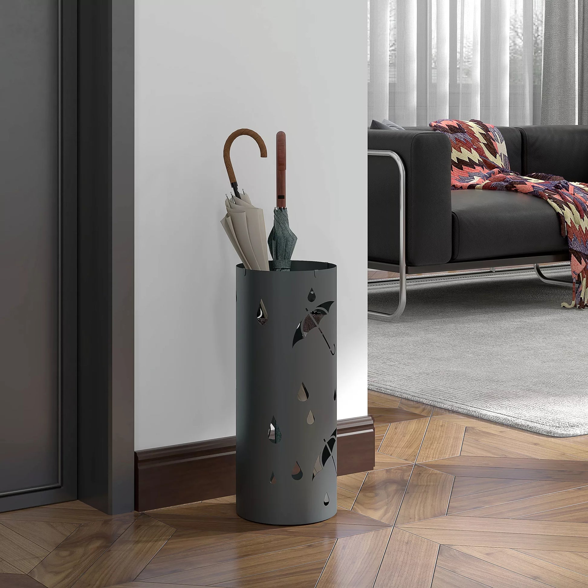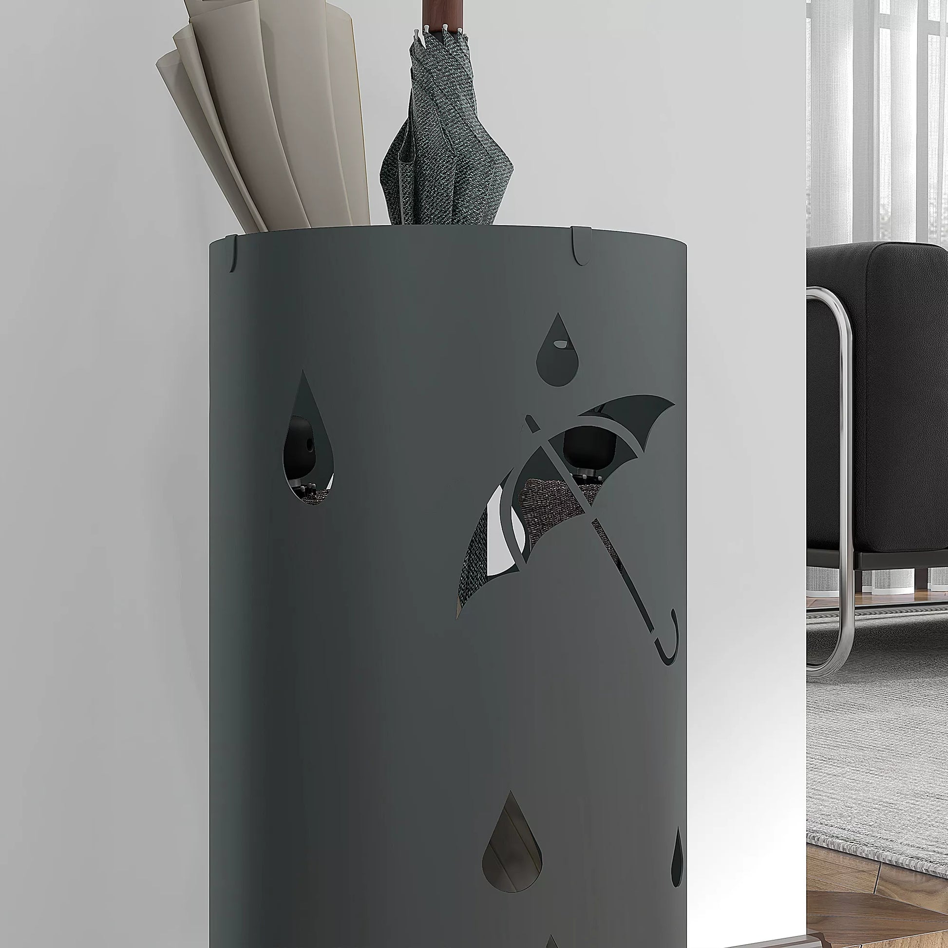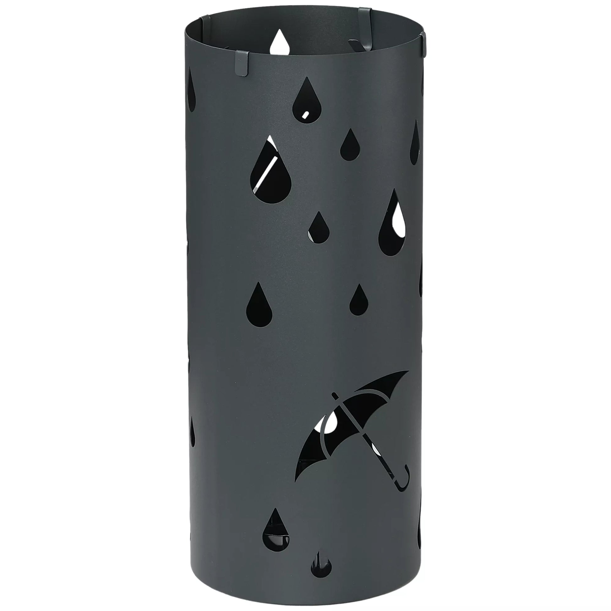 Lietingomis dienomis pravers skėčiai. Šis elegantiškas [BRAND NAME] skėčių stovas derina dizainą ir praktiškumą, suteikdamas skėčiams specialią vietą ir kartu atrodydamas stilingai. Jis pagamintas iš cinkuoto plieno, yra tvirtas ir atsparus rūdims. Jo matmenys Ø17 x 41H cm, jame telpa du dideli skėčiai ir yra keturi kabliukai mažesniems. Komplekte yra nuimamas padėklas, skirtas lengvai išpilti skysčius.