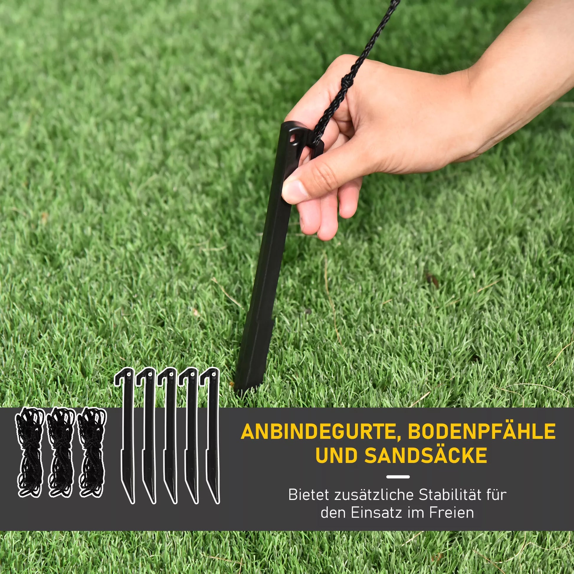 - ✔ Žemės kuoliukai ir tvirtinimo virvės užtikrina tvirtumą