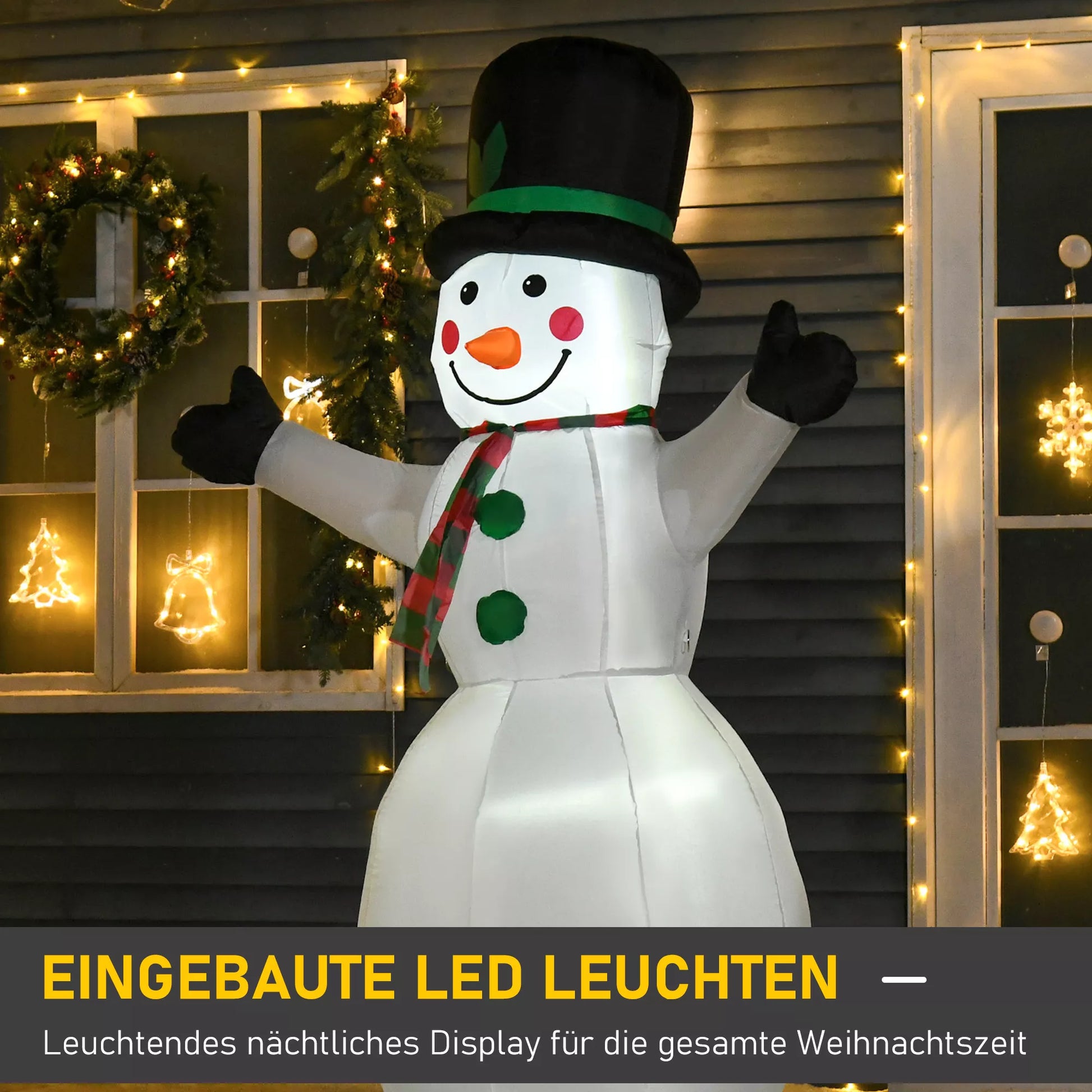 Sukurkite nepaprastą, šventišką Kalėdų dekoraciją savo sode su dideliu, 1,93 m dydžio pripučiamu sniego seniu iš [BRAND NAME], apsirengusiu pirštinėmis, kepure ir šaliku. Sniego senis pagamintas iš itin patvaraus poliesterio ir turi baltą LED apšvietimą, kuris sukurs šventišką akcentą jūsų sode.