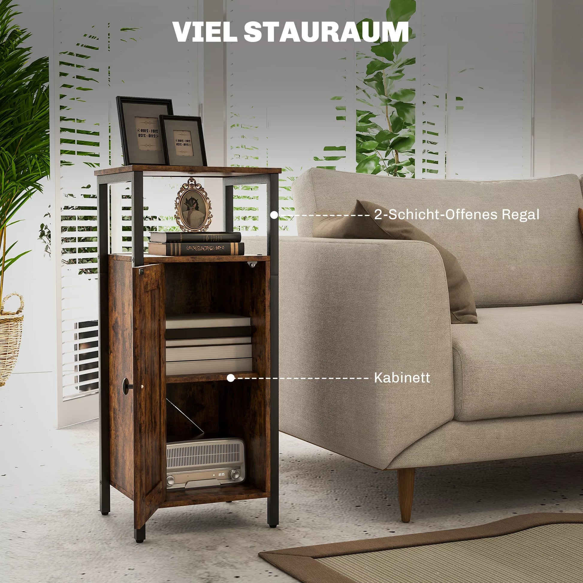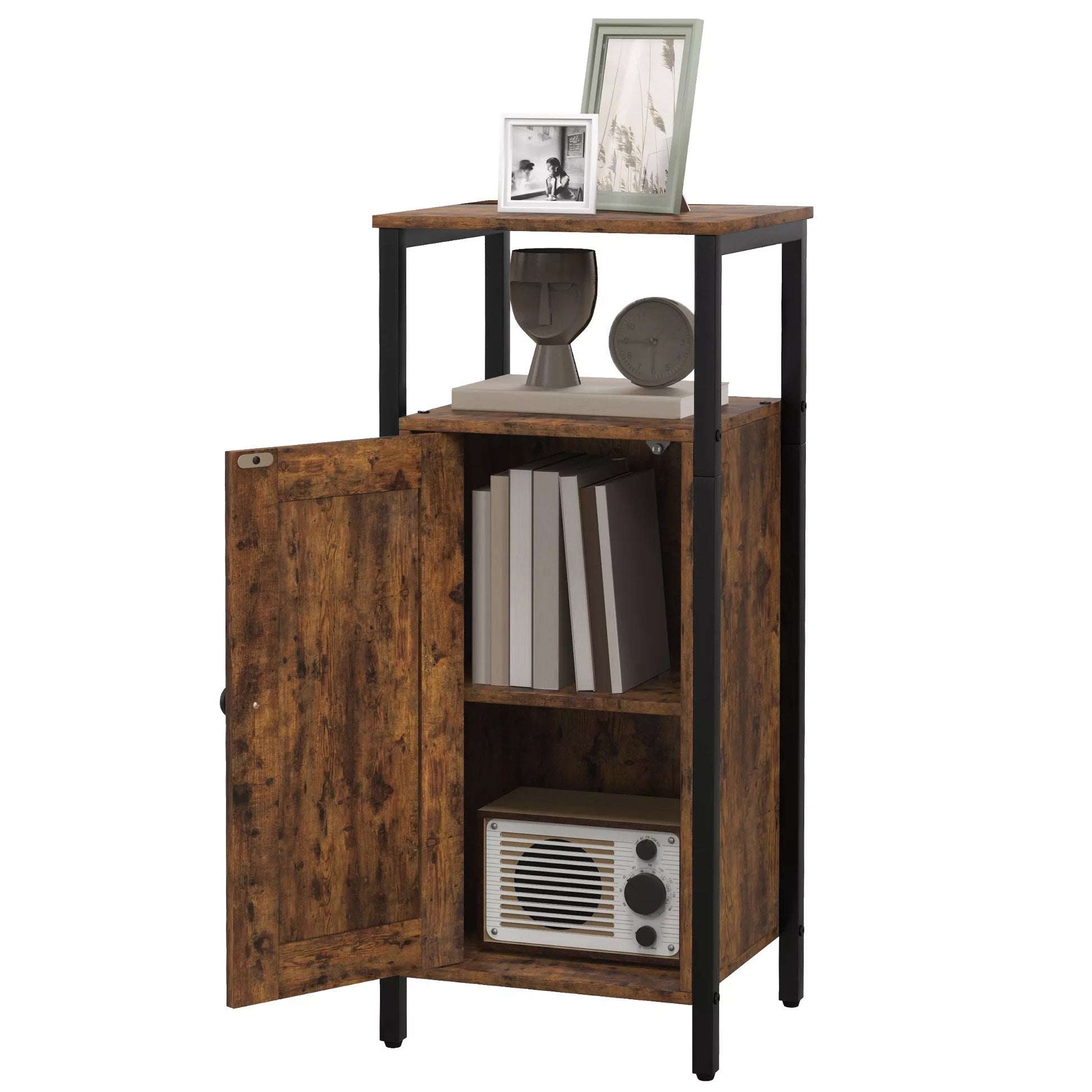 Patirkite šio staliuko-spintelės žavesį, kuriame praktiškumas dera su industriniu stiliumi. Erdvi spintelė su dviejų lygių atviru viršutiniu skyriumi ir viduje esančia, trimis lygiais reguliuojama lentyna puikiai tinka kasdieniams daiktams diskretiškai laikyti. Magnetinės durys ir apvalus rankenėlė suteikia jam elegancijos, todėl jis puikiai tiks kaip madingas pagrindinis staliukas ar siauras naktinis staliukas bet kuriame jaukiai įrengtame kampelyje.
