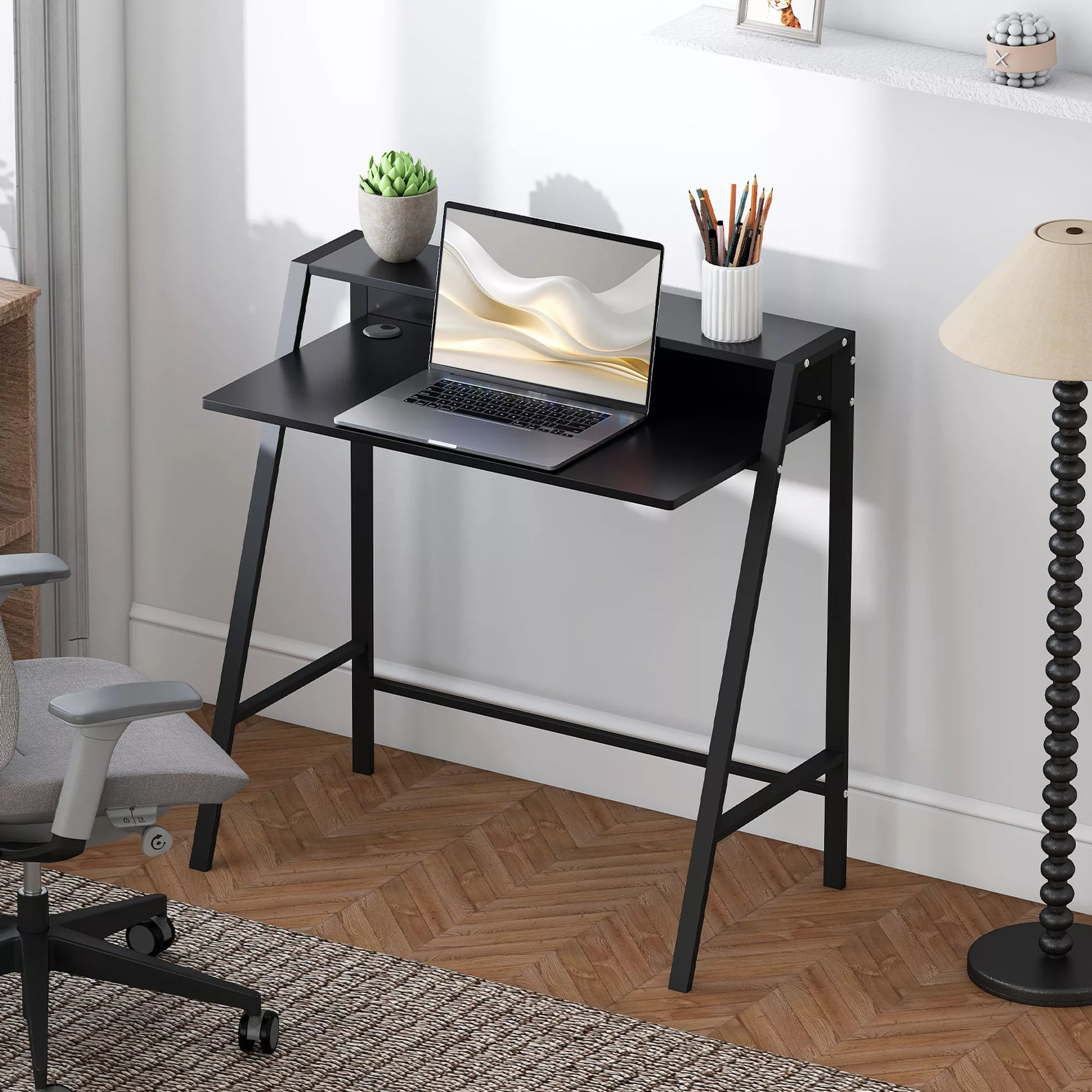 Rašomasis stalas, kompiuterio stalas su lentyna ir kabelių valdymo sistema, modernus rašomasis stalas su metaliniu rėmu darbo kambariui, miegamajam, namų biurui, 84 x 45 x 85 cm, juodas
