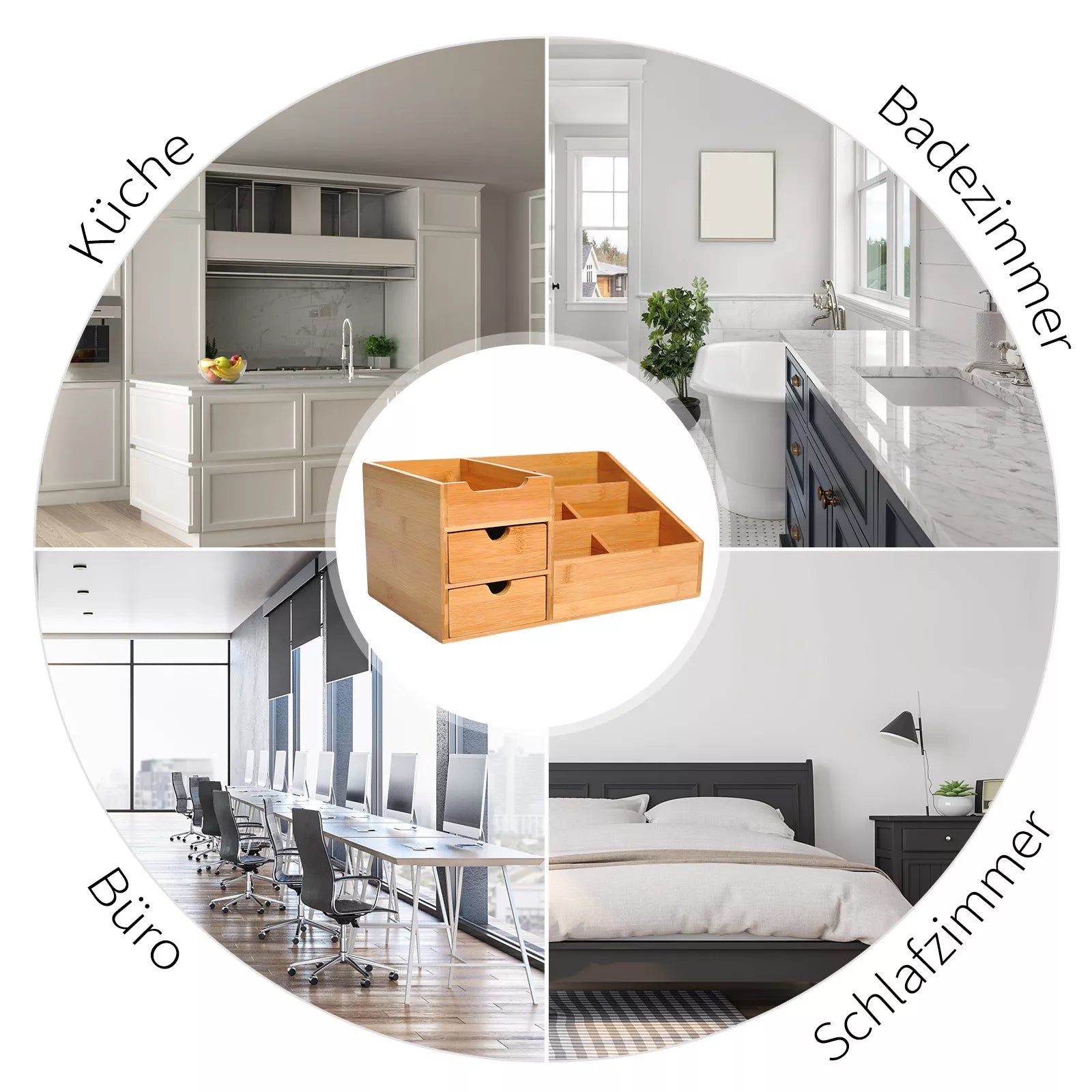Pagaliau tvarkingai! Su šiuo praktišku organizatoriumi Jūsų stalas išliks tvarkingas. Jame, dėka 2 didelių stalčių ir 7 skyrių, visi biuro reikmenys ras savo vietą ir bus lengvai randami, kai jų prireiks. Bambukas yra tvirtas natūralus produktas, o dėl aukštos kokybės apdirbimo organizatorius yra ypač ilgaamžis. Natūrali bambuko spalva suteikia jaukaus ir modernaus dizaino. Organizatorius puikiai tinka kaip dovana chaoso mėgėjams arba savo stalui tvarkyti.