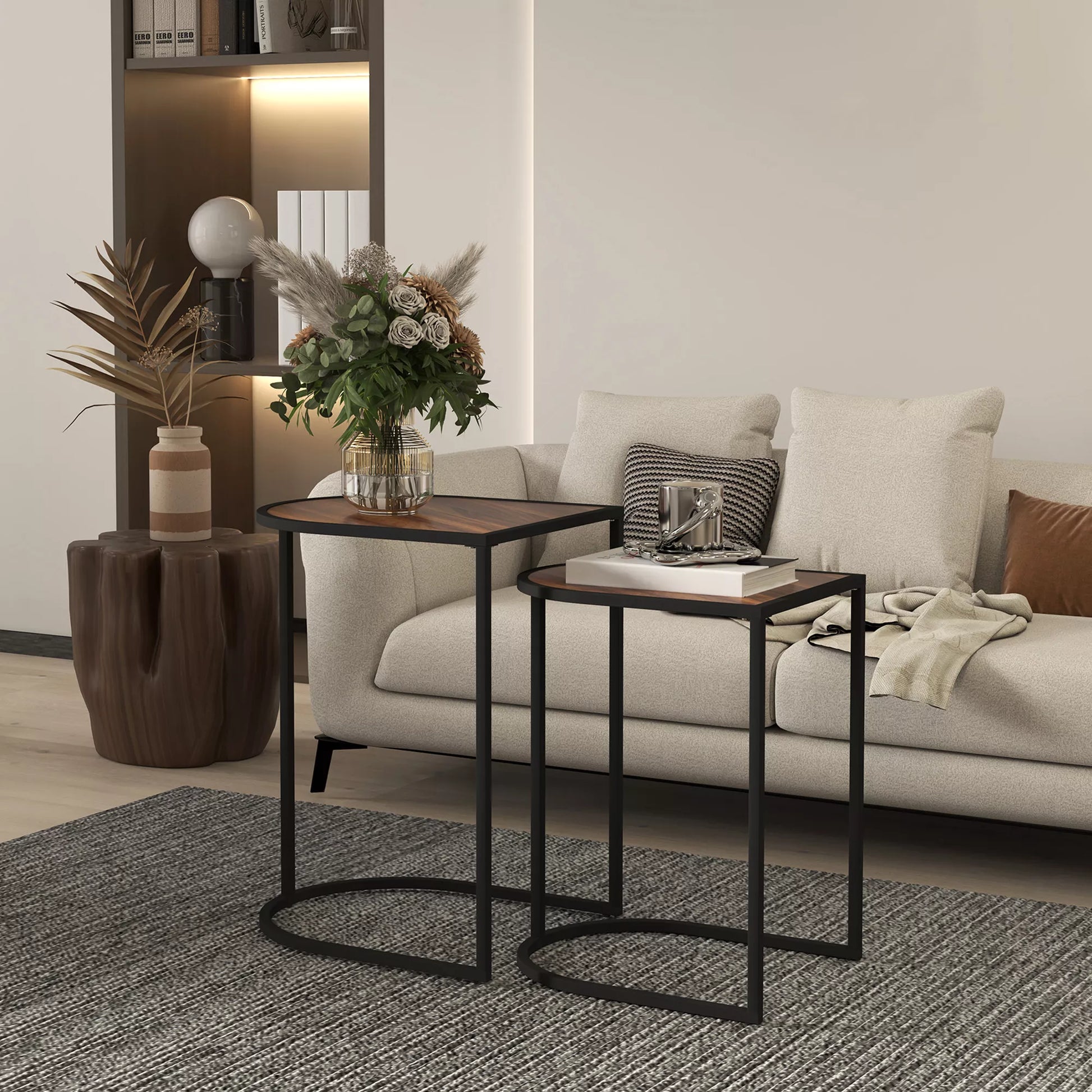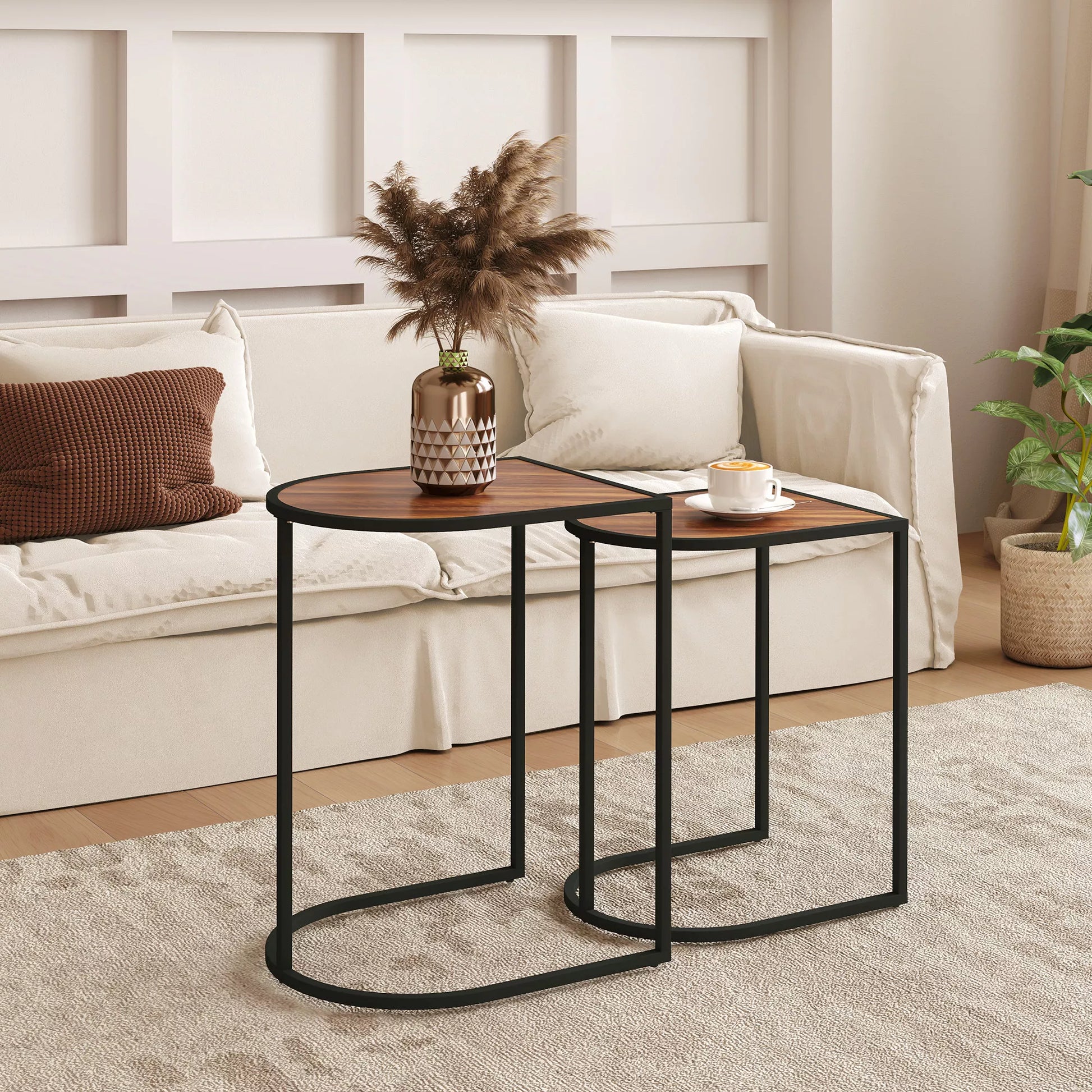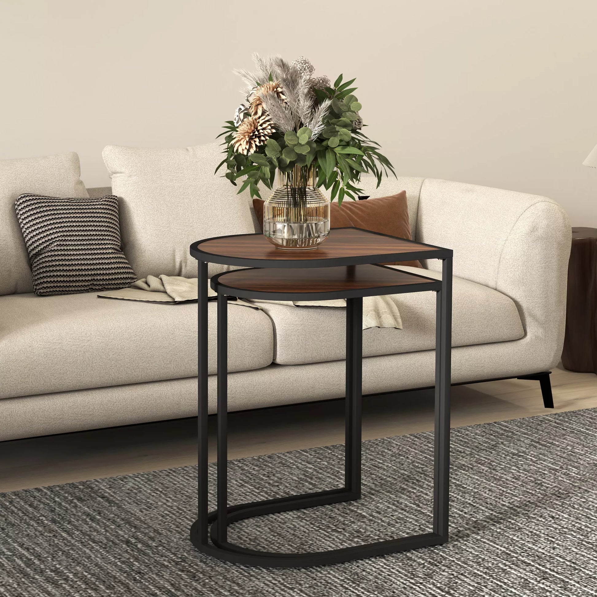Patirkite kavos staliukų komplektą, kuris sklandžiai įsilieja į bet kokią aplinką. Nesvarbu, ar naudojate juos kaip vieną į kitą statomus kavos staliukus, ar atskirai kaip staliukus prie sofos ir naktinius staliukus – šie svetainės staliukai yra universalūs. Su pasvirusiais, tekstūruotais stalviršiais ir tvirtomis juodomis plieninėmis kojomis jie suteikia minimalistinį kontrastą ir yra elegantiškas jūsų svetainės priedas.