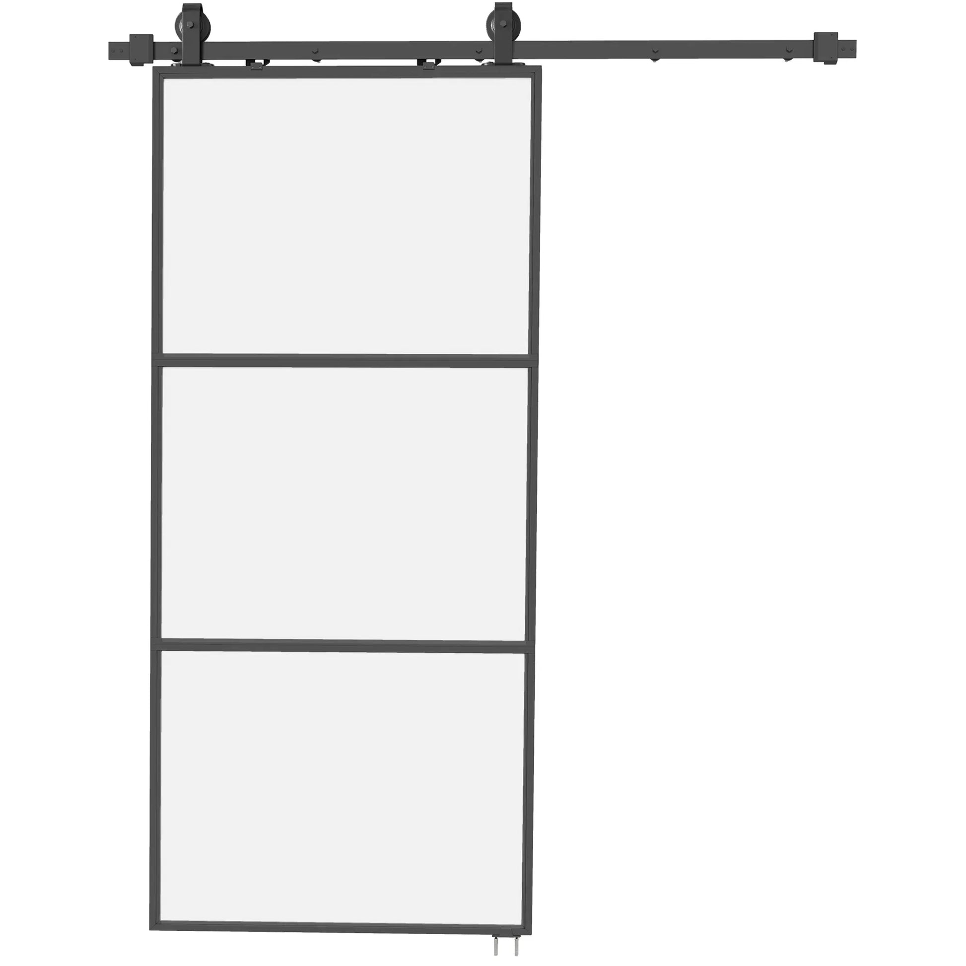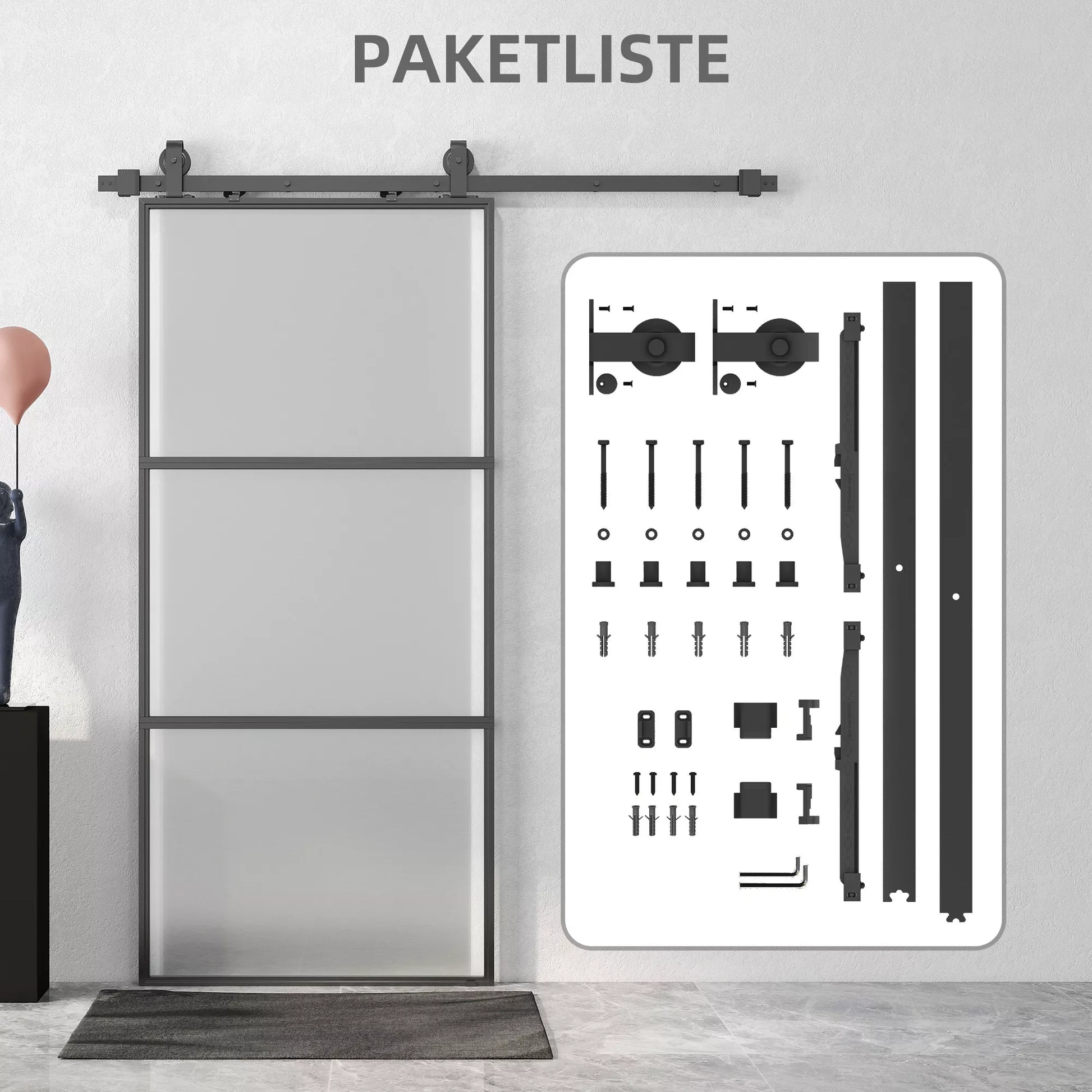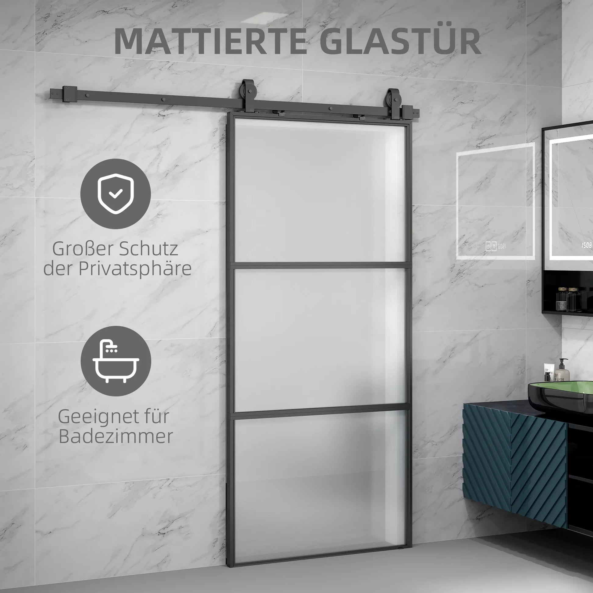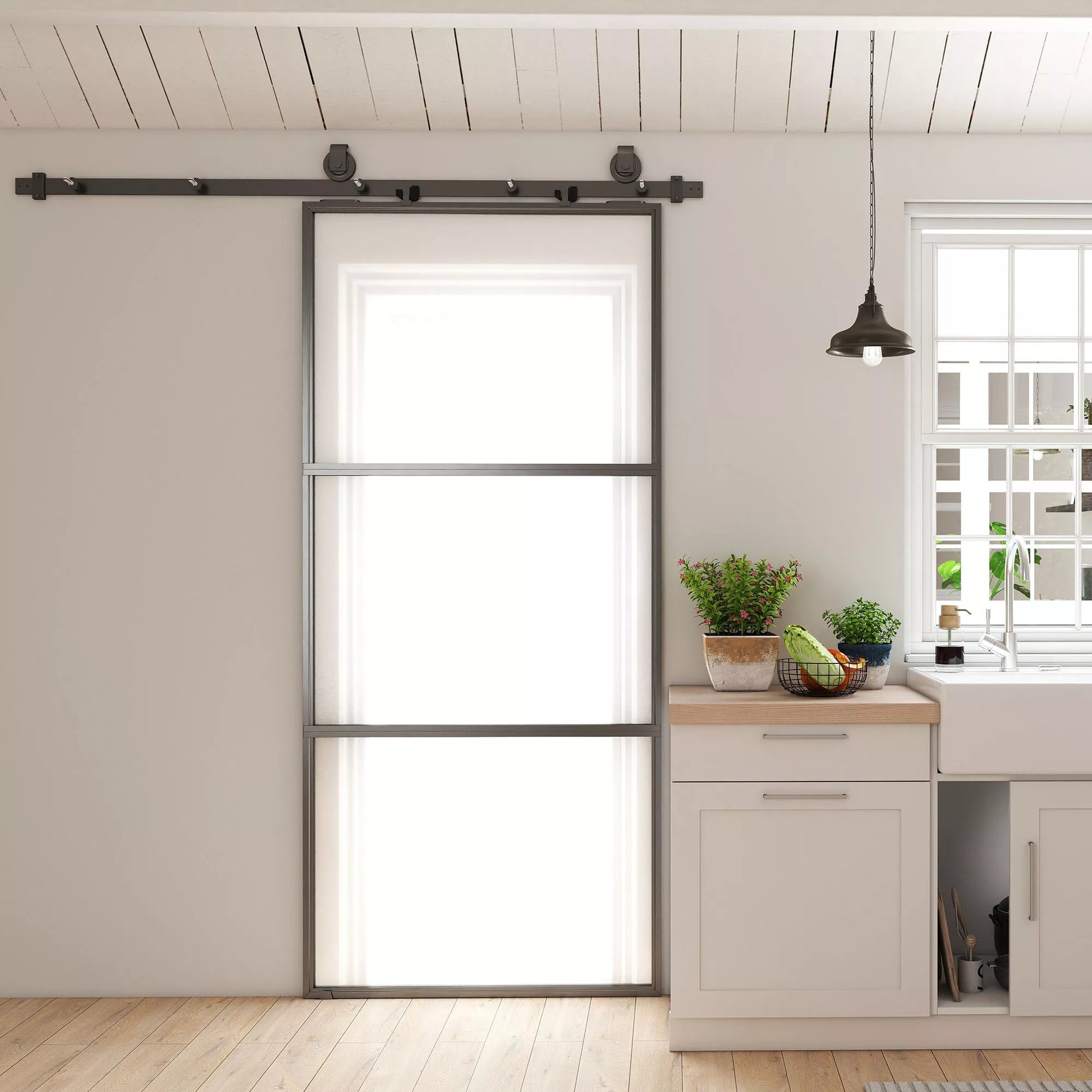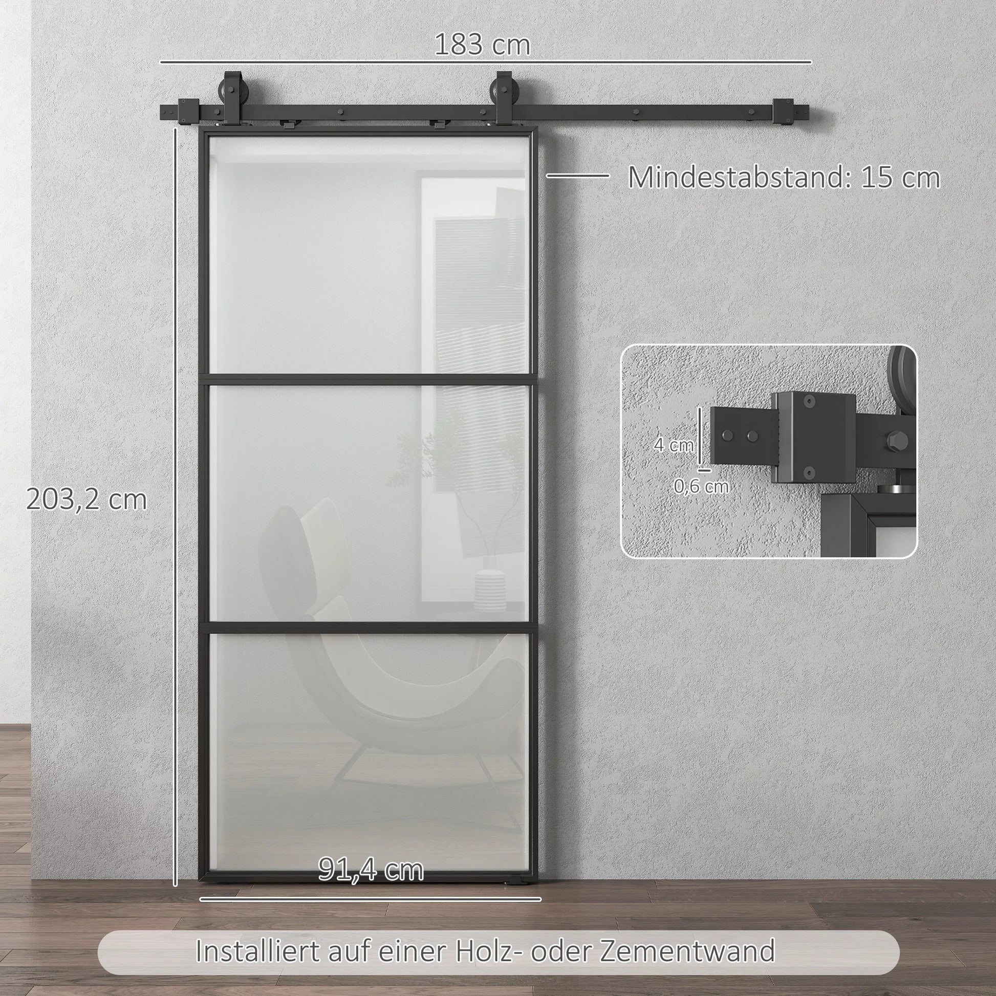 Stumdomosios durys su matinio stiklo, bėgių sistema, montavimo komplektas, švelnaus uždarymo mechanizmas, lengvas surinkimas, plienas, juodos spalvos
