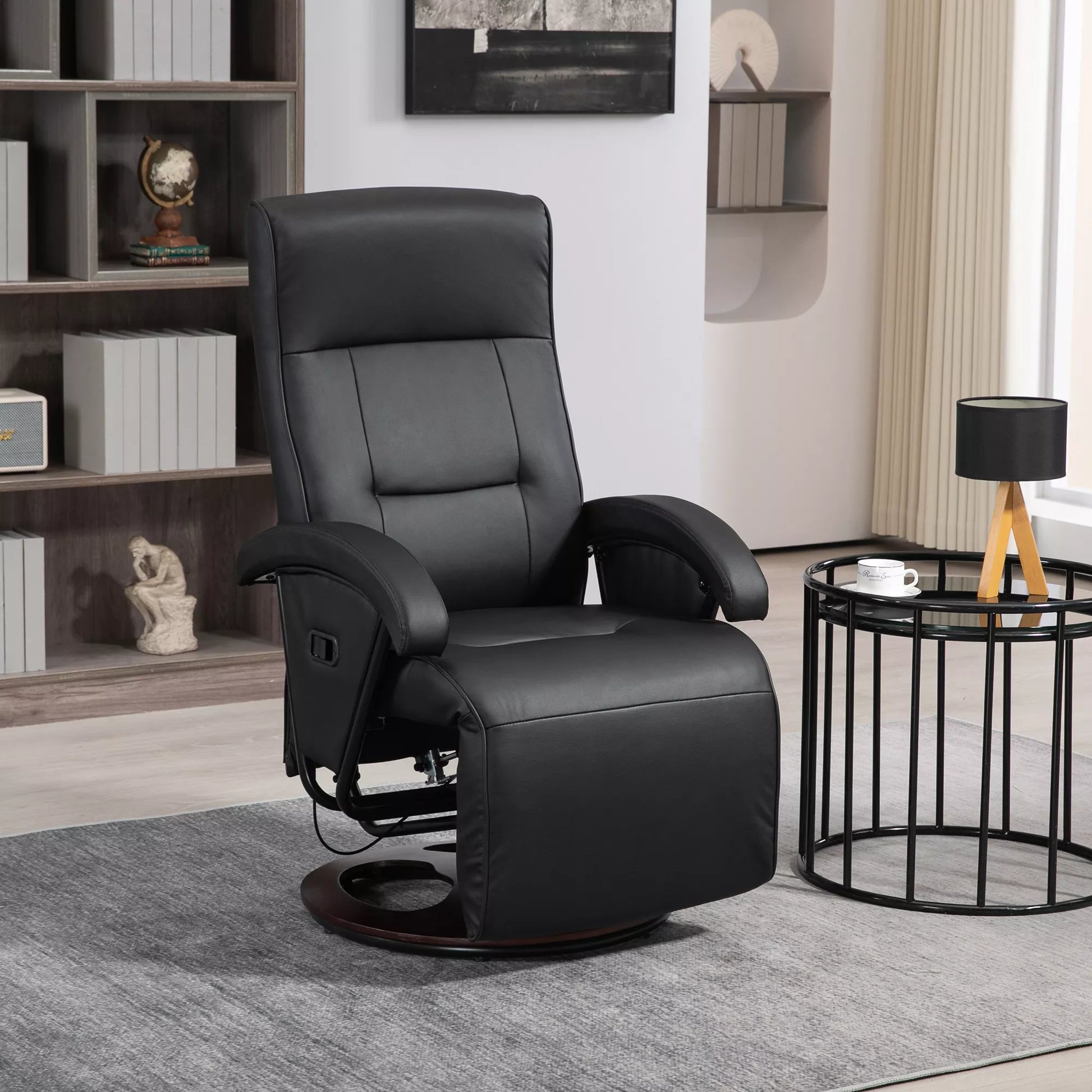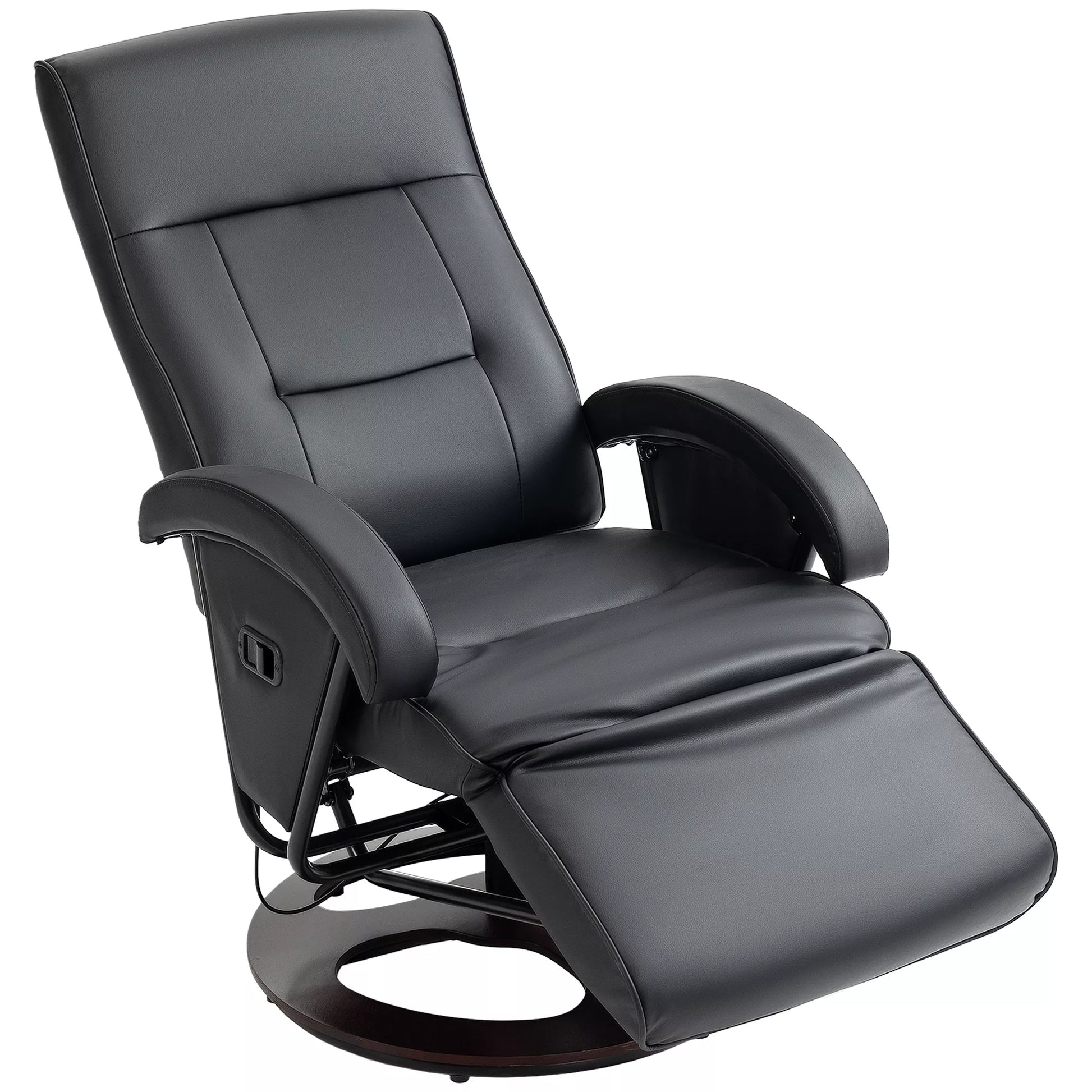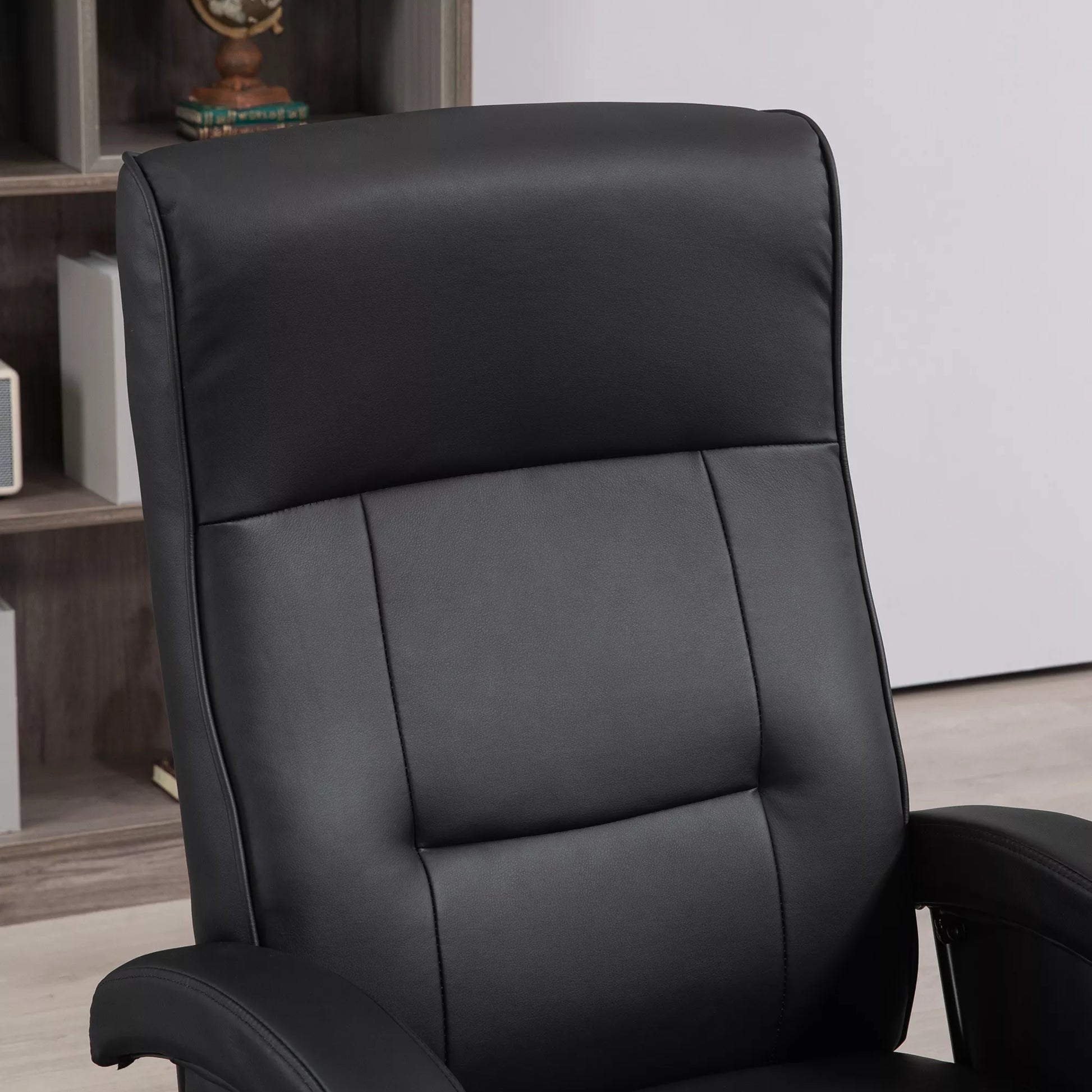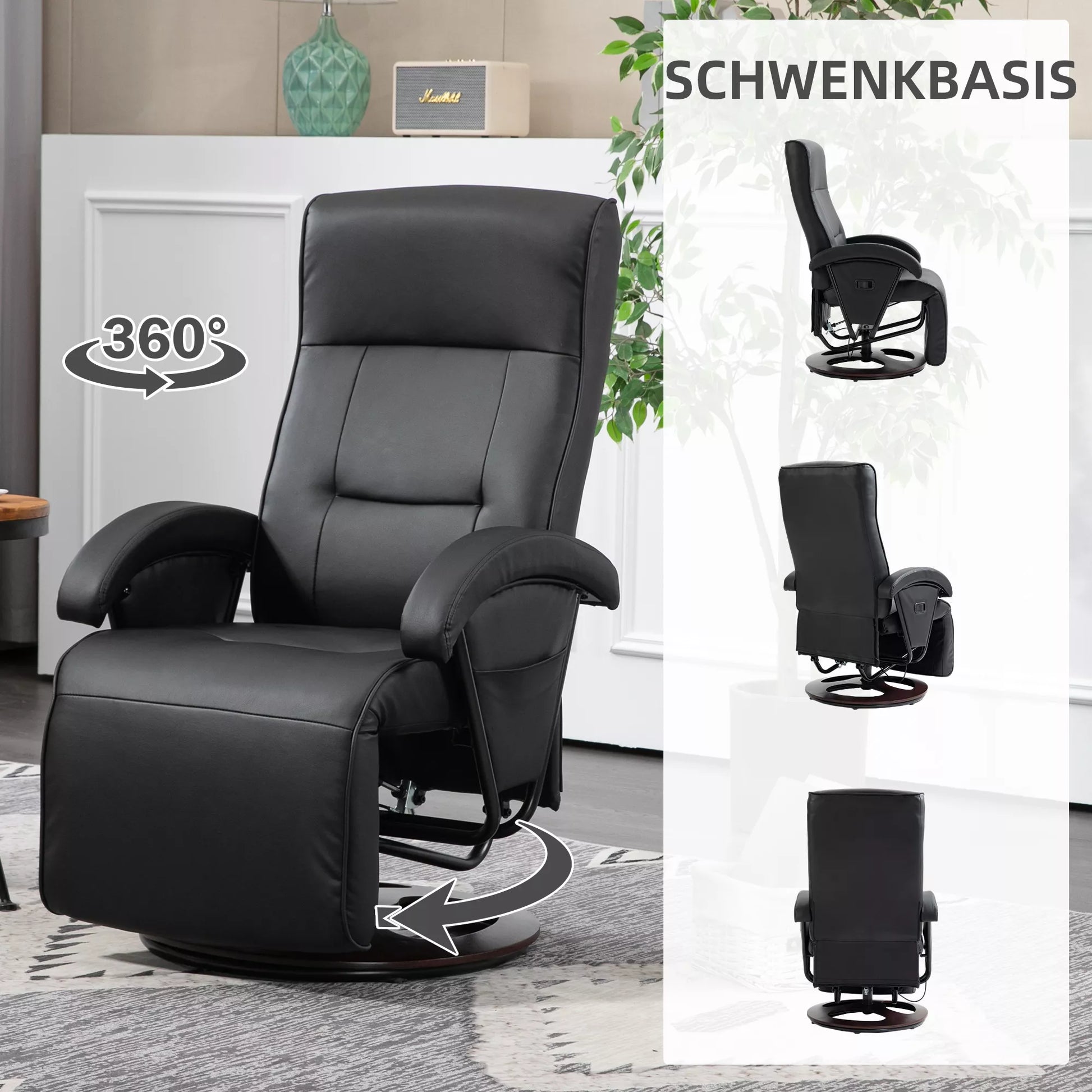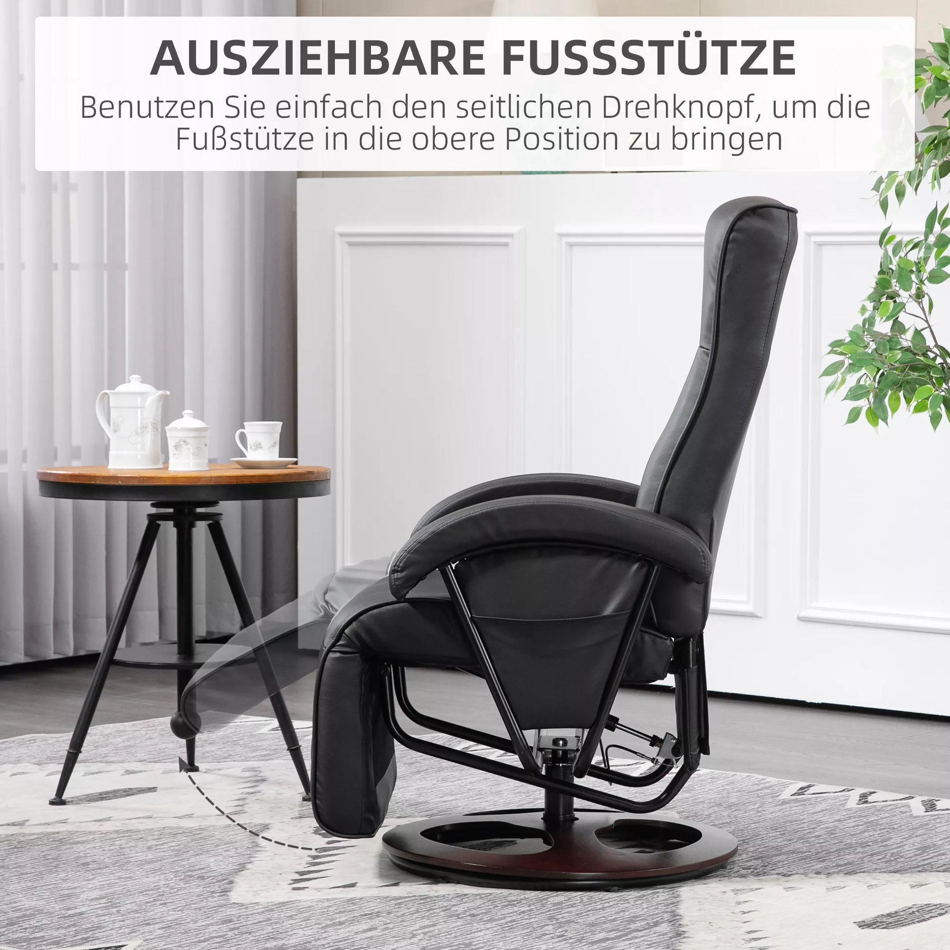 Sukamasis paminkštintas krėslas, dirbtinė oda, atrama kojoms, medinis pagrindas, reguliuojamas atlošas, juodas