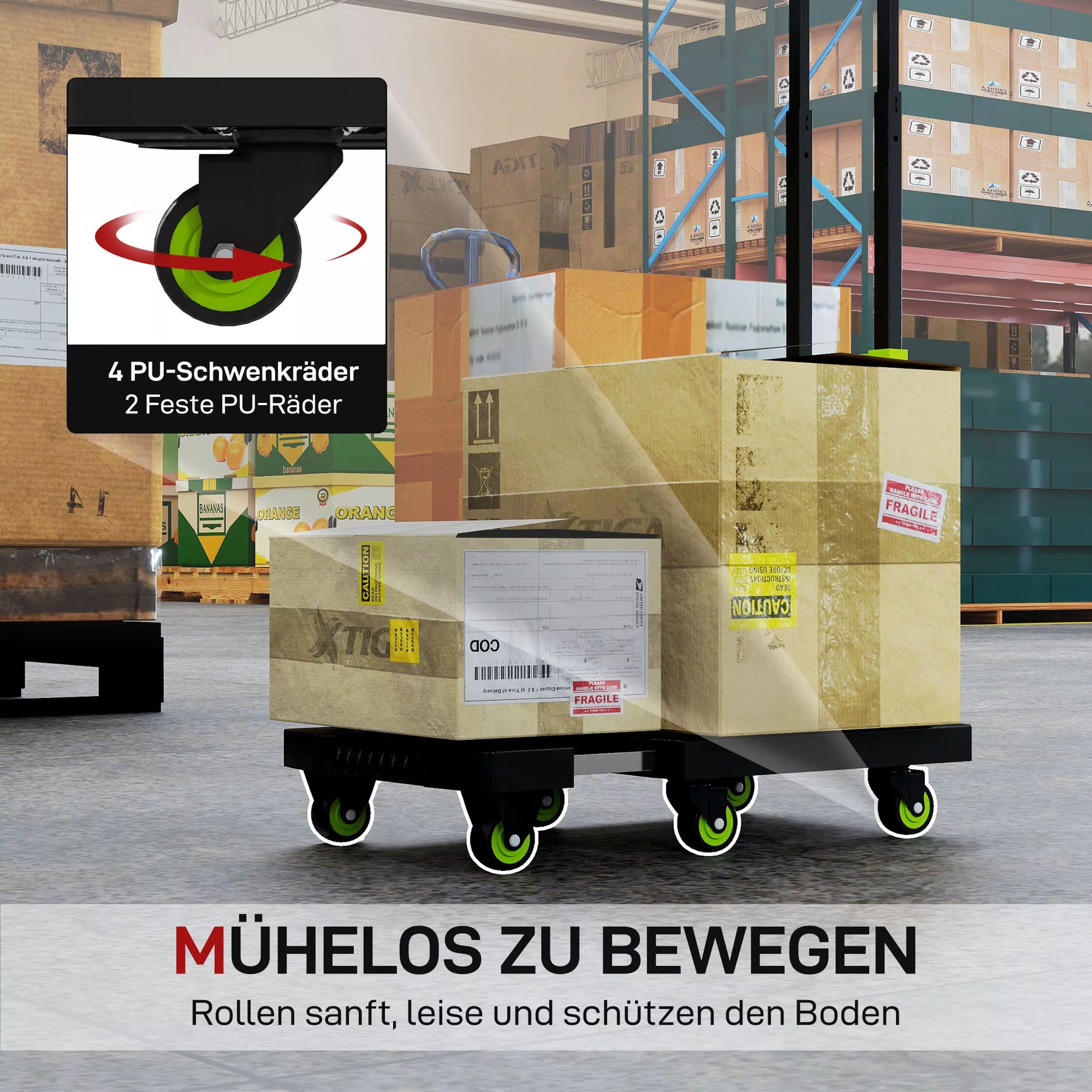 - ✔ Keturi manevringi ir du fiksuoti sulankstomo transportavimo vežimėlio ratukai užtikrina sklandų, stabilų manevravimą