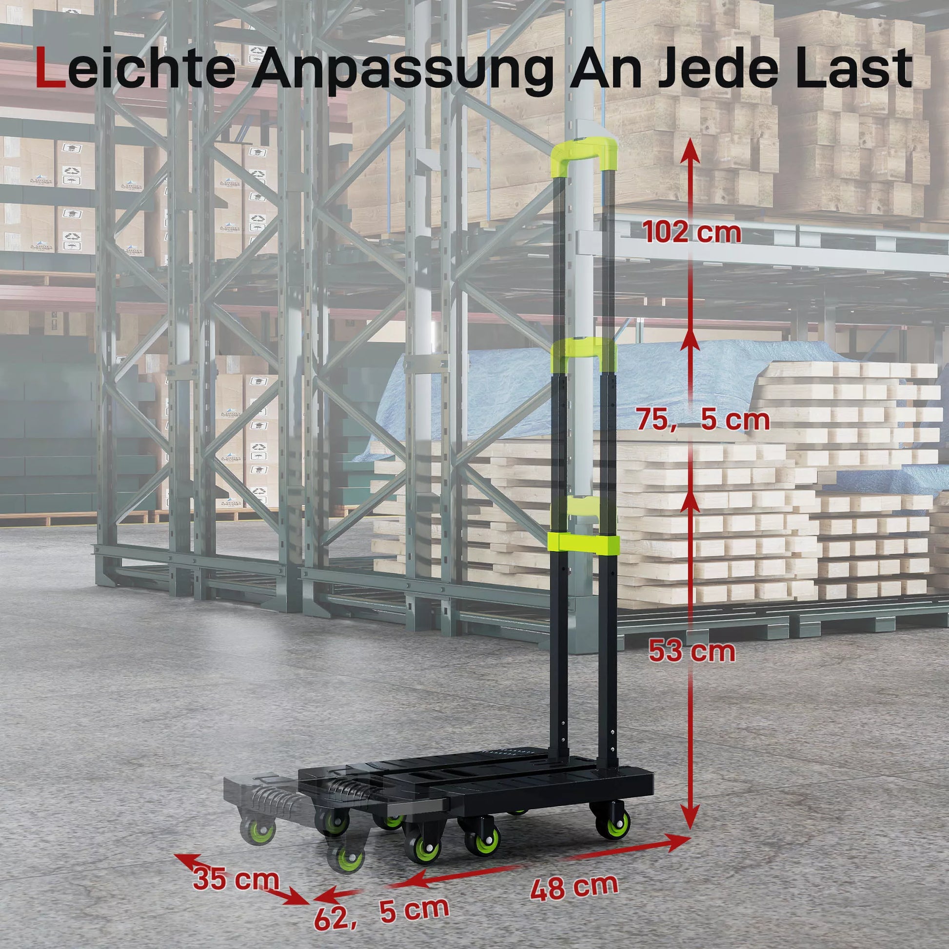 - ✔ Sulankstomo rankinio vežimėlio bazė praplečiama nuo 48 cm iki 62,5 cm, užtikrinant stabilumą didelio dydžio kroviniams