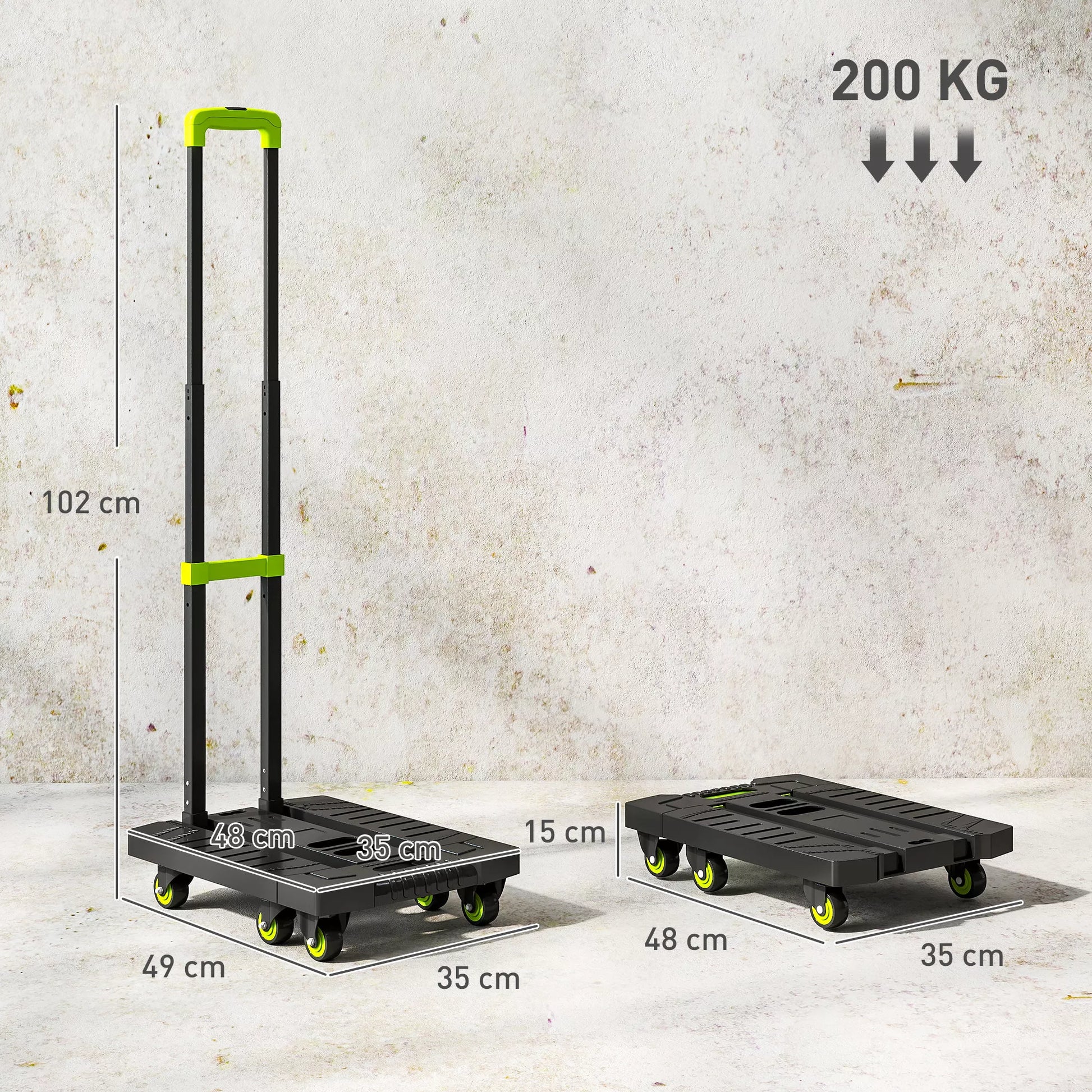 Sulankstomas metalinis transportavimo vežimėlis su ratukais ir reguliuojama rankena, 49 x 35 x 102 cm, žalias