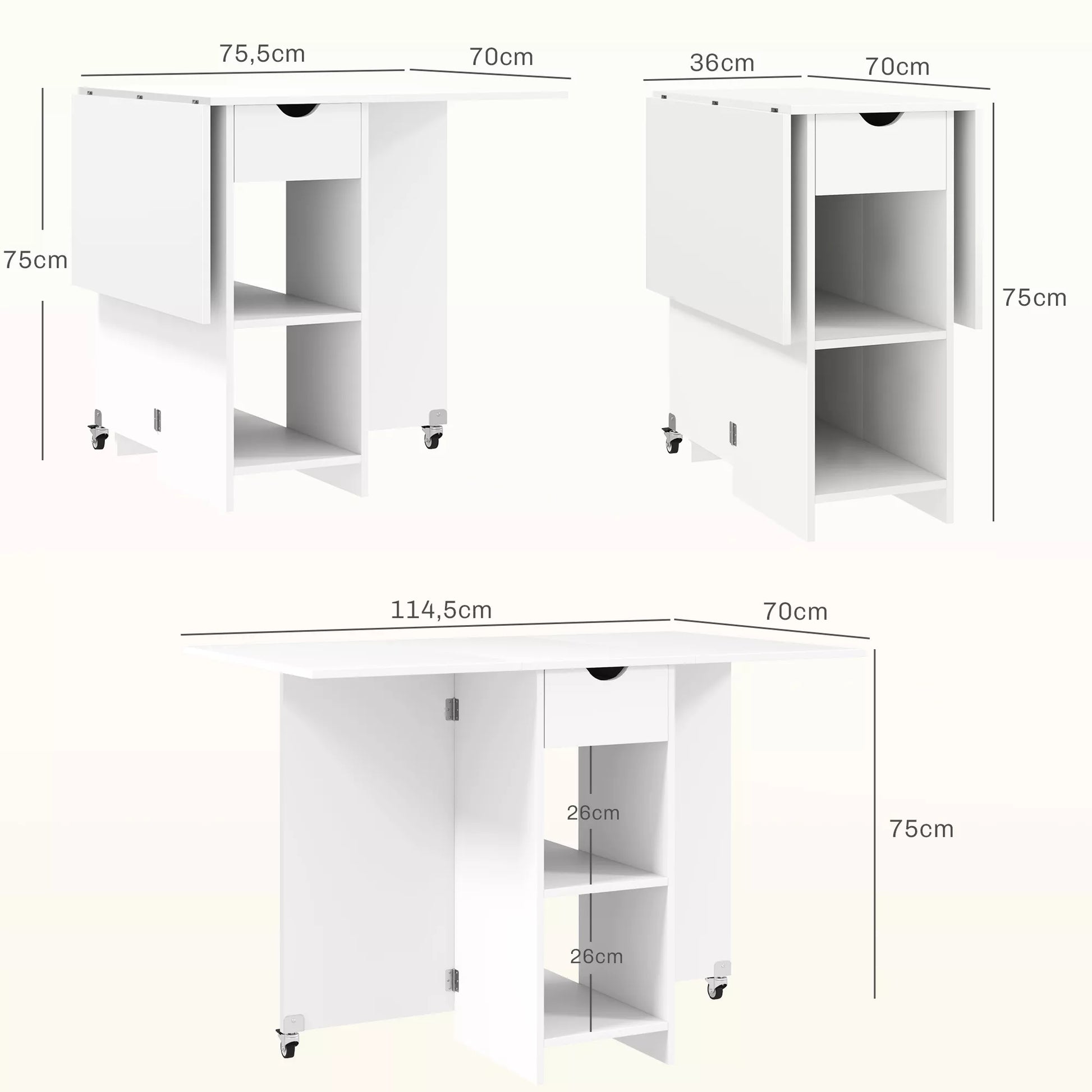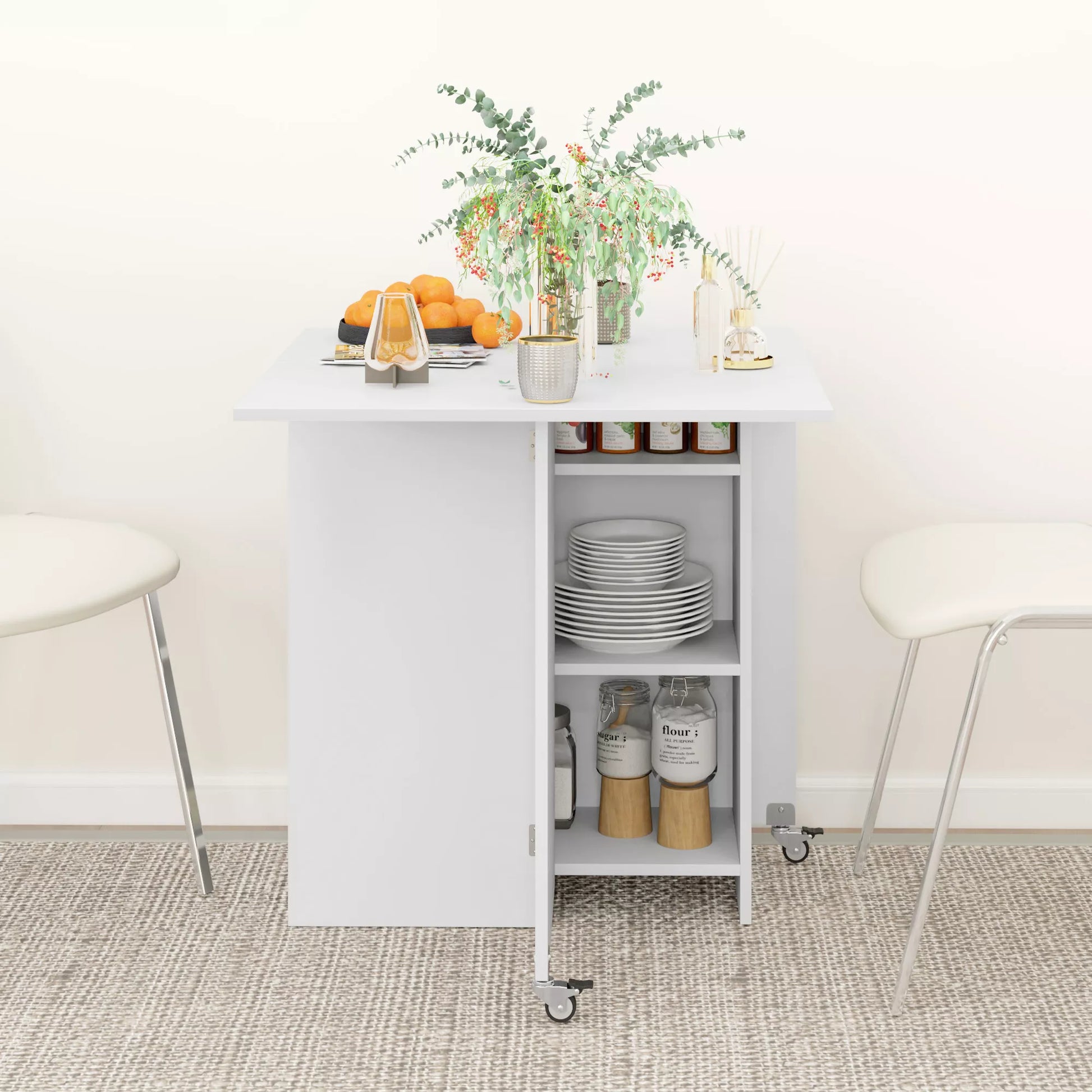 Sulankstomas valgomojo stalas 2-4 asmenims, sulankstomas virtuvės stalas su daiktadėže, prailginamas stalas su ratukais, baltas