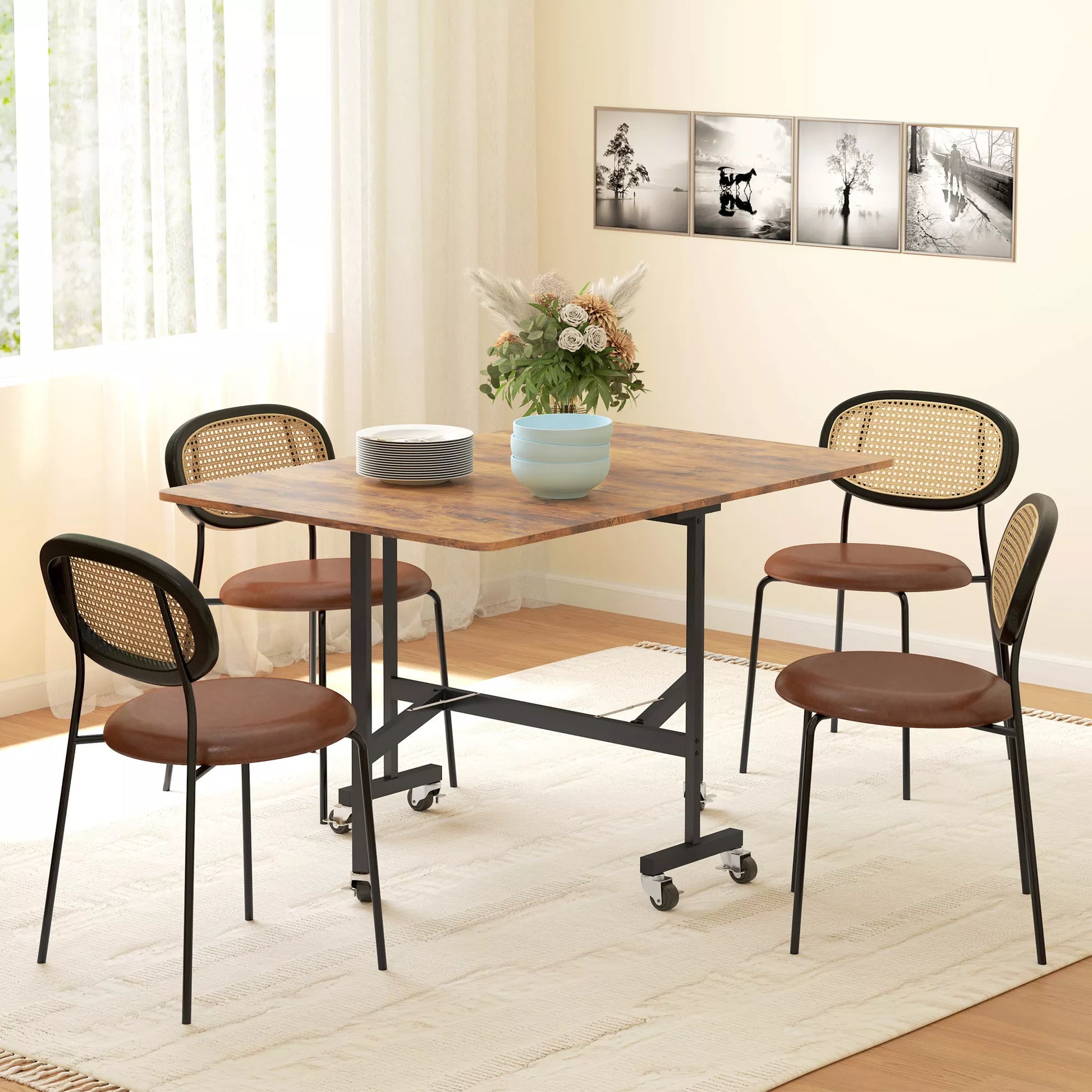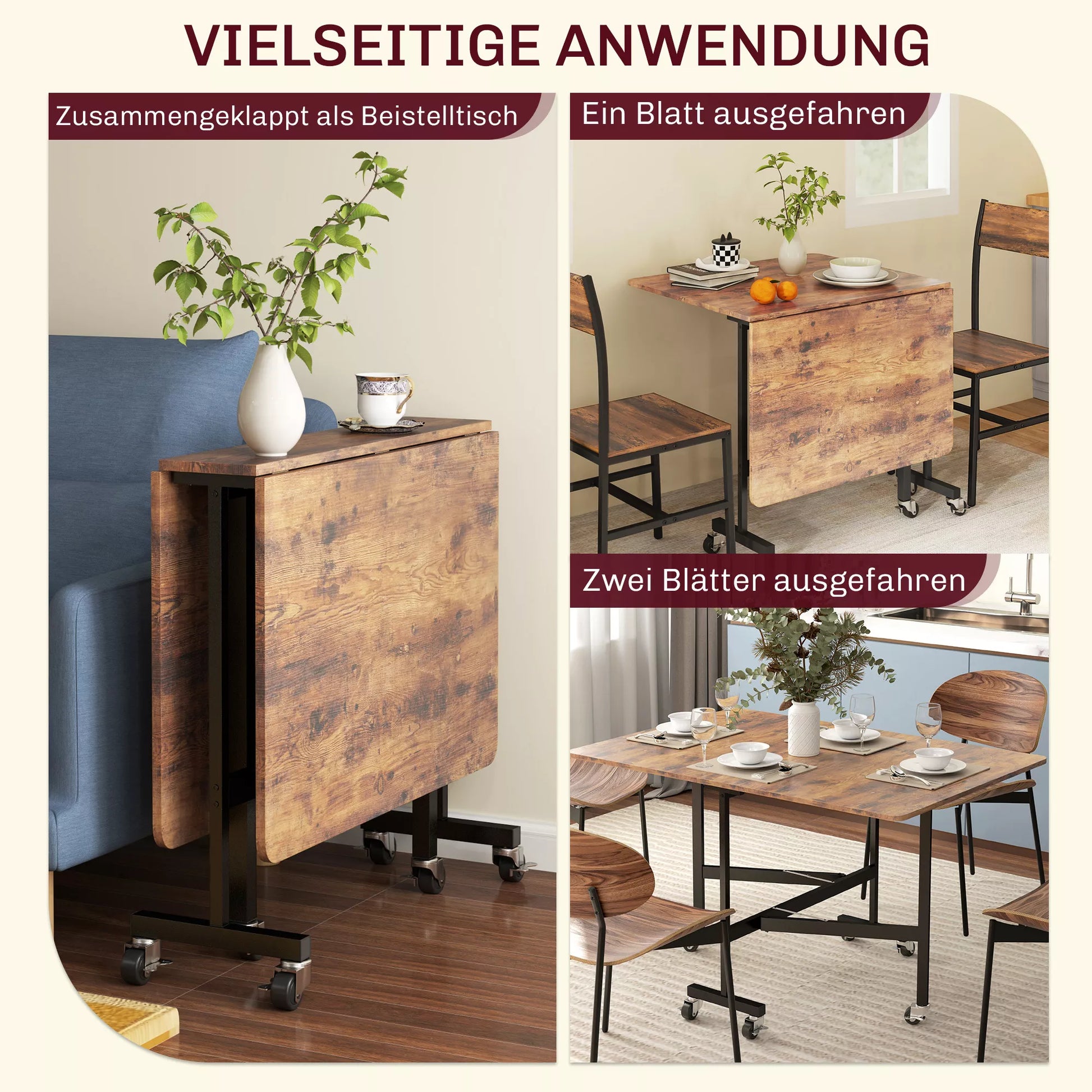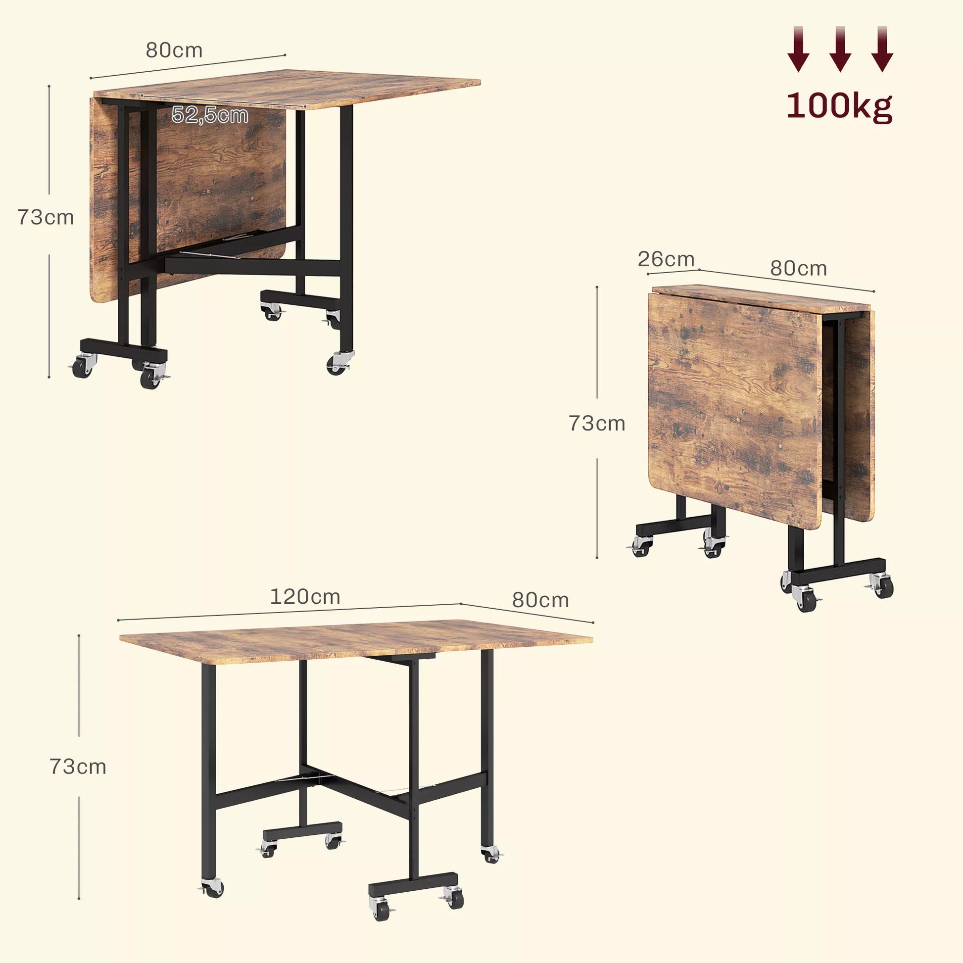Sulankstomas valgomojo stalas, tinkamas iki 6 žmonių, su 6 ratukais ir stabdžiais, skirtas mažoms erdvėms, rudos spalvos.