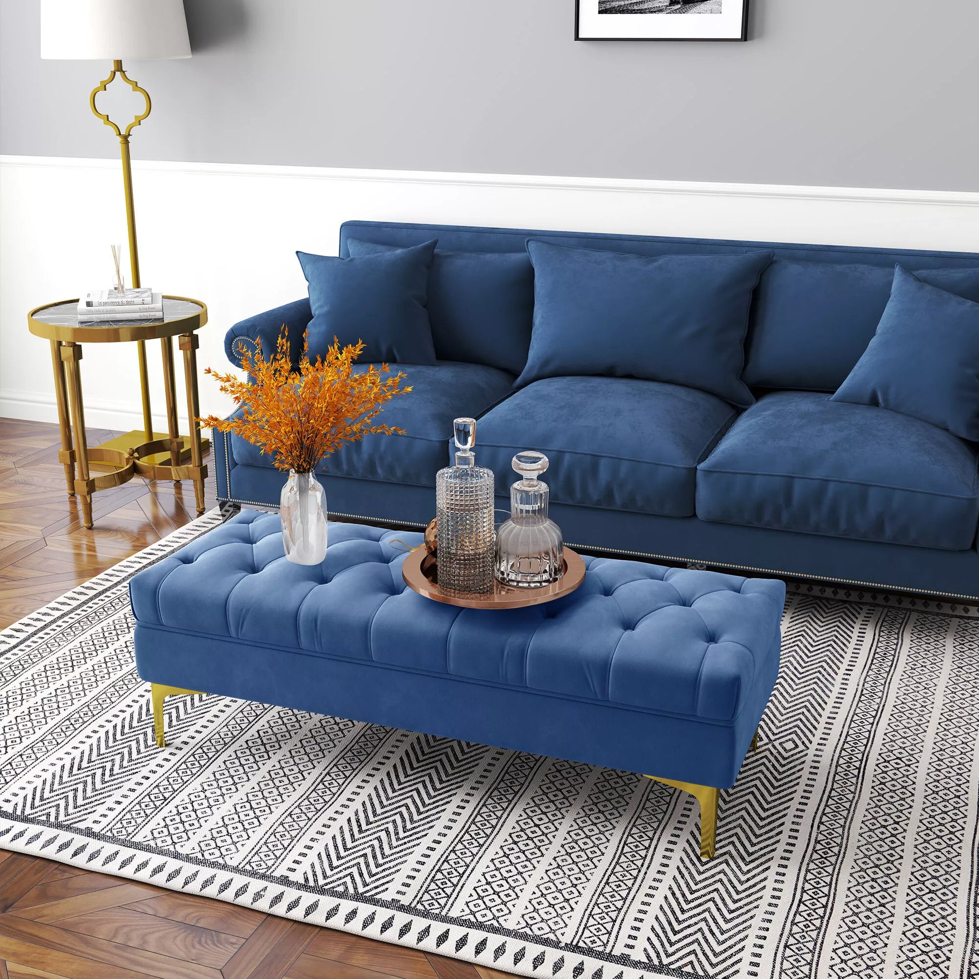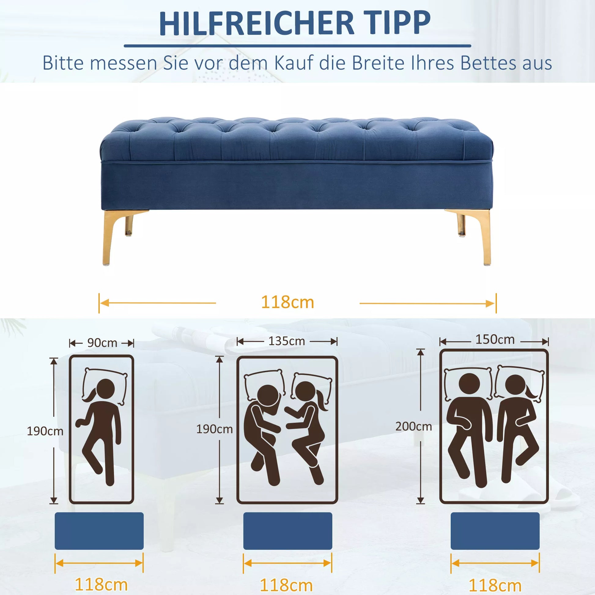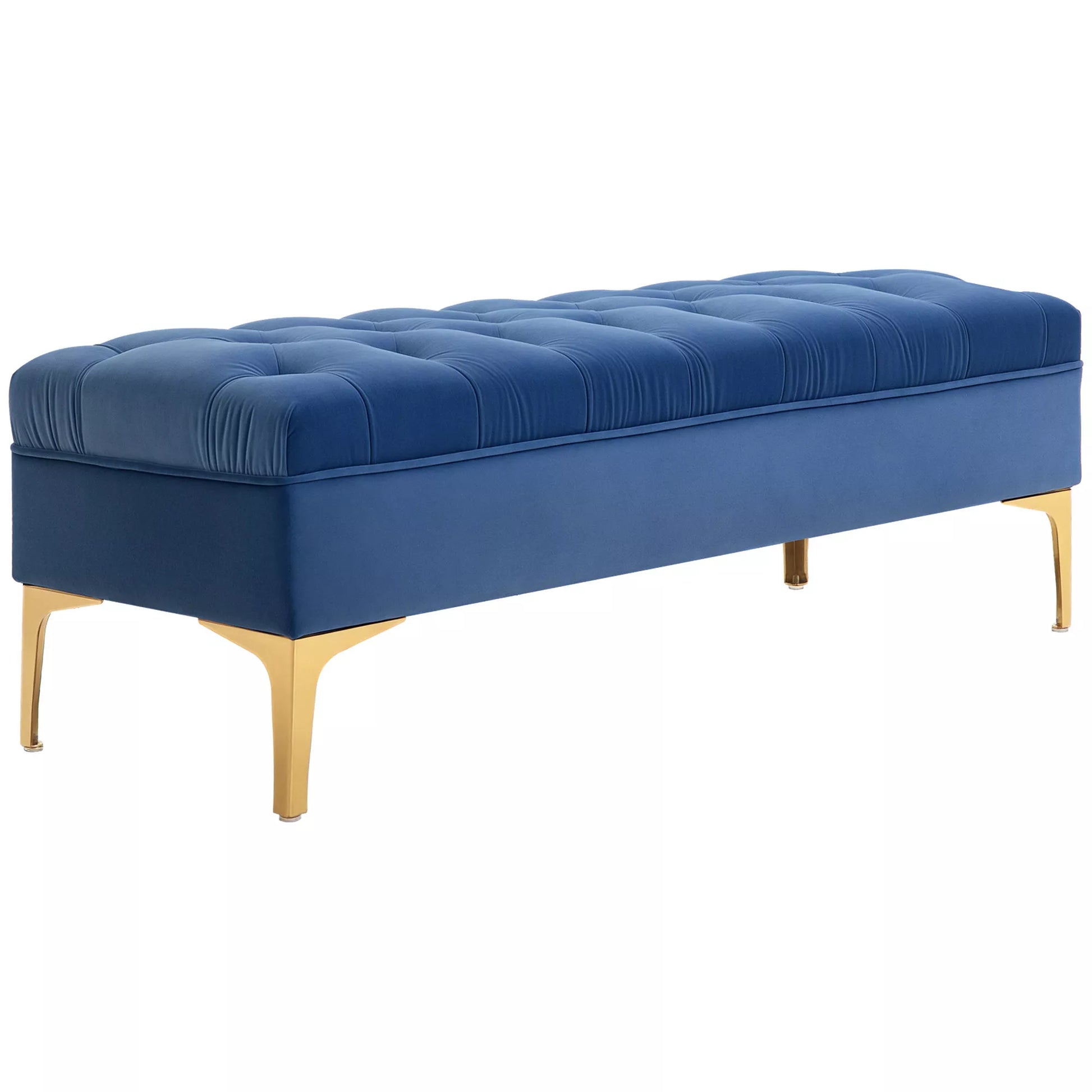 Mėlynas aksominis suolas prie lovos su paaukštintomis kojomis miegamajam