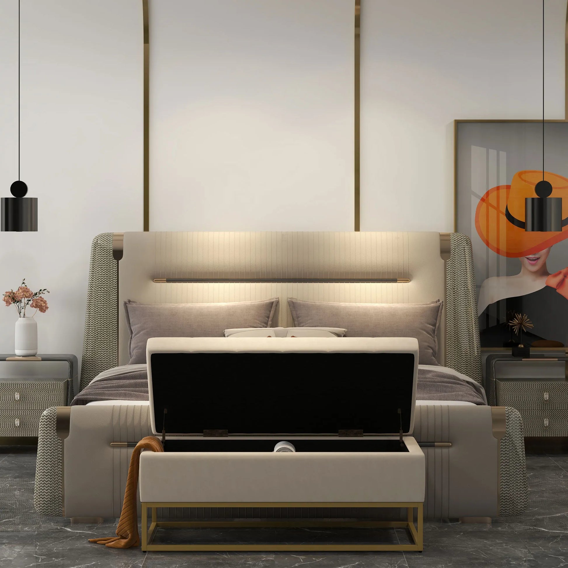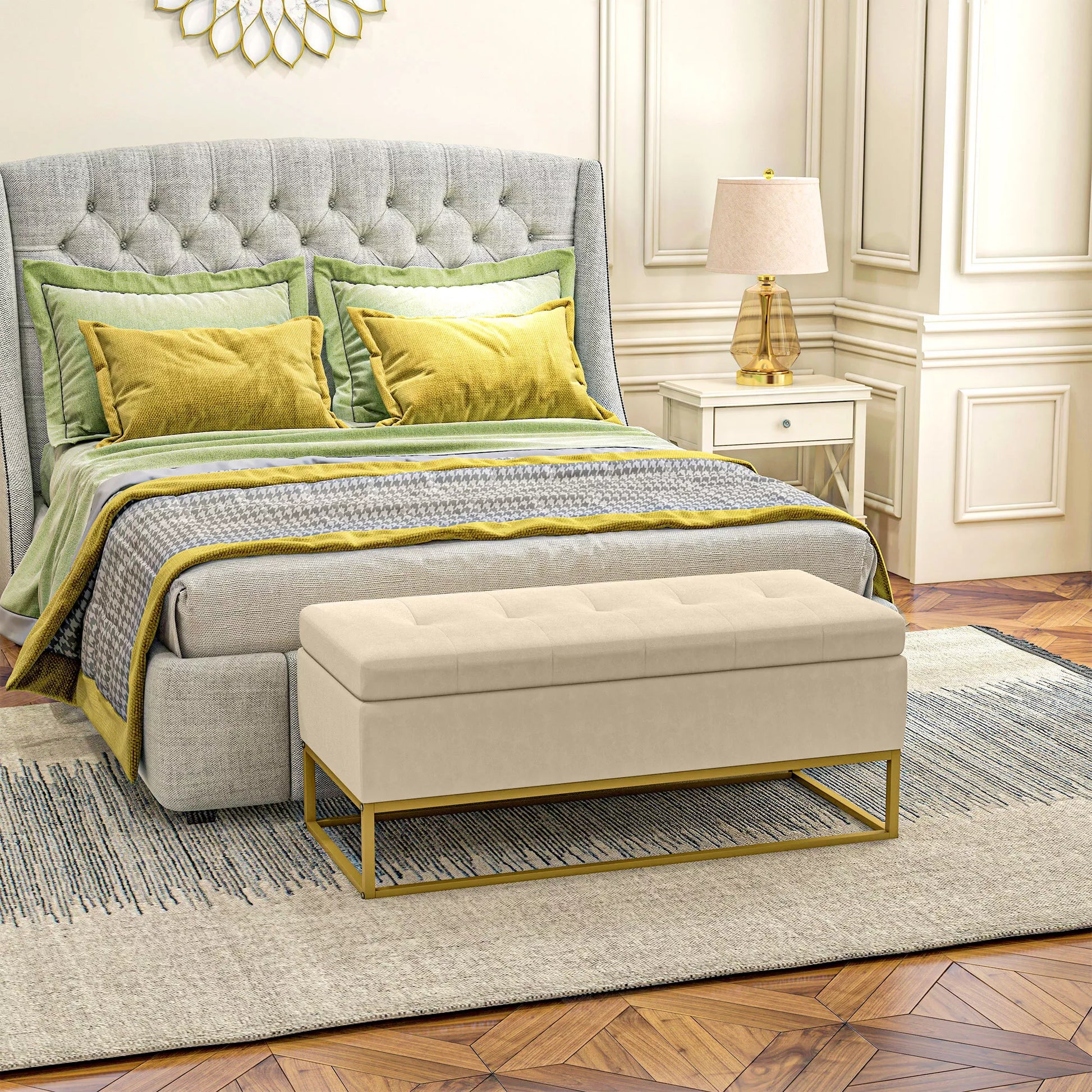 Sėdynė su daiktadėže, dekoratyvinis sagų dygsniavimas, flanelinė išvaizda, aukso spalvos plieninės kojos, 110 x 47 x 46,5 cm