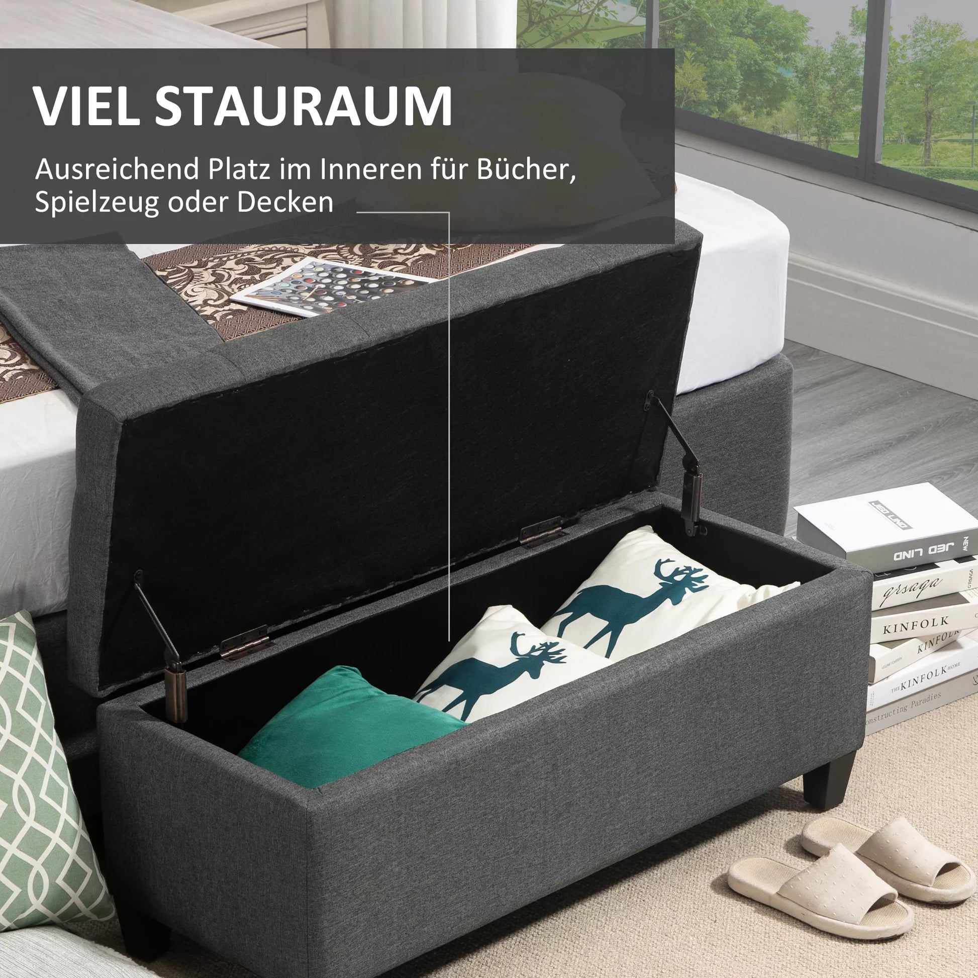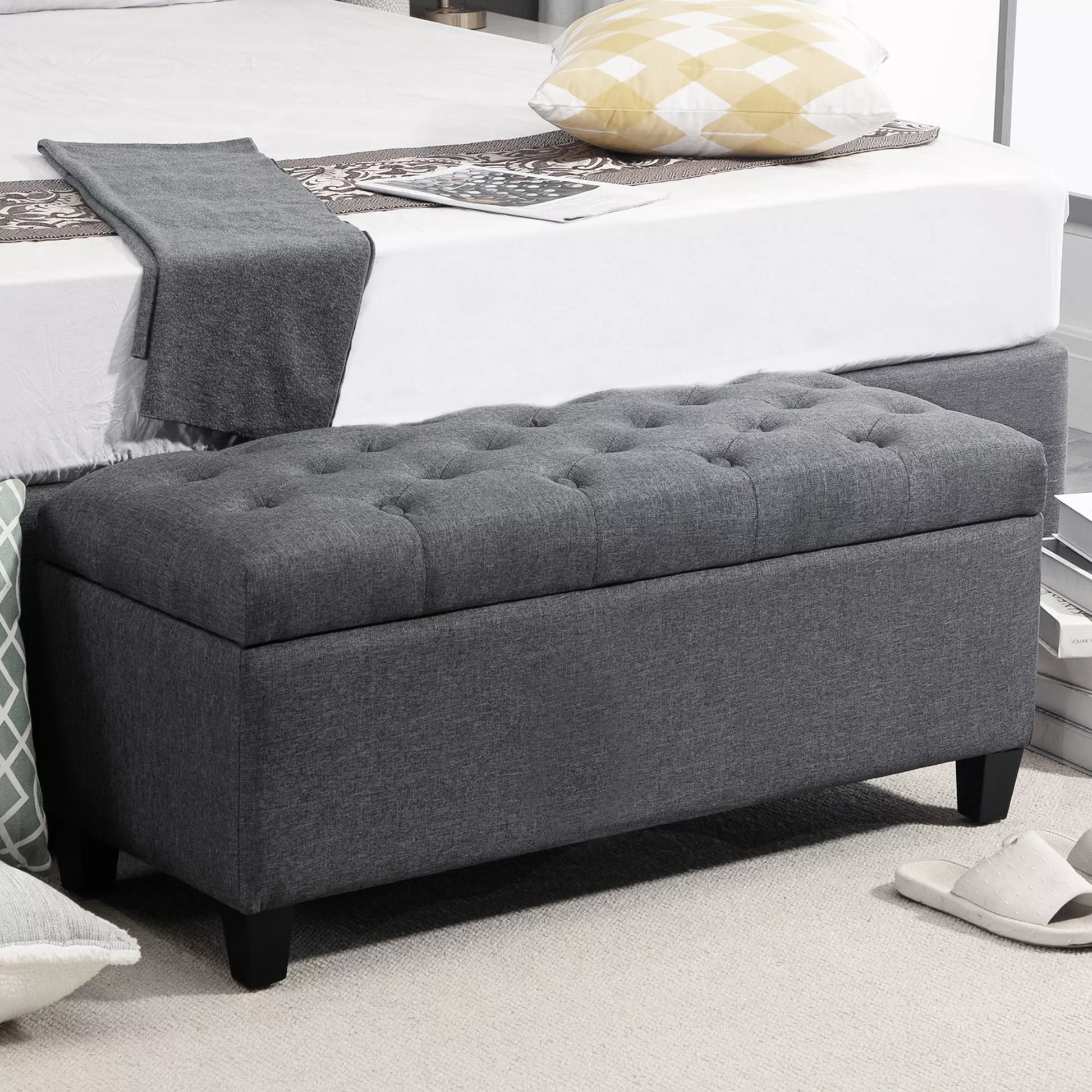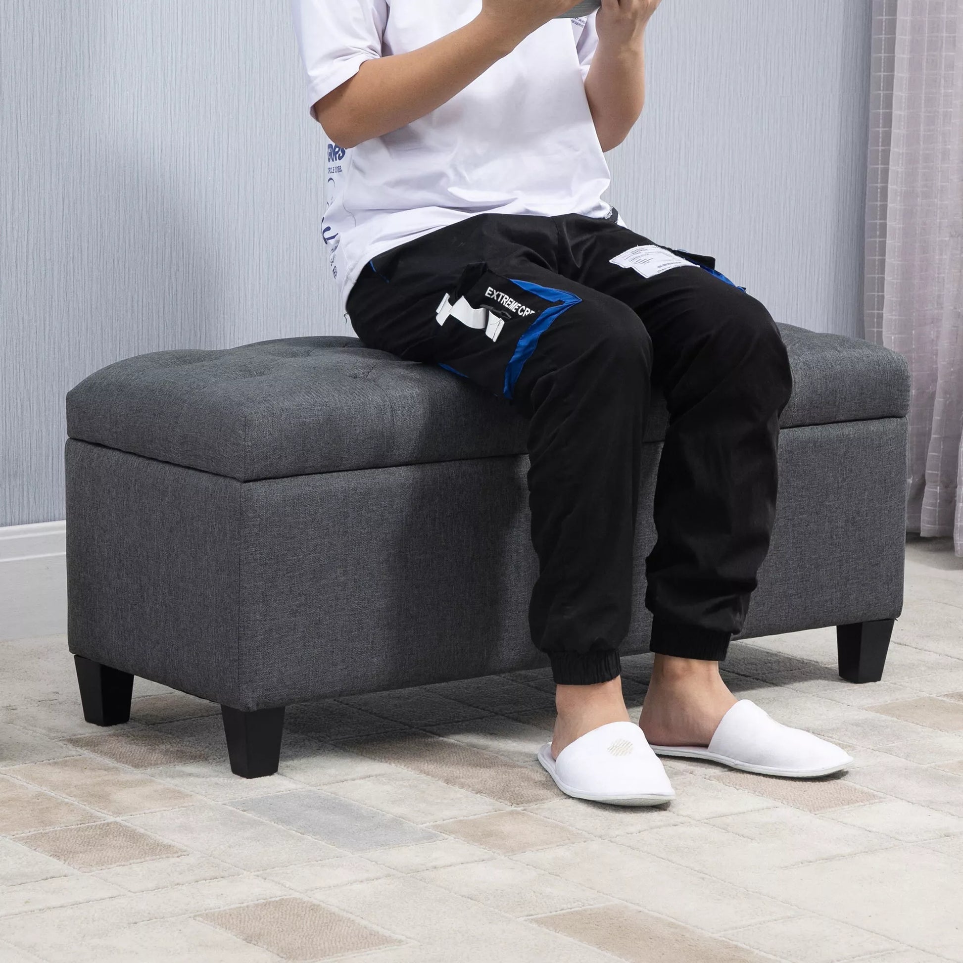 Suolas su laikymo erdve, minkštasuolis su lino išvaizda, laikymo dėžė su medinėmis kojomis, suolas su lova svetainei, miegamajam, koridoriui 100 x 40 x 44 cm Tamsiai pilkas
