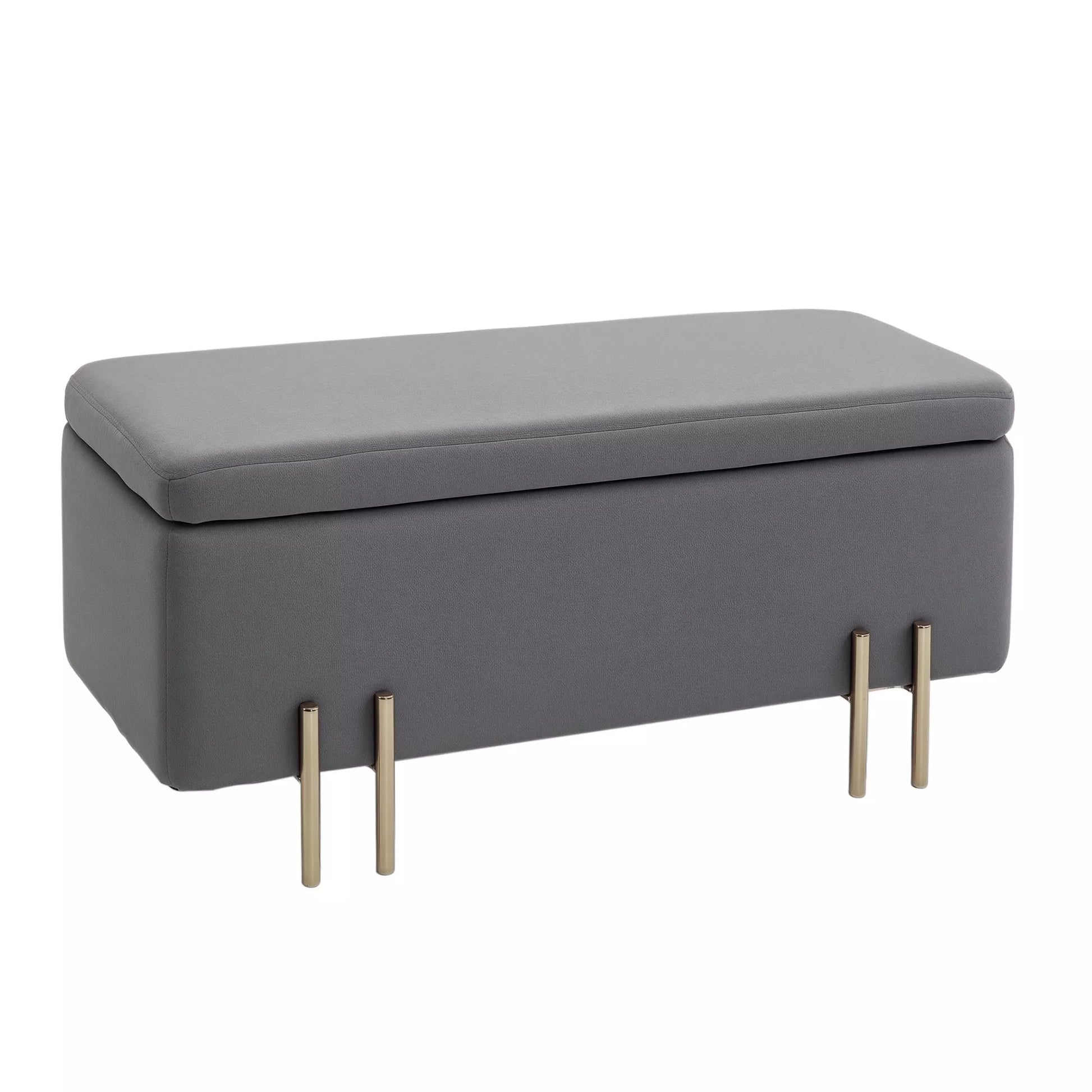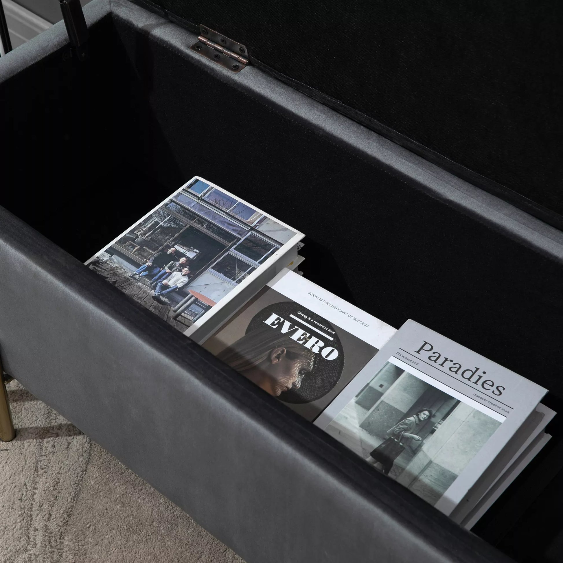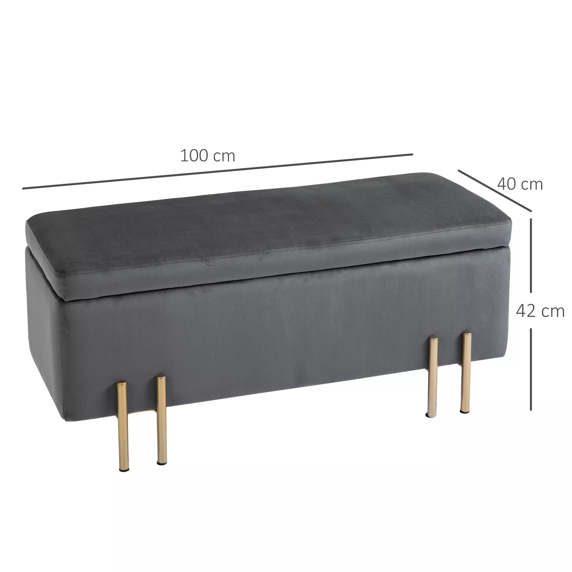 Suolas su daiktadėže, paminkštintas su aksomo išvaizda, sėdimoji skrynia su metalinėmis kojomis, skrynios formos suolas svetainei, miegamajam, koridoriui, 100 x 40 x 42 cm, tamsiai pilkas