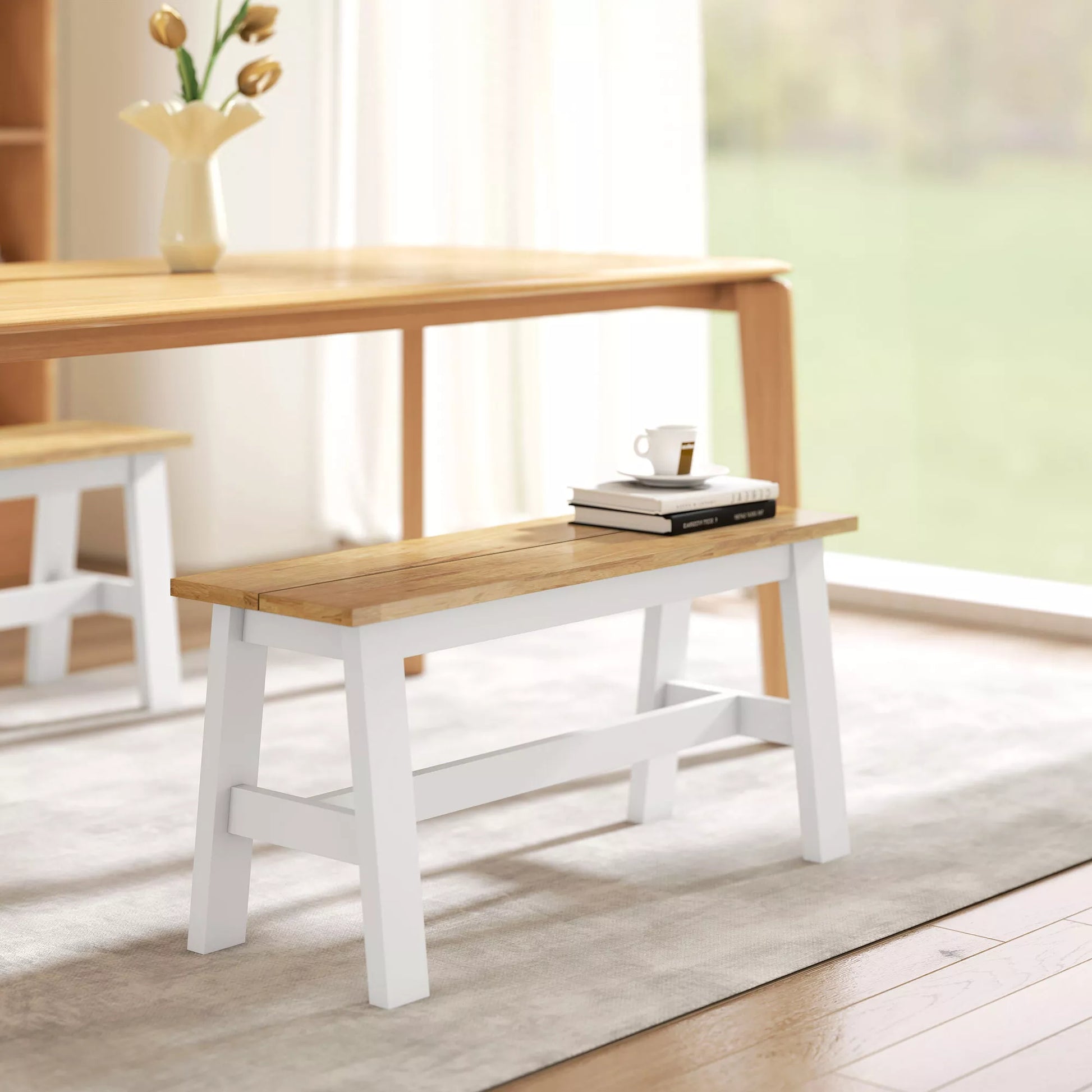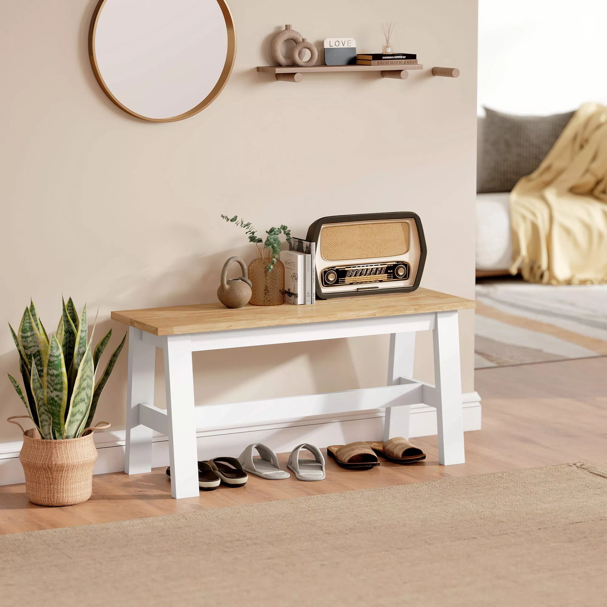 Suolas 2 vietoms, medinis suolas ąžuolo išvaizdos, su stabilizuojančia skersine atrama, skirtas svetainei, valgomajam, koridoriui, pagamintas iš kaučiukmedžio, baltos spalvos