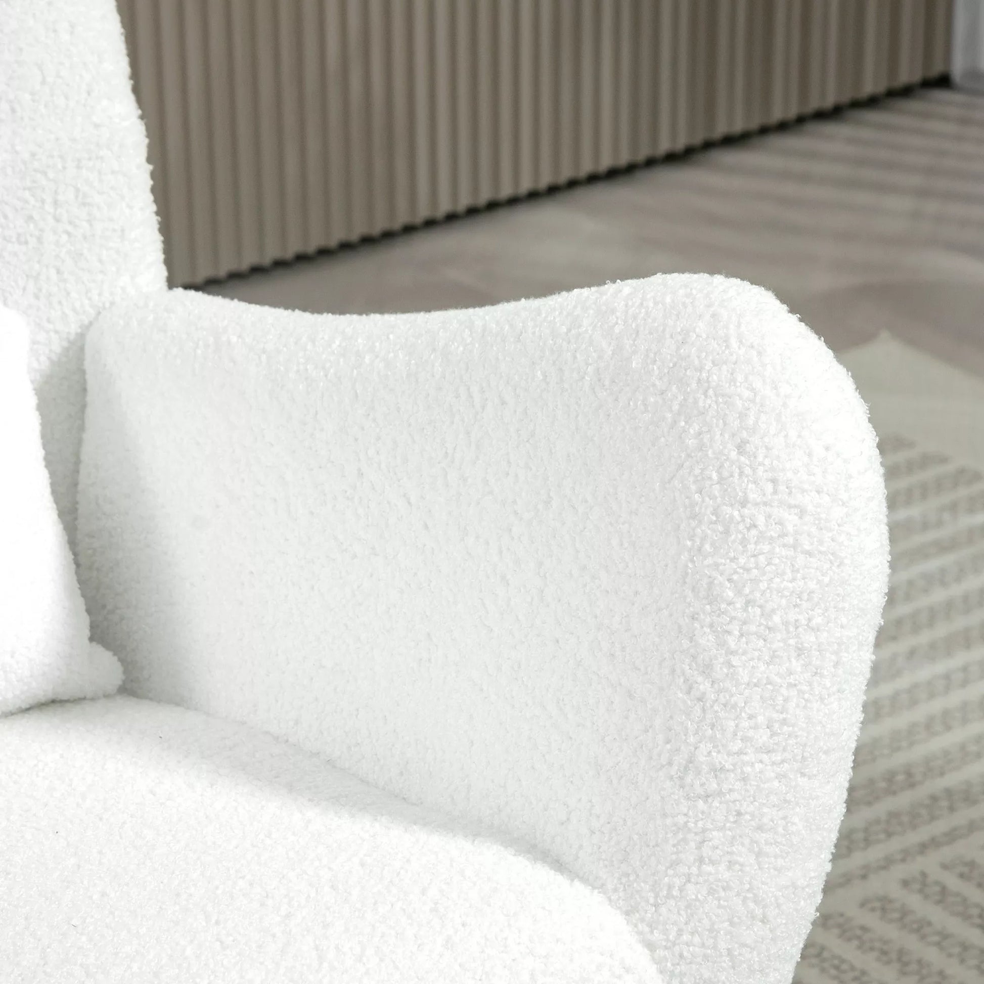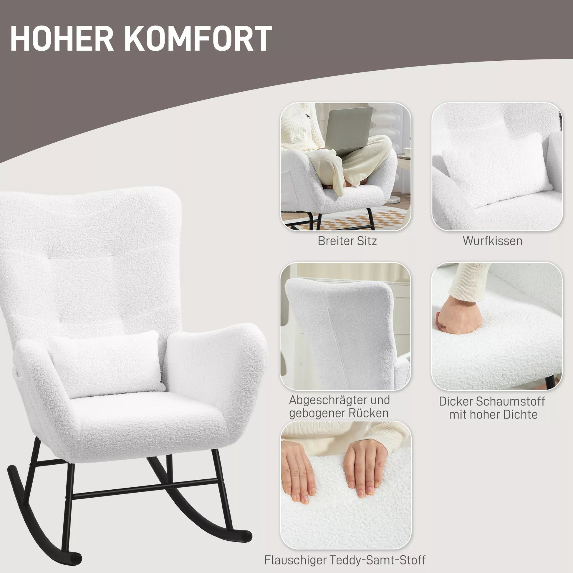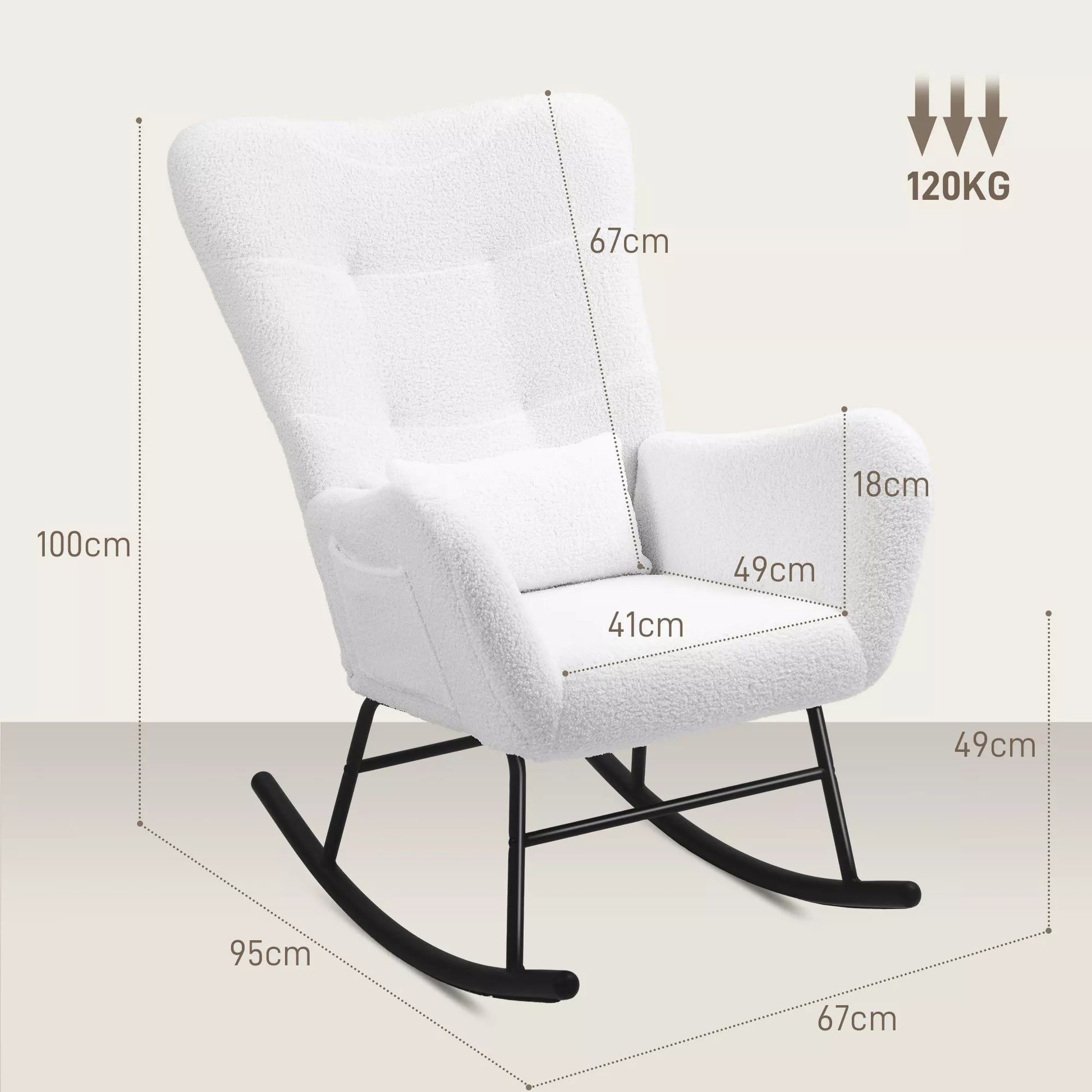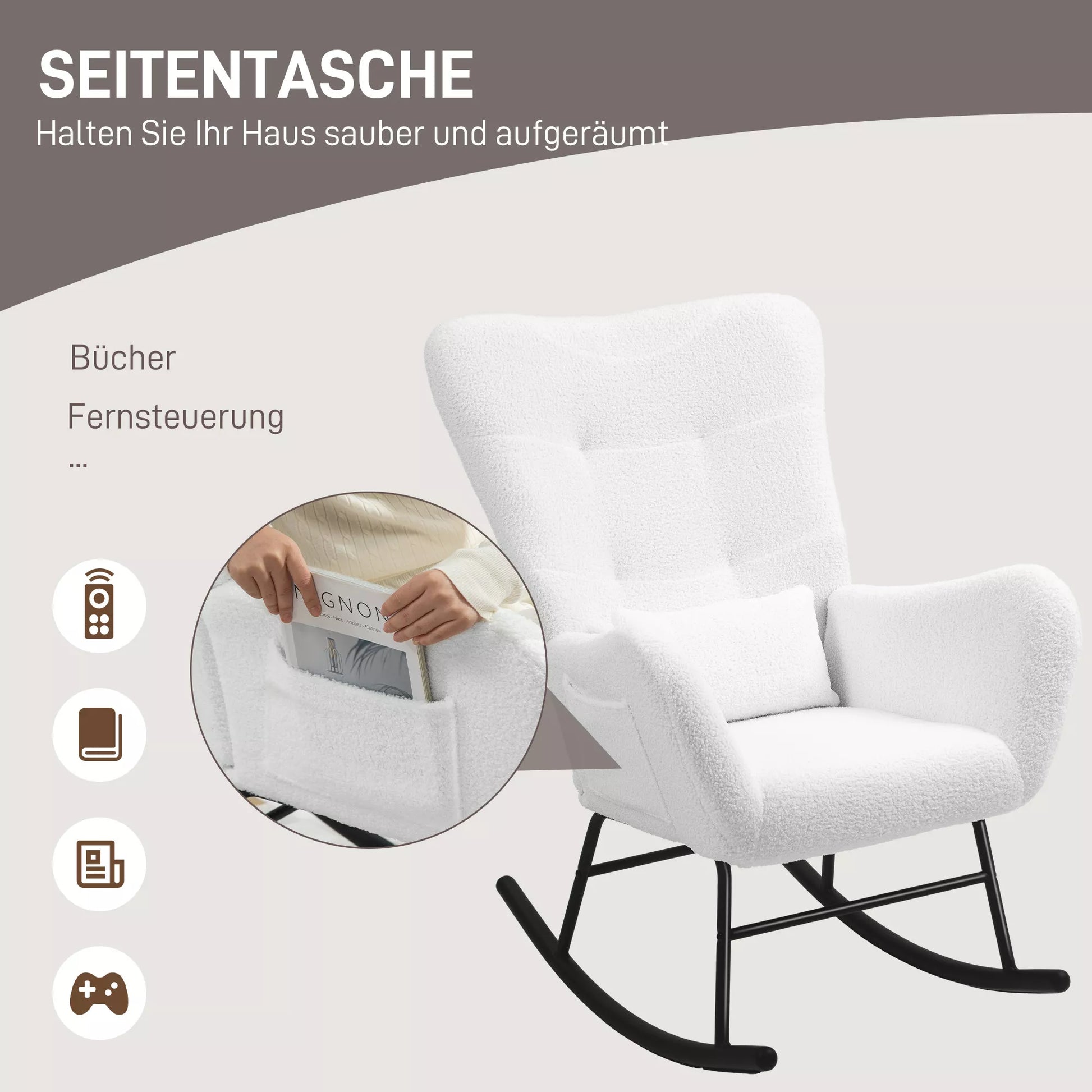 Mėgaukitės dangišku komfortu su supamąja kėde. Supkitės nuo 90° iki 115°, kad rastumėte tobulą padėtį. Minkštas teddy audinio užvalkalas, pagalvėlė ir tankiu putplasčiu paminkštinta atlošas užtikrina idealų poilsį, remiamą tvirto metalinio rėmo. Praktiška šoninė kišenė leidžia laikyti knygas ar nuotolinio valdymo pultelį, palaikydama tvarkingą aplinką. Idealiai tinka kaip atsitiktinė sėdimoji vieta ir funkcionali supamoji kėdė suaugusiems.
