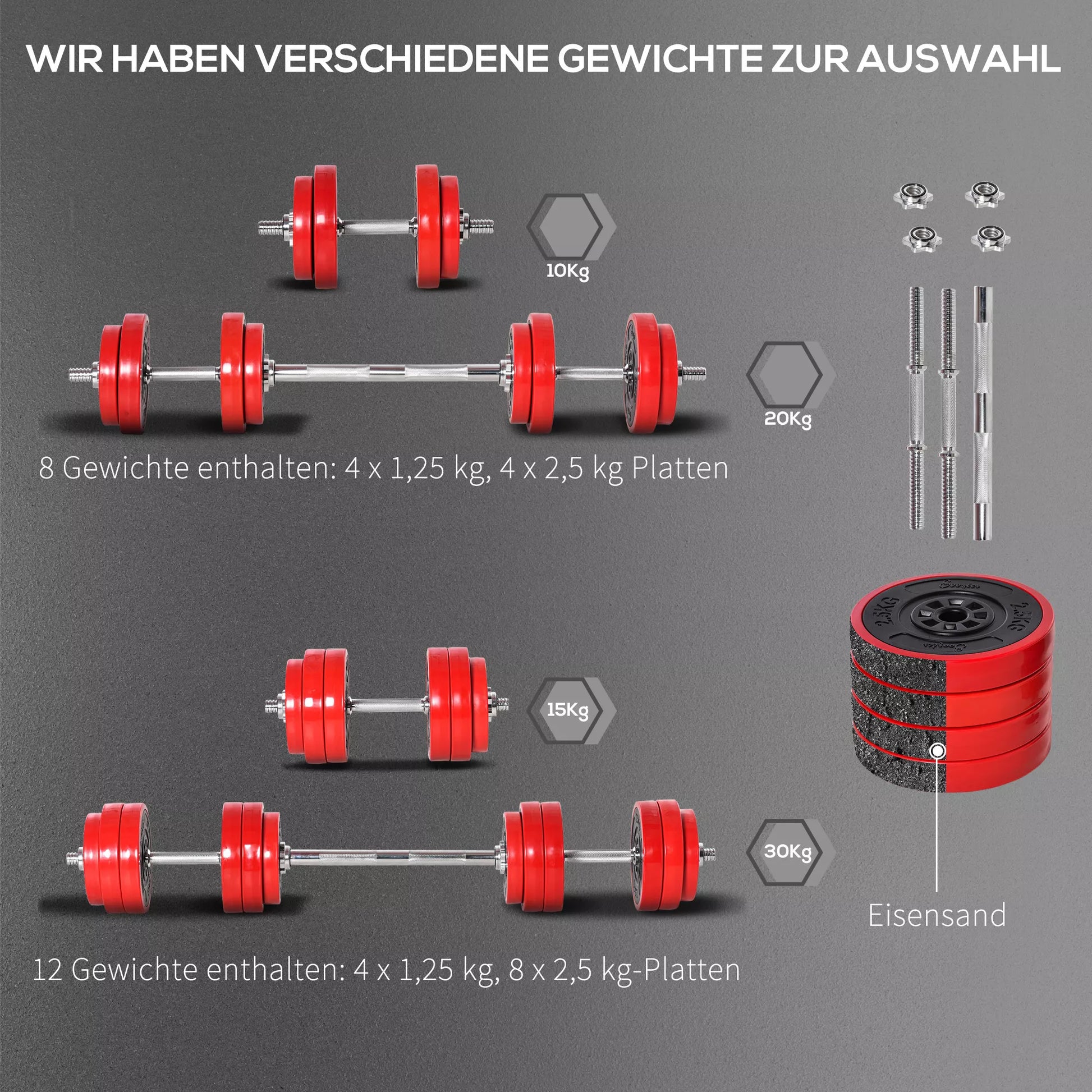 Hantelių rinkinys 20/30KG, 2-IN-1 hanteliai ir štanga, reguliuojami svoriai namų treniruotėms, raumenims, raudona+juoda, 21,5 x 21,5 x 3,8 cm