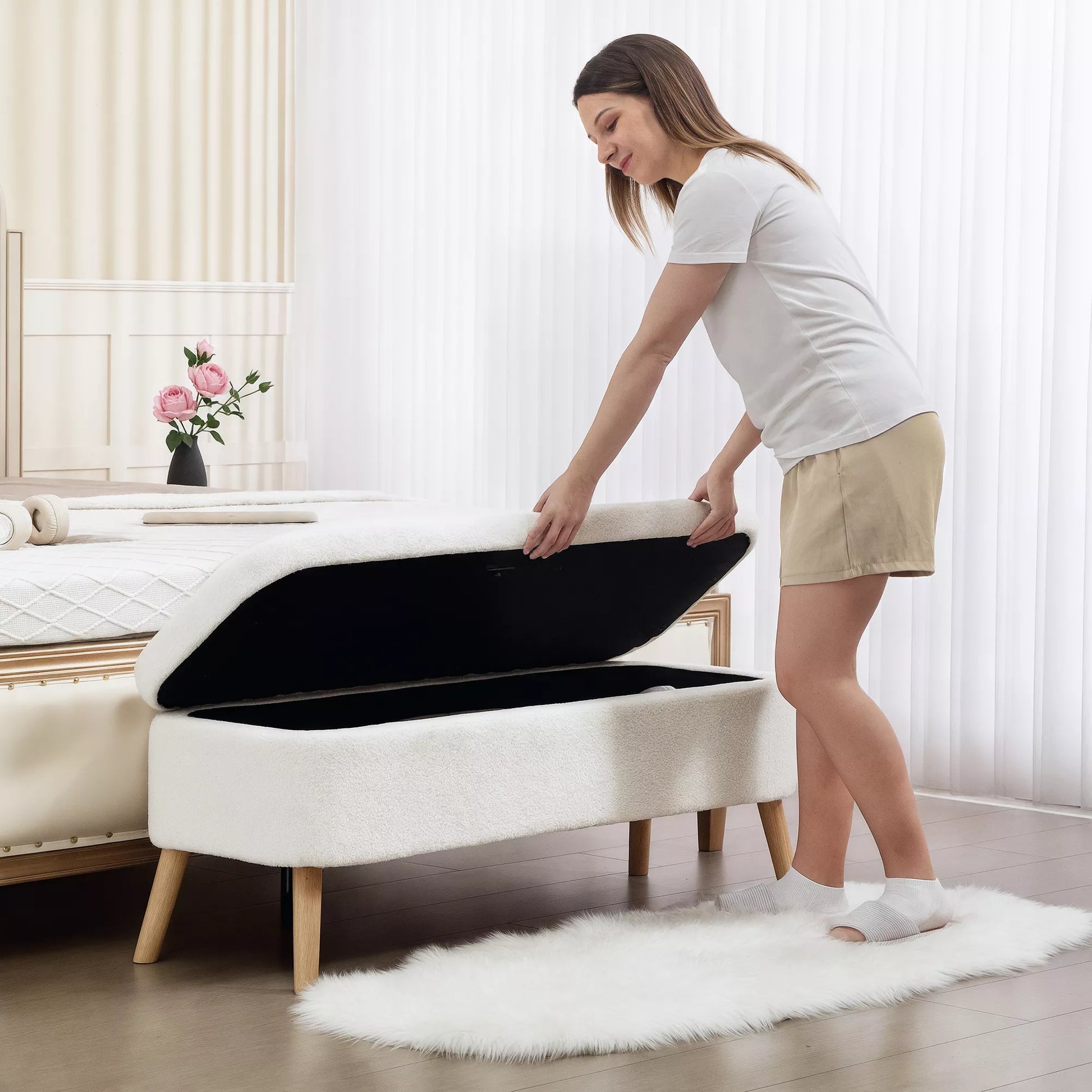 Sandeliukų suolas, sėdimoji suolas su 65 l talpa, Teddy Fleece audinys, kaučiuko mediena, 120 x 42 x 45 cm, kreminės baltos spalvos