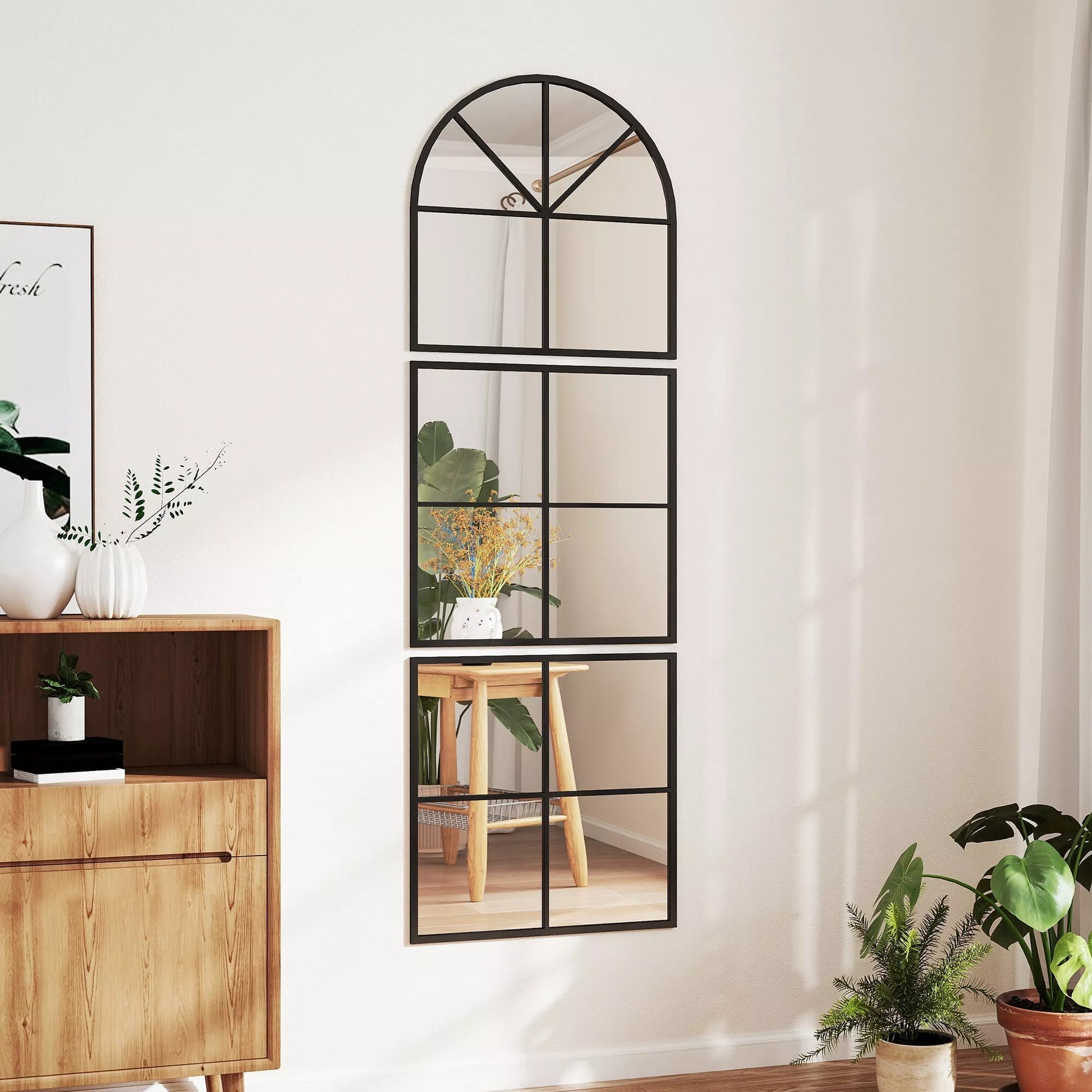 Stilingai atnaujinkite savo namus su šiuo sieniniu veidrodžiu. Šis veidrodis su patraukliu lanku viršuje ir grindis siekiančiu elegantiškos juodos spalvos lango dizainu lengvai papuoš bet kokią erdvę, ar tai būtų svetainė, ar koridorius. Šio koridoriaus veidrodžio suskaidytas dizainas leidžia lanksčiai jį statyti ir suteikia rafinuotumo bet kuriam kampui. Komplekte yra suformuotas kabliukas, palengvinantis montavimą!