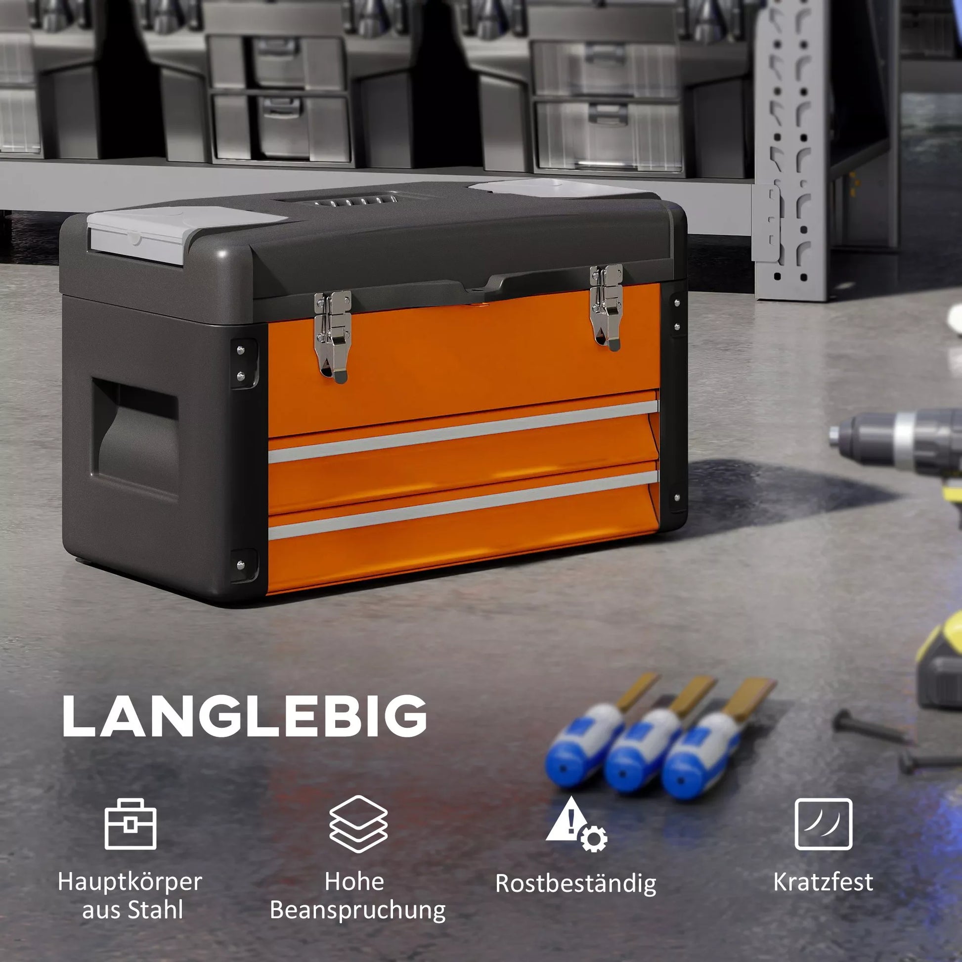 Tuščia įrankių dėžė, 49,7 x 25,3 x 28,9 cm Įrankių dėžė su stalčiumi, mini dėžutė plieninė oranžinė