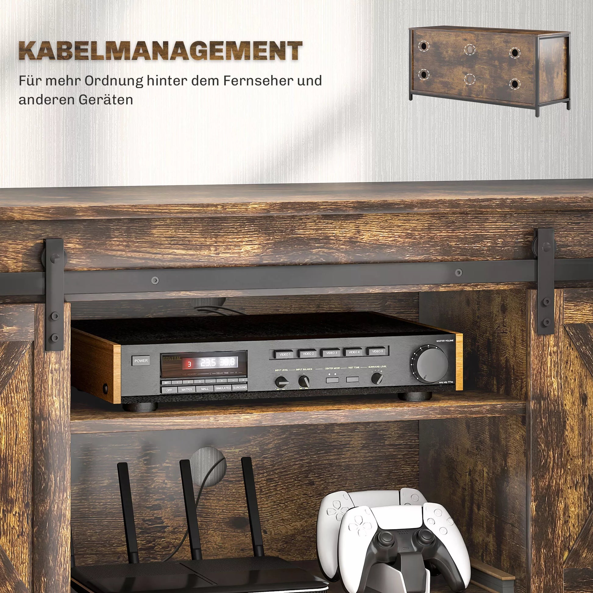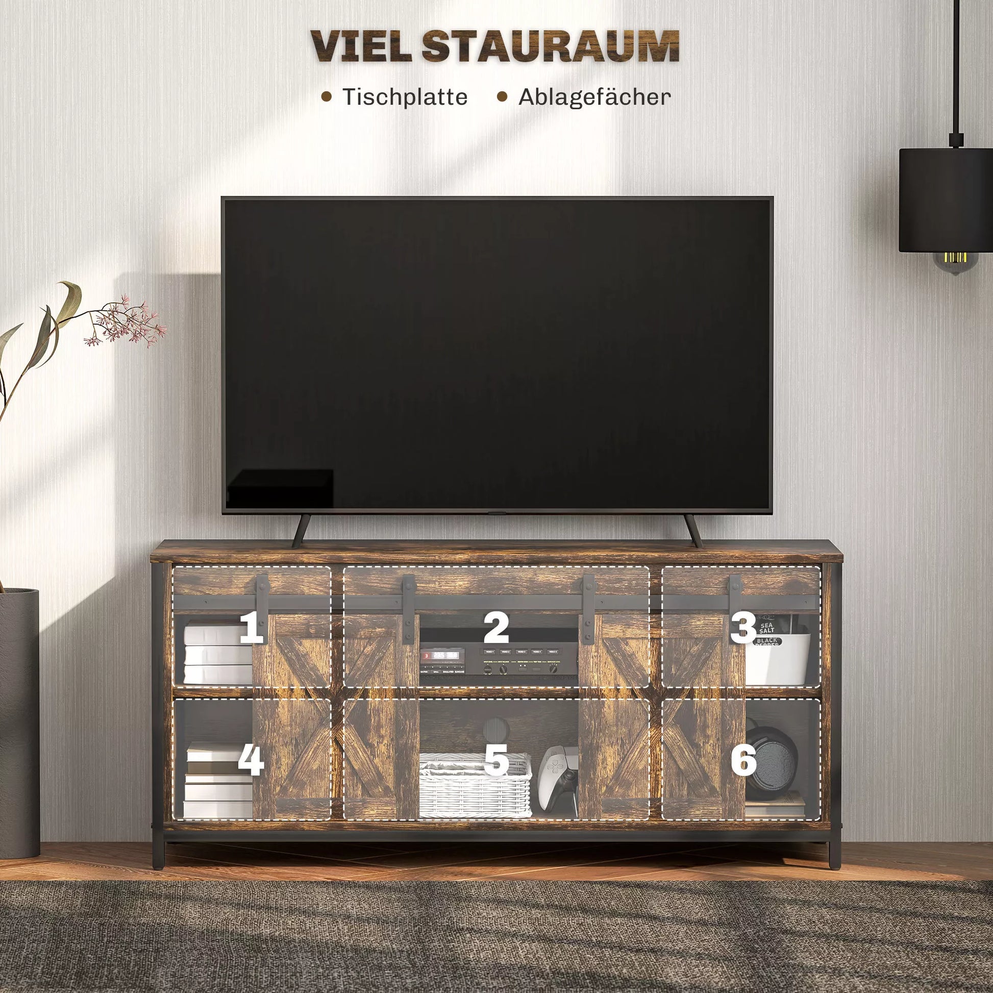 TV staliukas, pramoninio dizaino, skirta 60 colių televizoriams, 6 skyriai, 2 stumdomosios durys, ruda/juoda